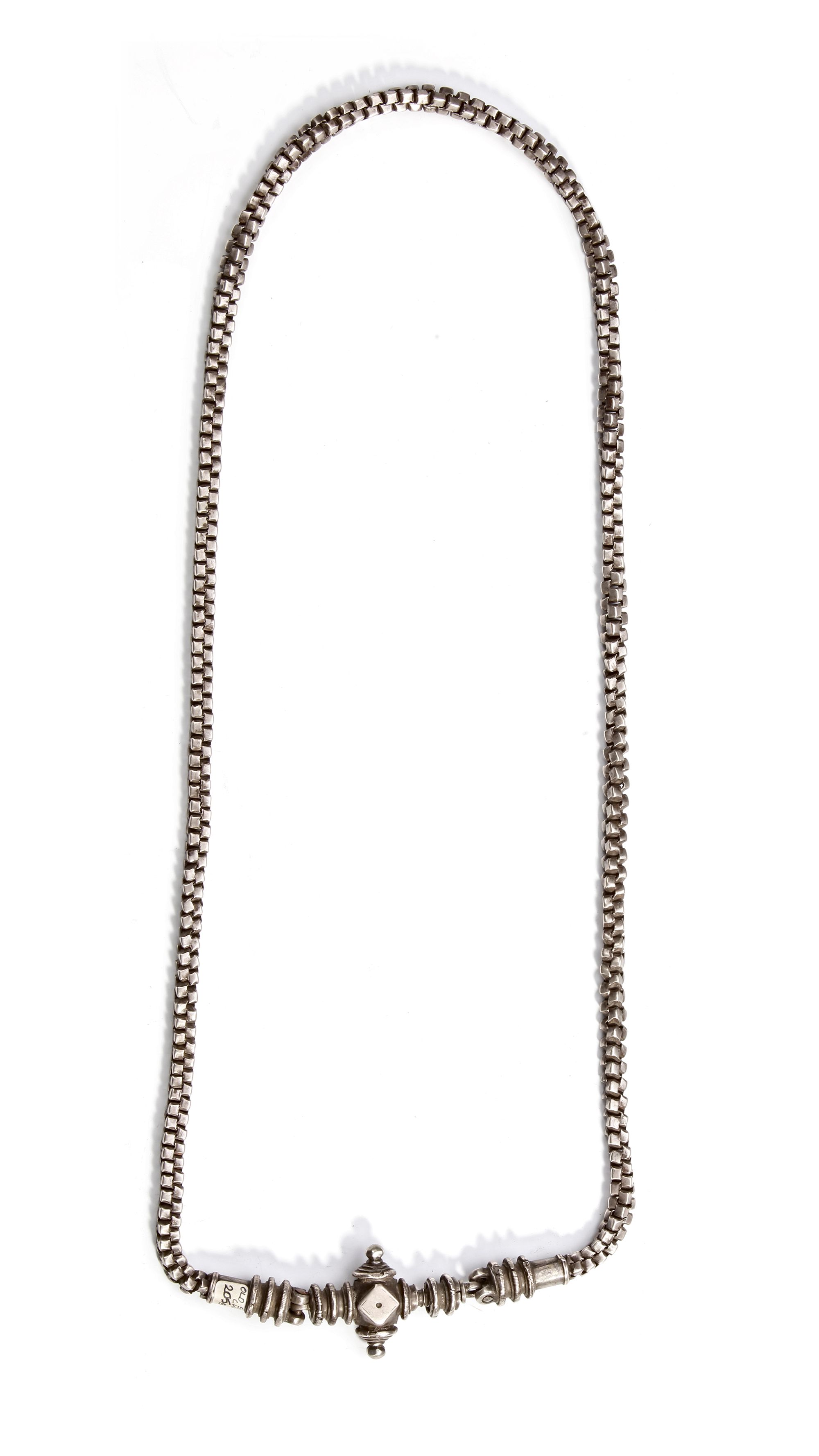 A finely crafted 19th-century Nepalese silver necklace featuring a bold geometric central pendant and detailed cylindrical elements. The sturdy chain links highlight traditional design.