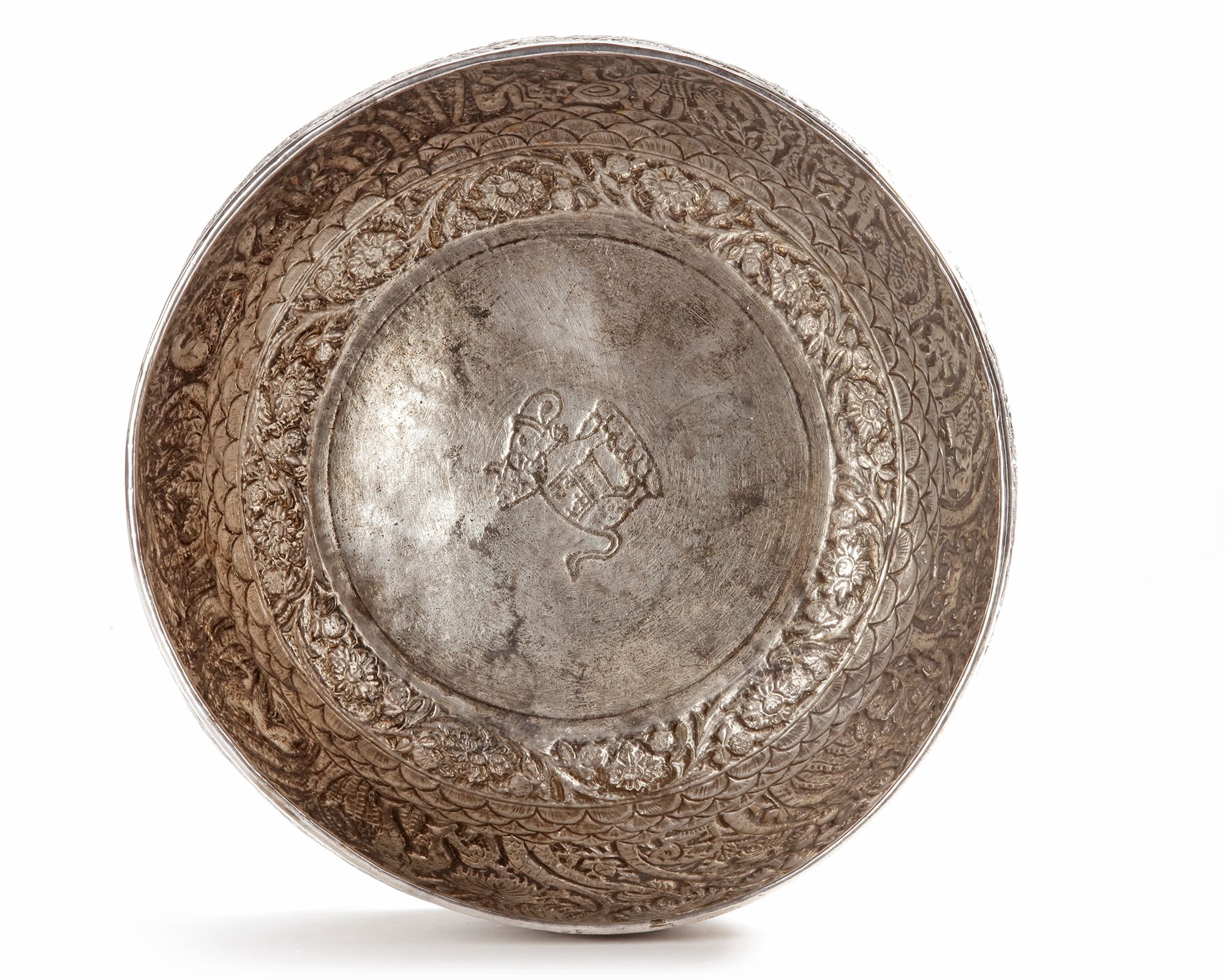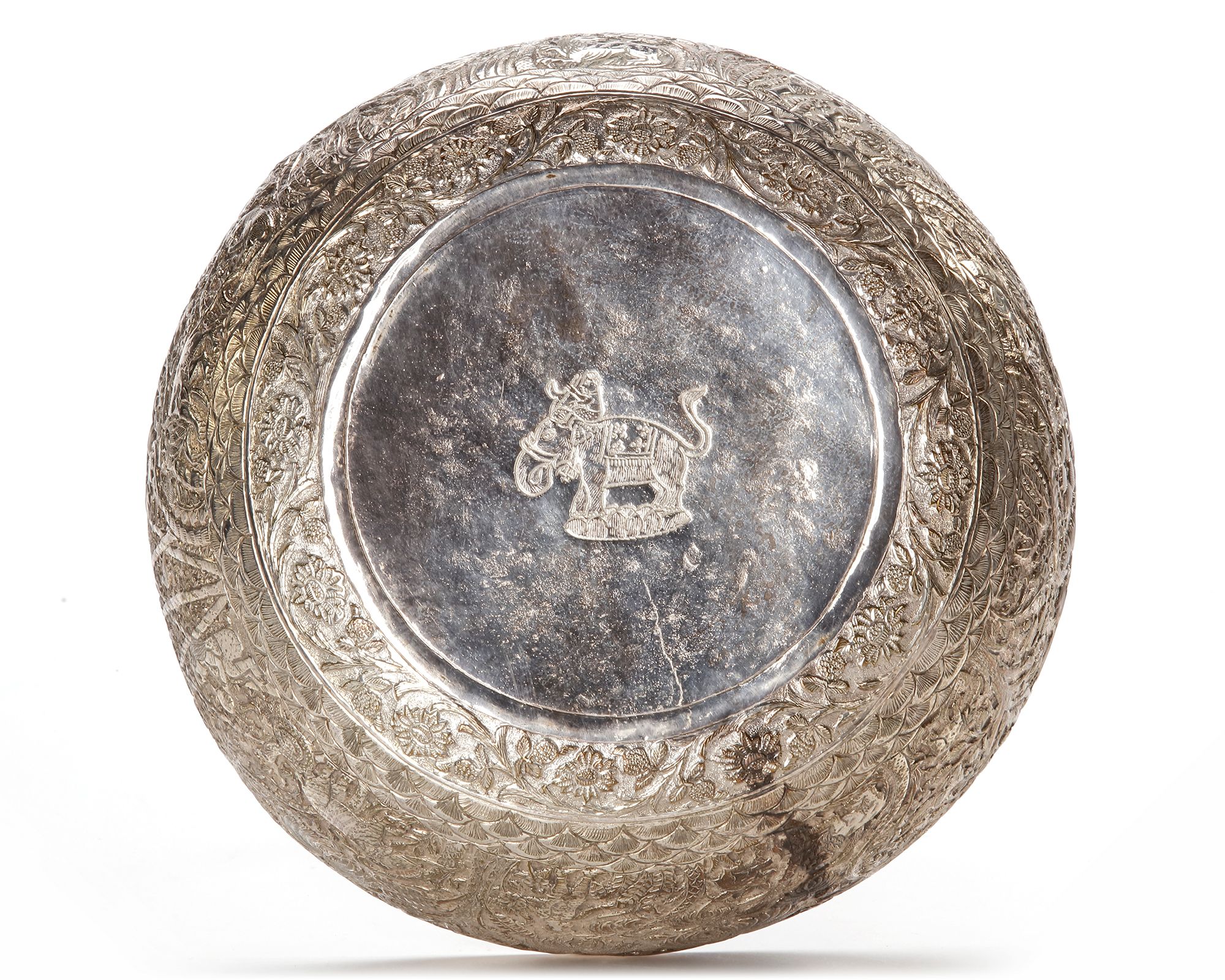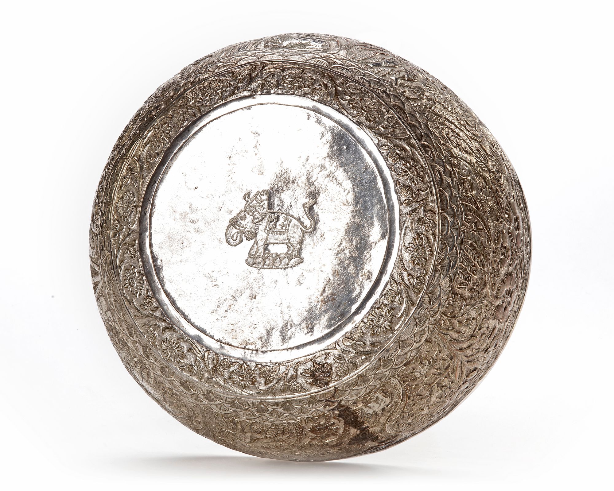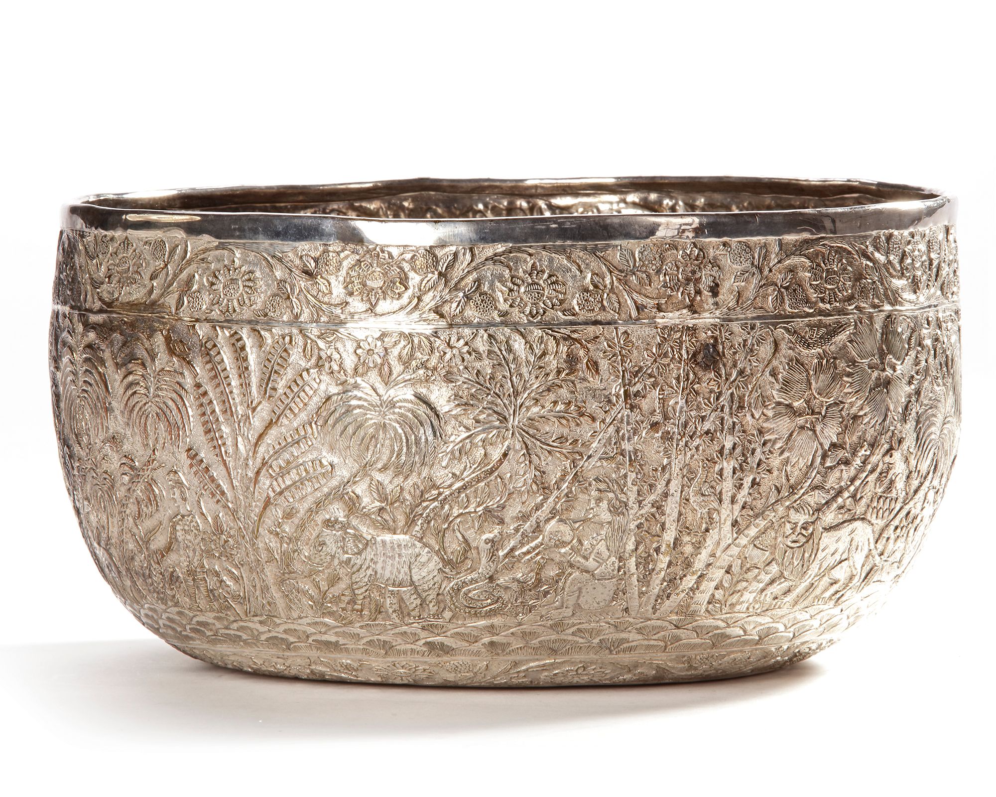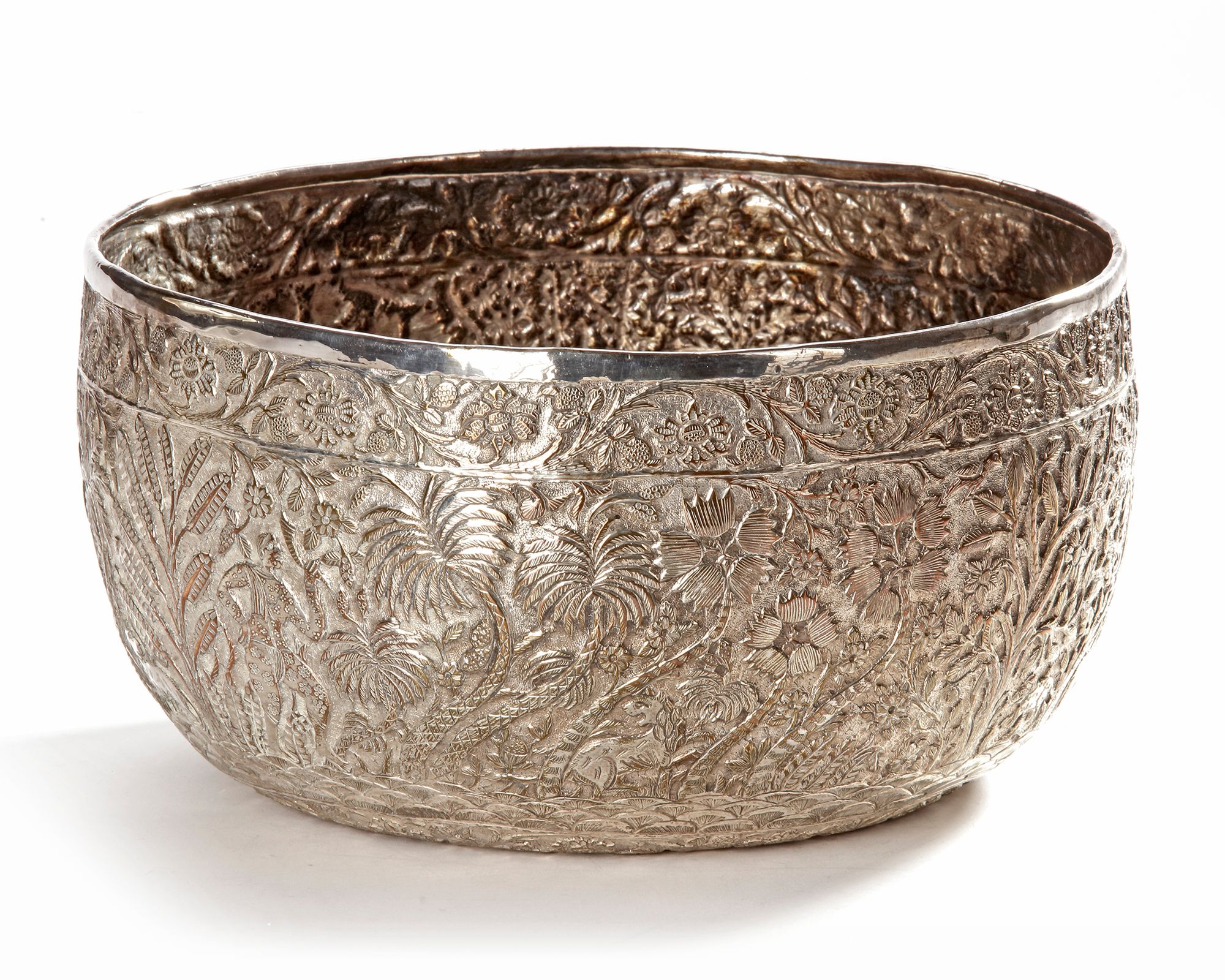 A richly decorated with intricate repoussé designs of floral motifs, animals, and figures set in lush landscapes. The interior and base feature central emblems, reflecting ceremonial and cultural significance.