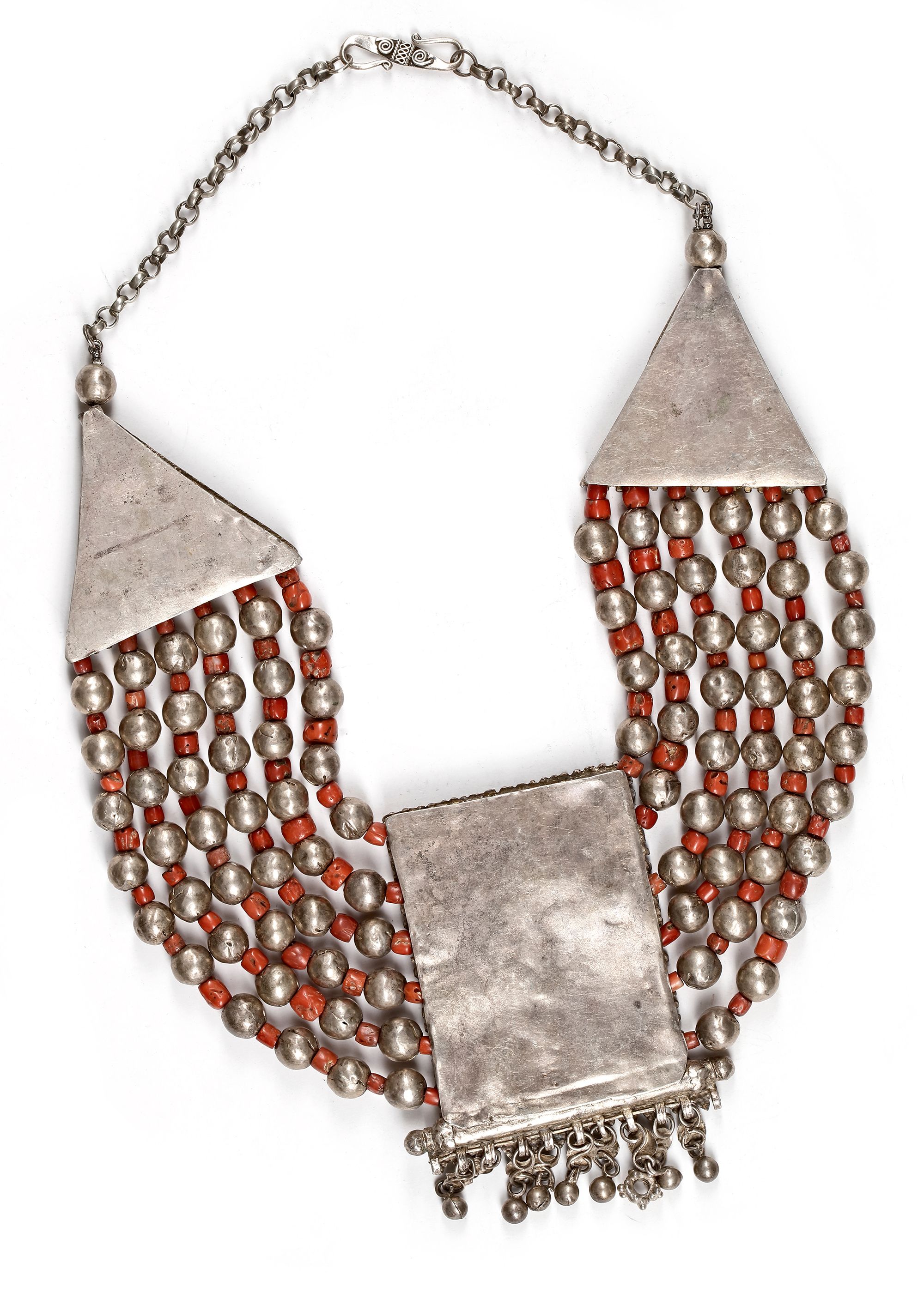 An impressive 19th-century Yemeni Islamic necklace, composed of multiple strands of silver beads interspaced with natural coral The piece features ornate triangular silver plaques and a central rectangular pendant richly decorated with intricate filigree and granulation, finished with small dangling bells.