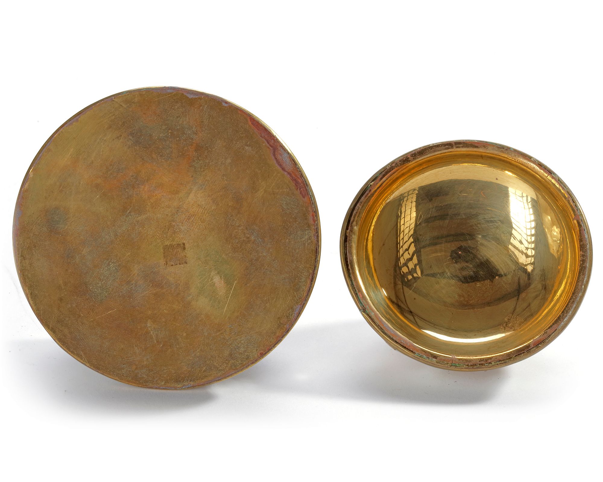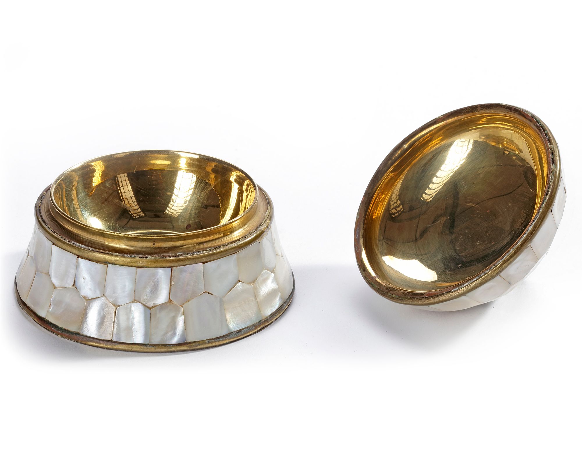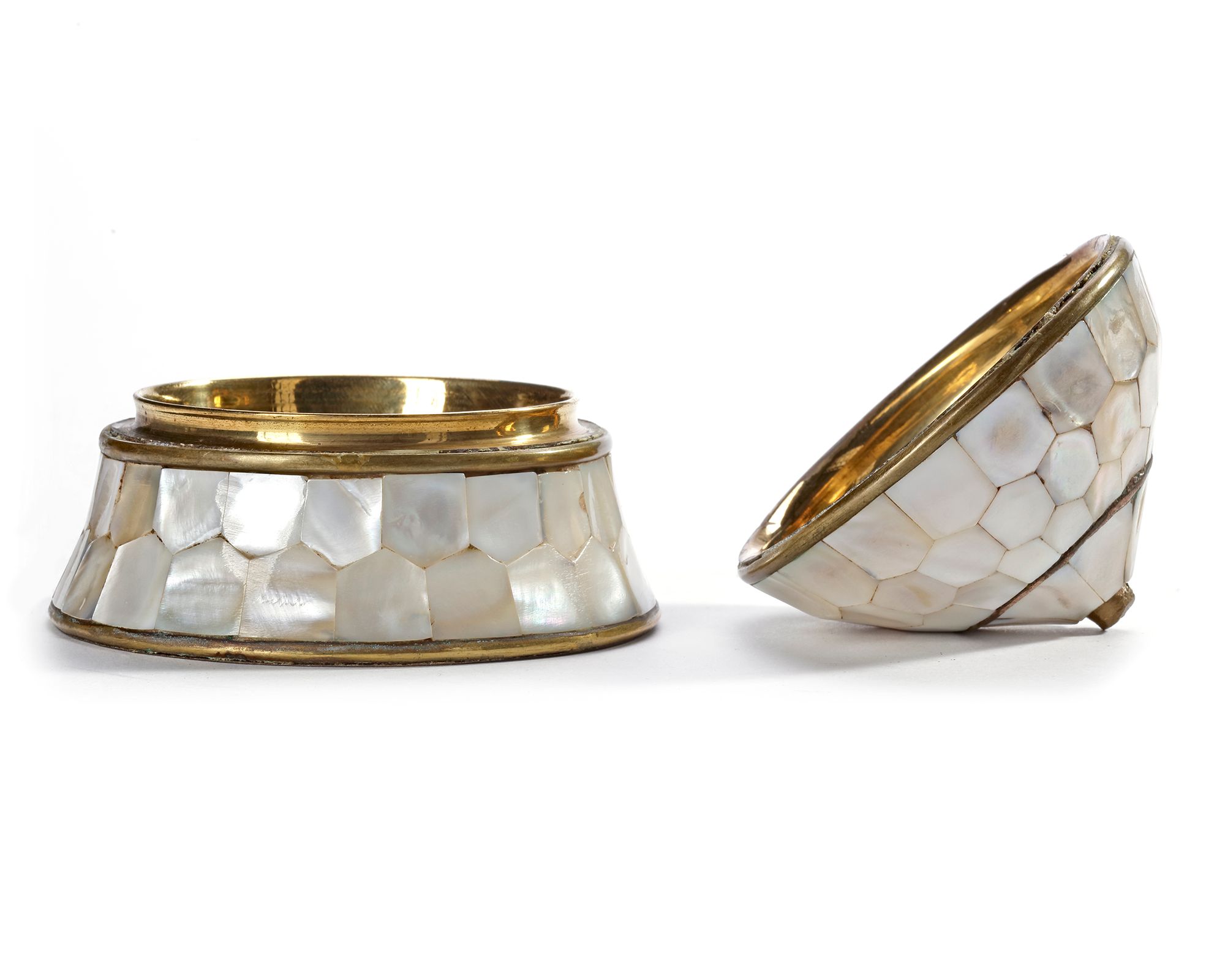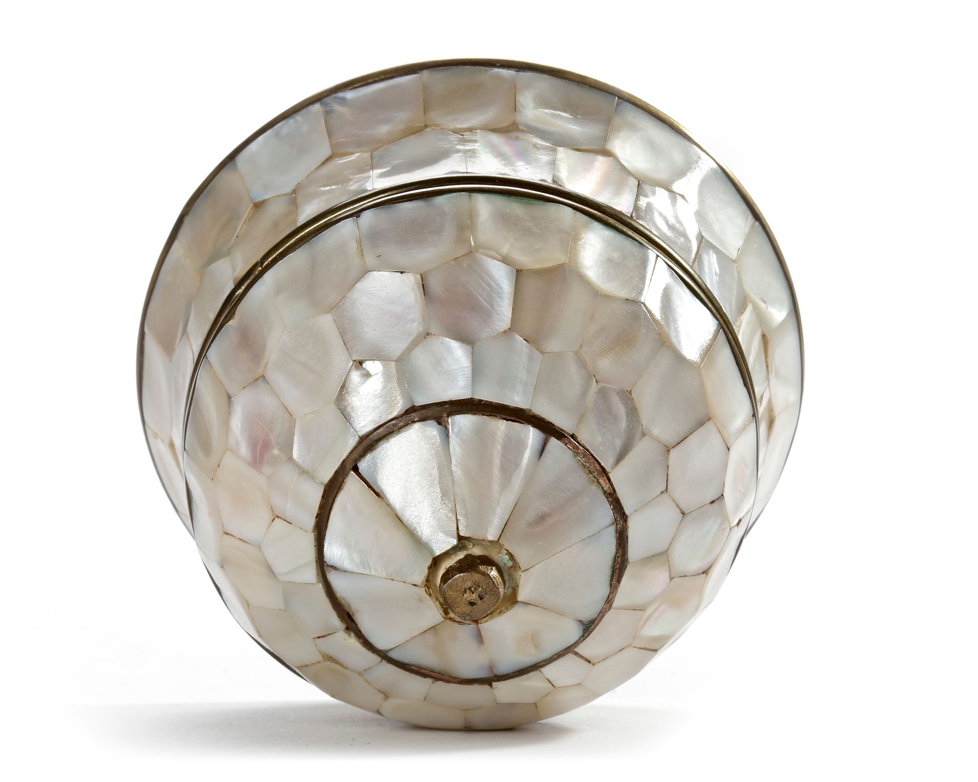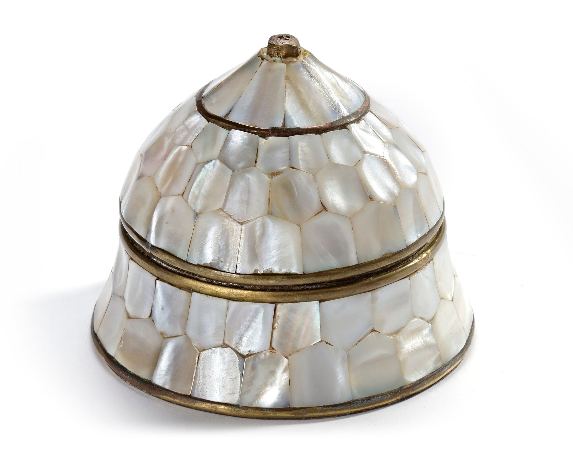 The base is made of copper, intricately inlaid with mother-of-pearl panels. The polished and gilded copper lends the piece a rich, golden appearance. The mother-of-pearl is arranged in a honeycomb-like tessellation, bordered with fine brass or copper bands for both definition and structural reinforcement. Dimensions: 10 × 11 cm.