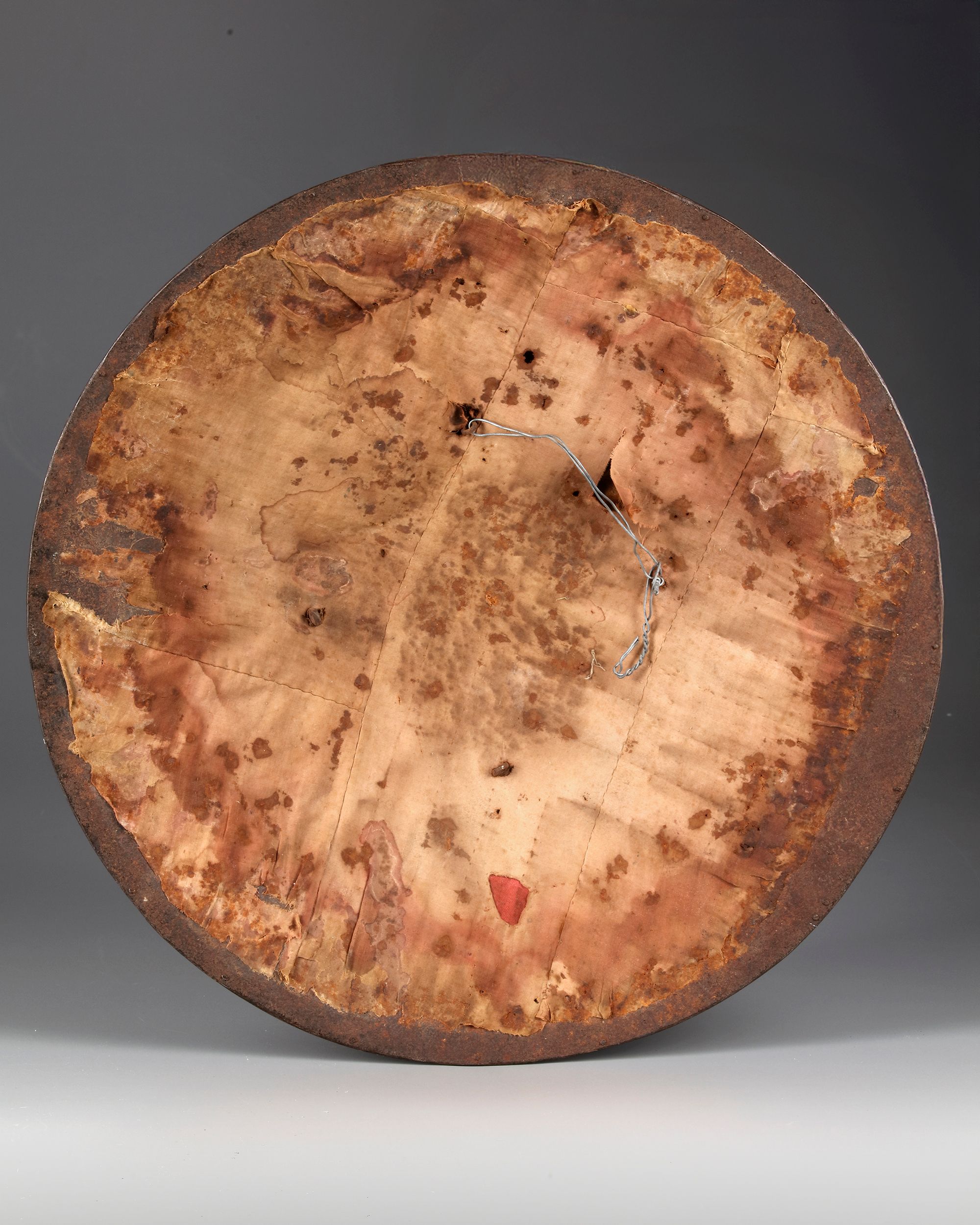 Of rounded form, featuring four applied bosses and traces of polychrome decoration depicting horsemen and figures. D. 49 cm.