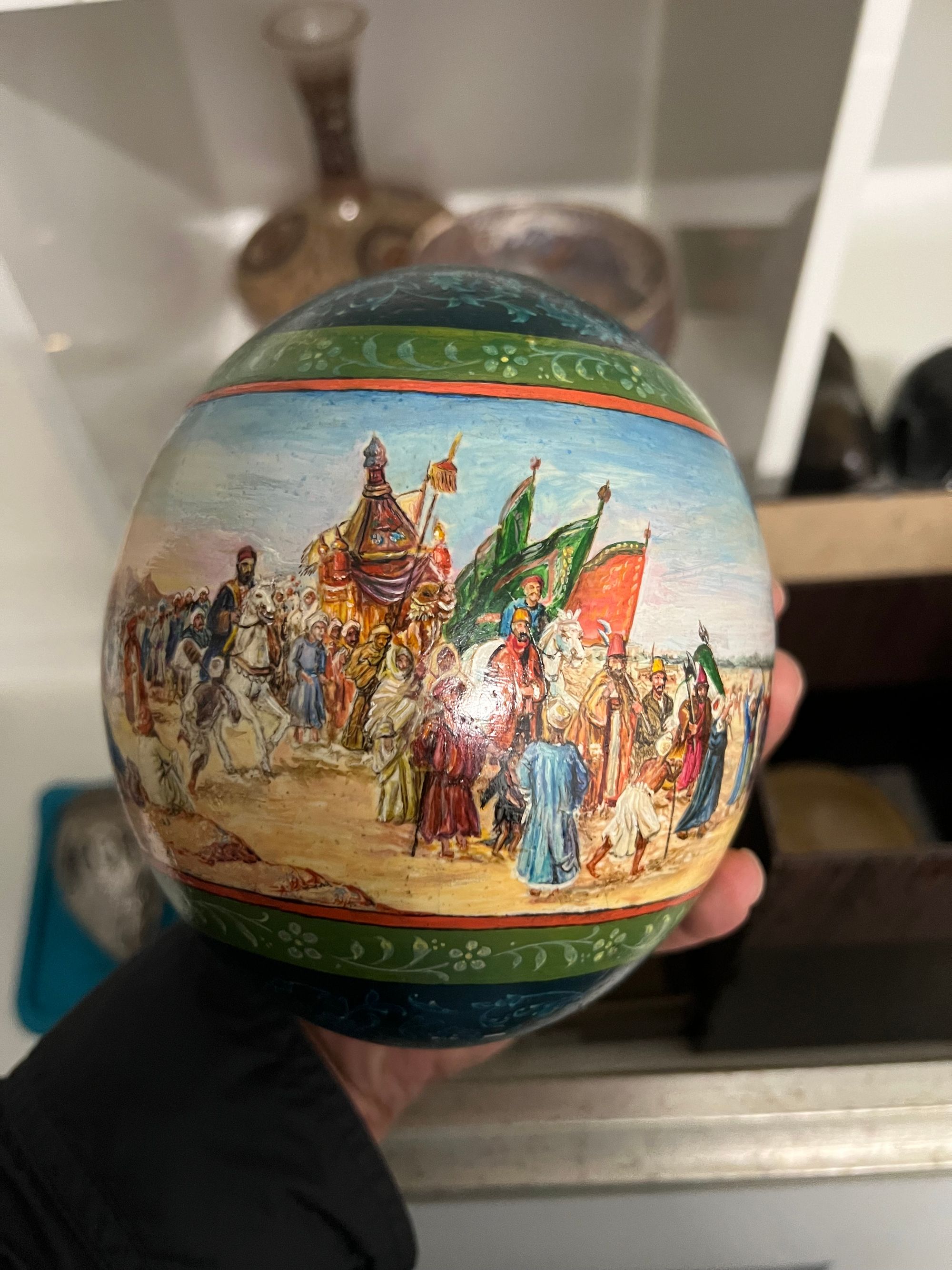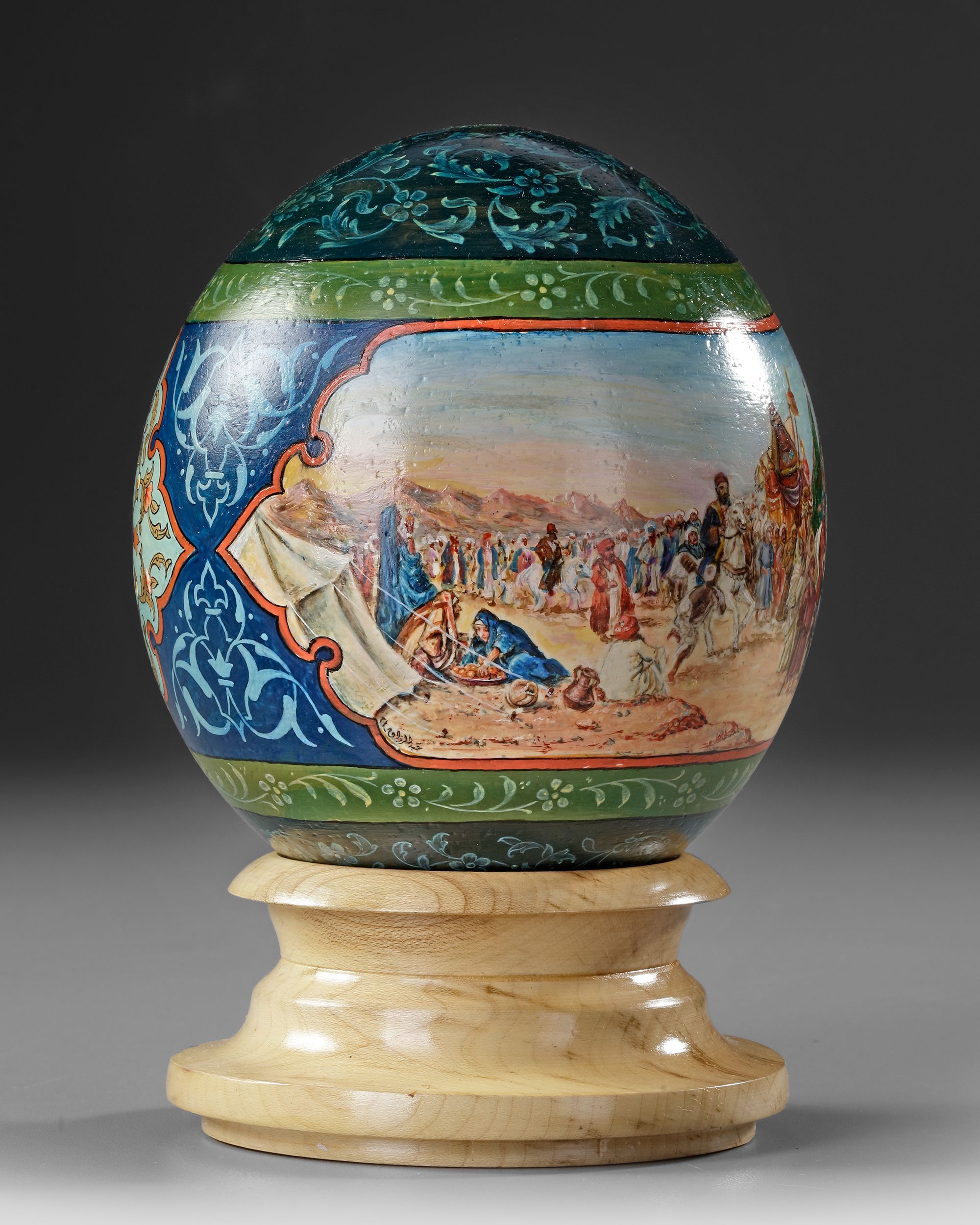 Elegantly painted in polychrome, the egg features a broad band encircling it, portraying a vivid scene of the Mahmal’s journey to Mecca during the sacred Hajj pilgrimage.