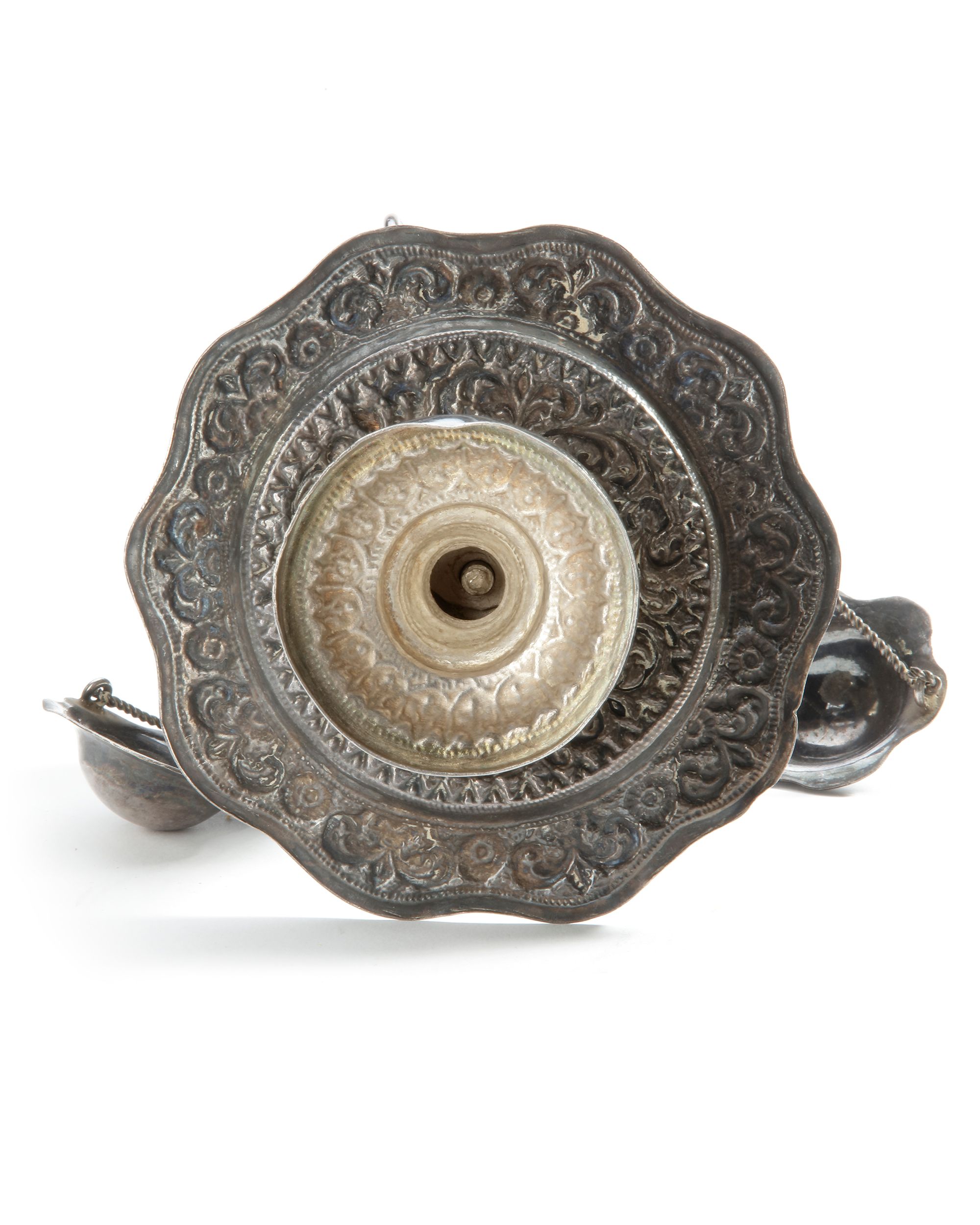 With flared rim and elaborate floral engravings, mounted on a circular base with intricate patterns. The piece features three suspended cups hanging from twisted silver chains.