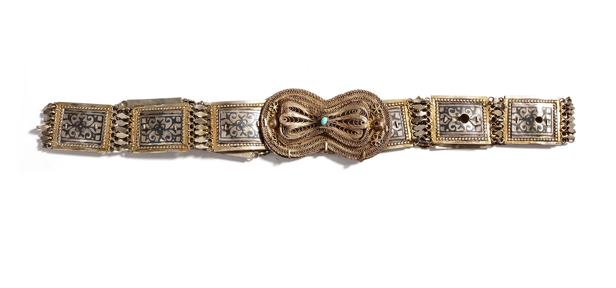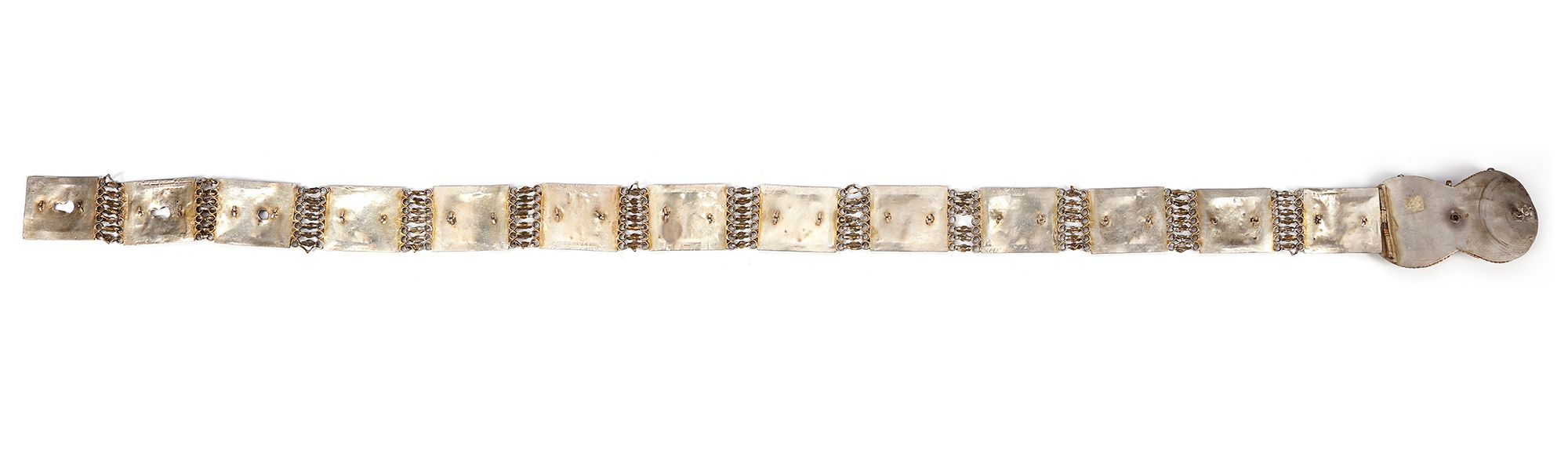 A finely crafted 19th-century Caucasian silver belt, featuring rectangular panels with intricate openwork floral motifs framed in gold detailing. The clasp is richly decorated with delicate filigree and set with a small turquoise stone,