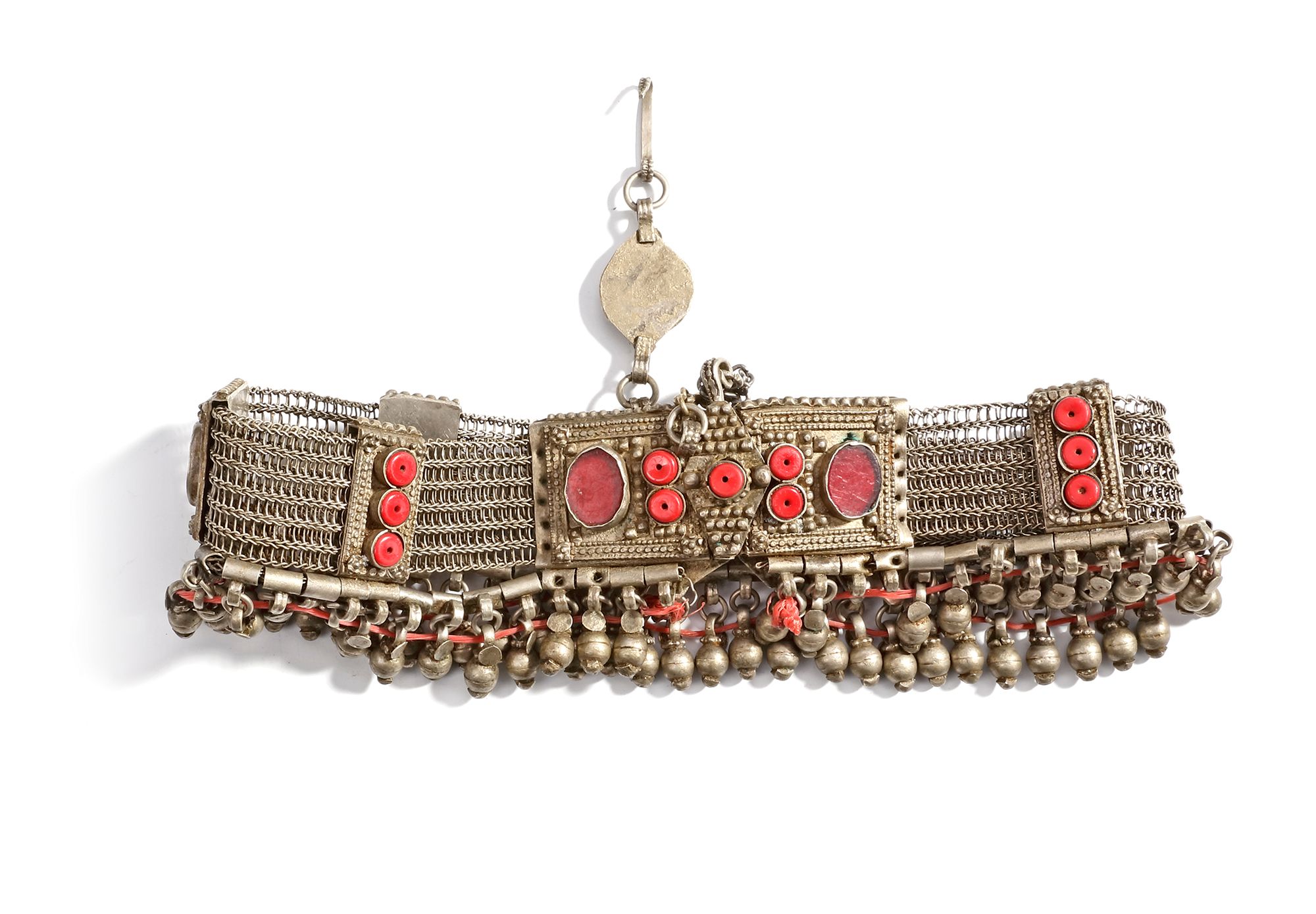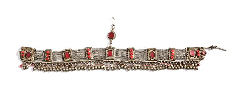 A traditional Islamic silver belt adorned with vibrant red stones, detailed filigree panels, and hanging silver beads. 46 by 5 cm. 279 gr.