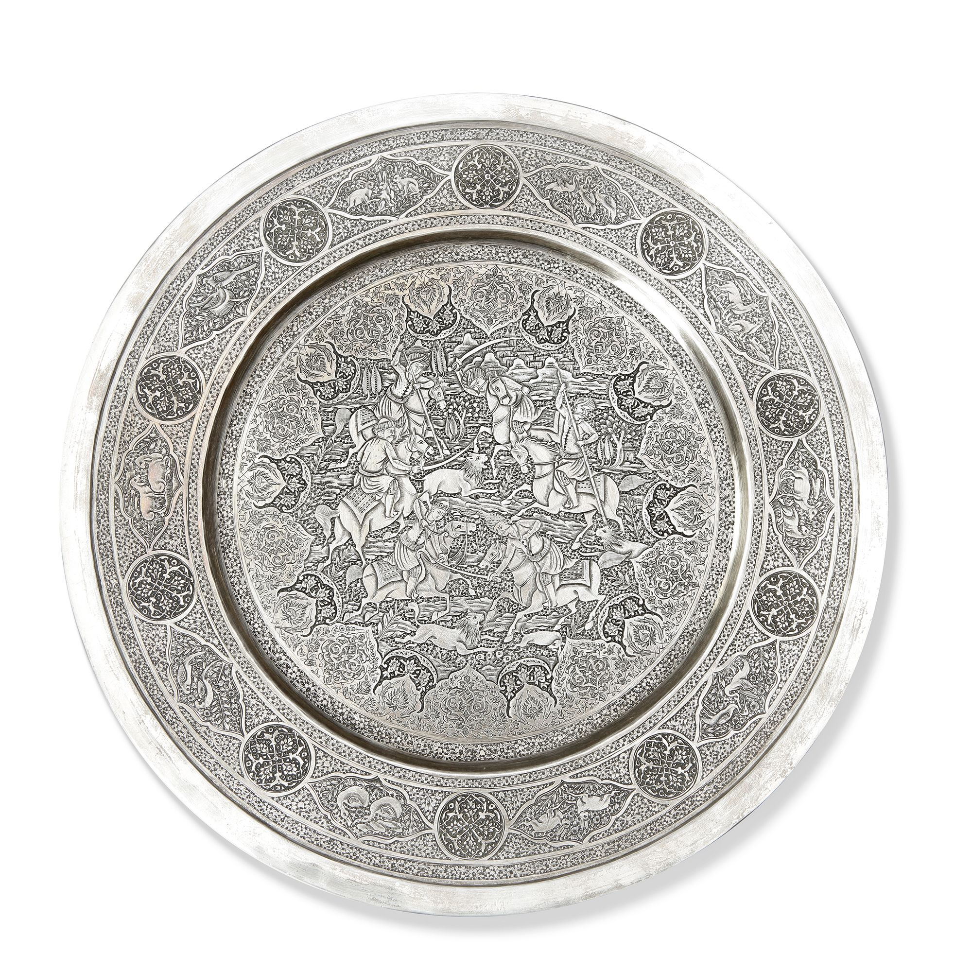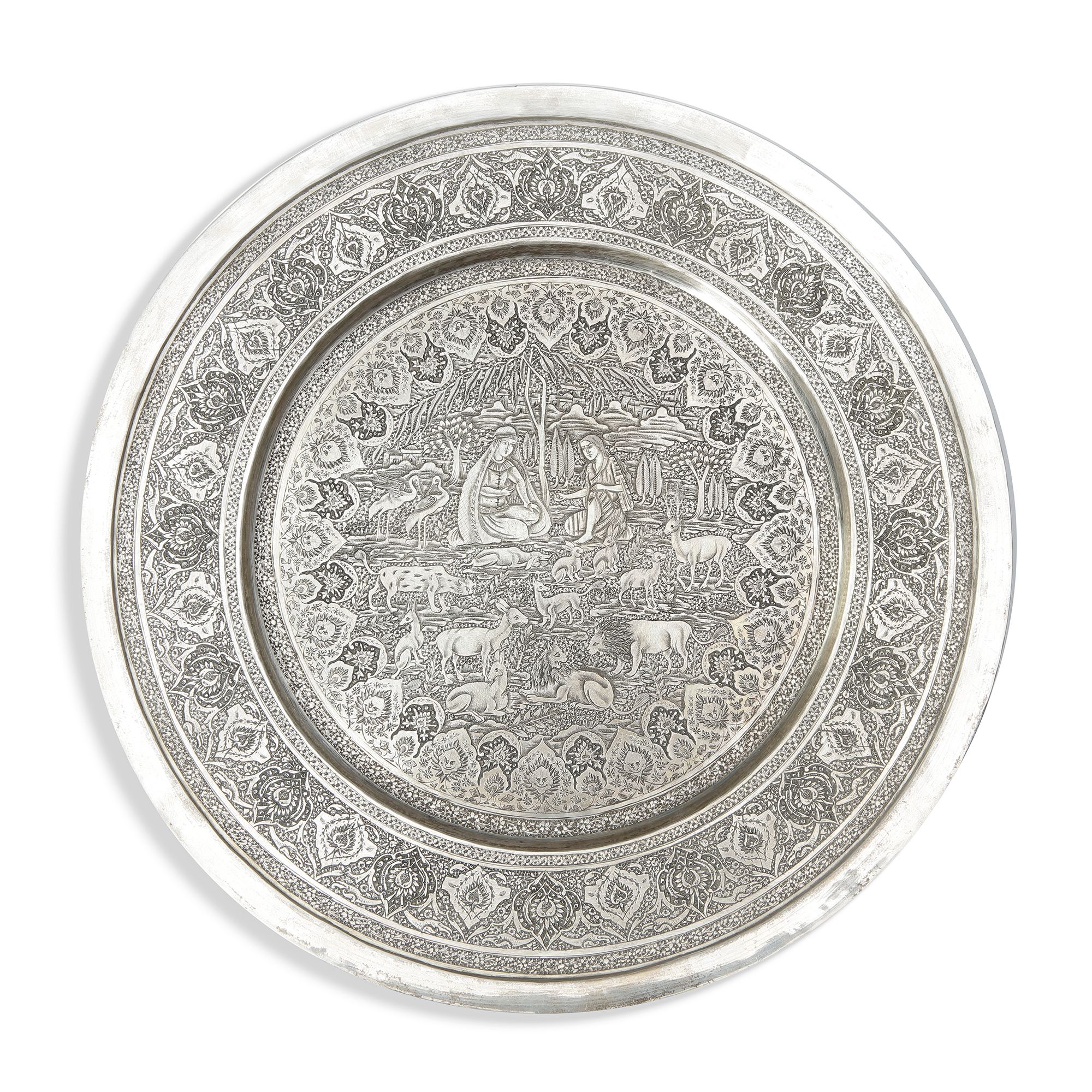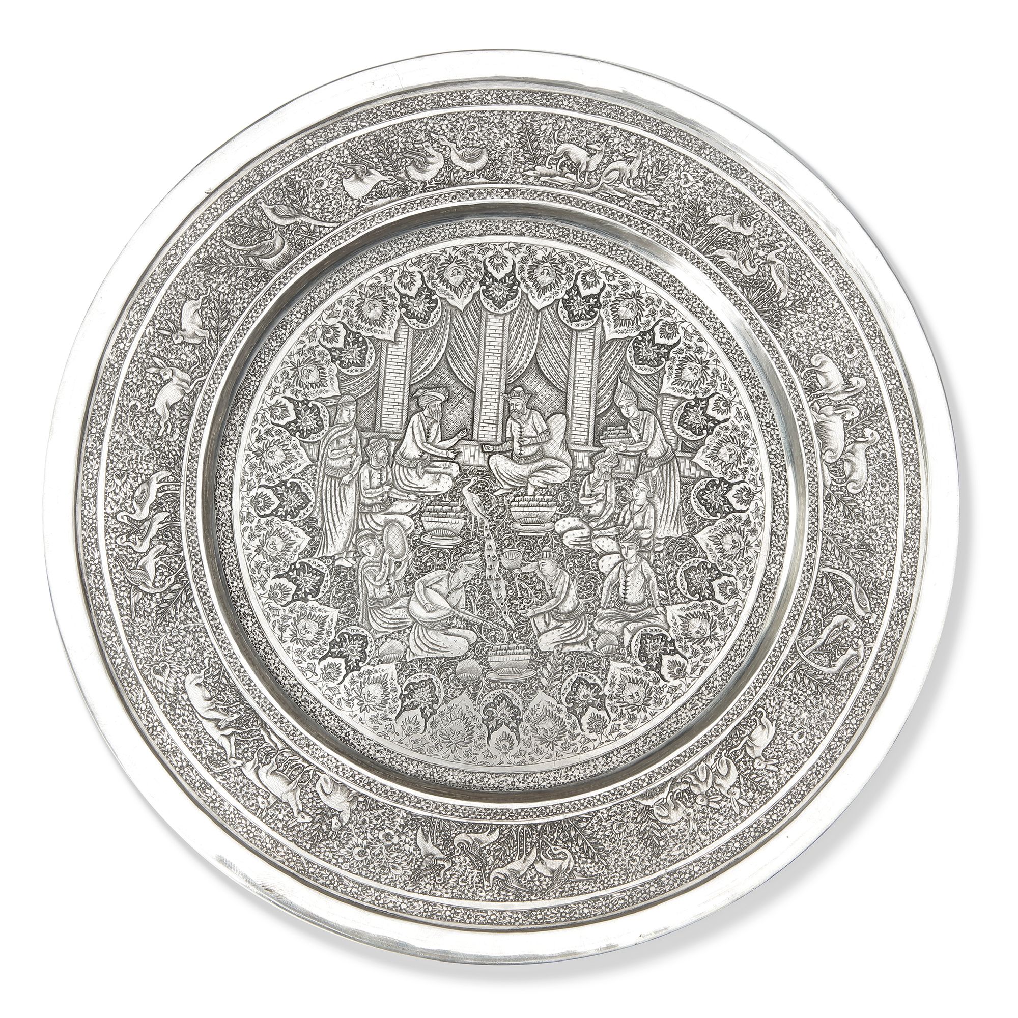 This magnificent set of six engraved Persian silver plates represents one of the finest examples of Isfahan metalwork from the late 19th to early 20th century. Each plate is exquisitely decorated with courtly and narrative scenes featuring recognisable characters from Islamic and Persian stories.