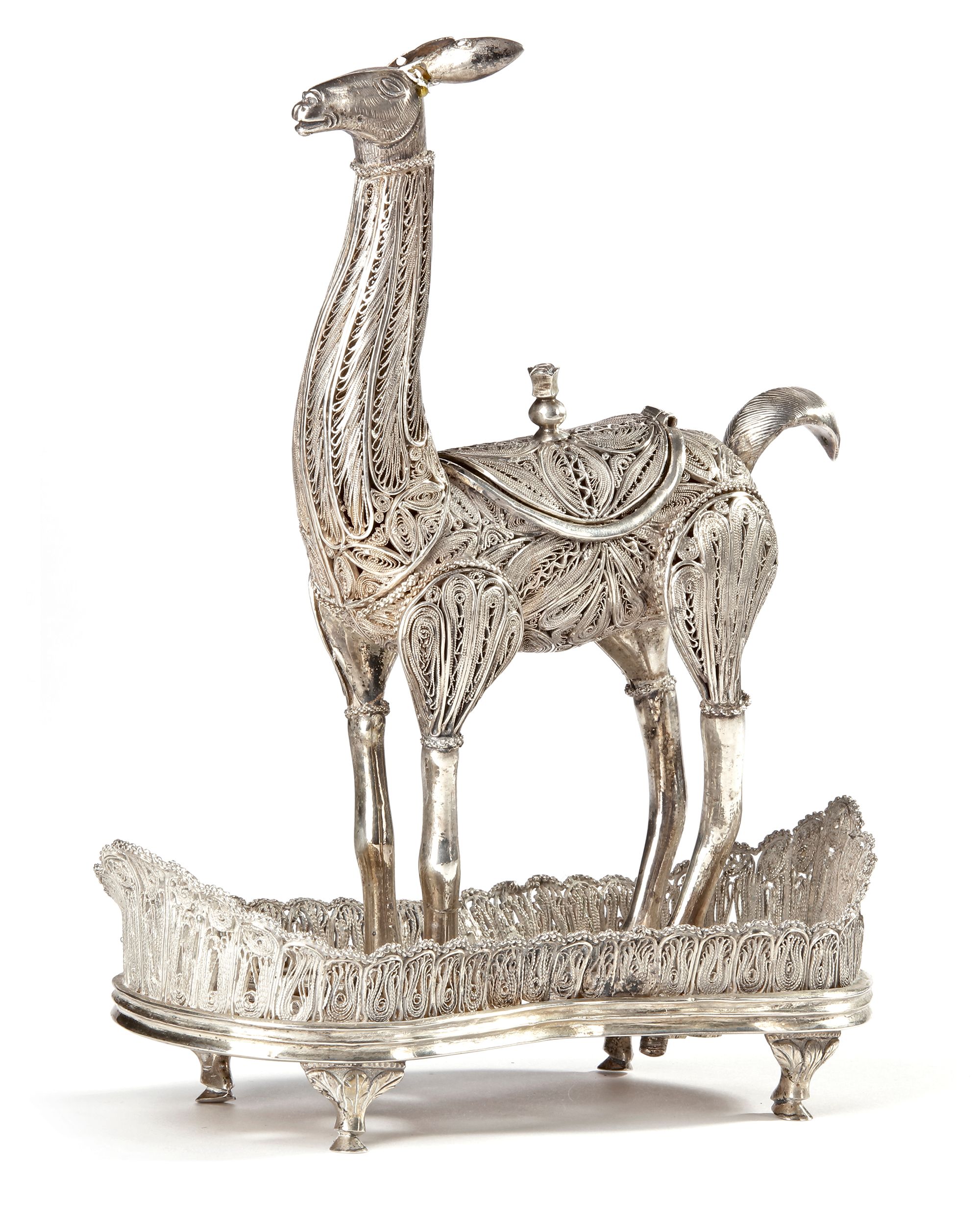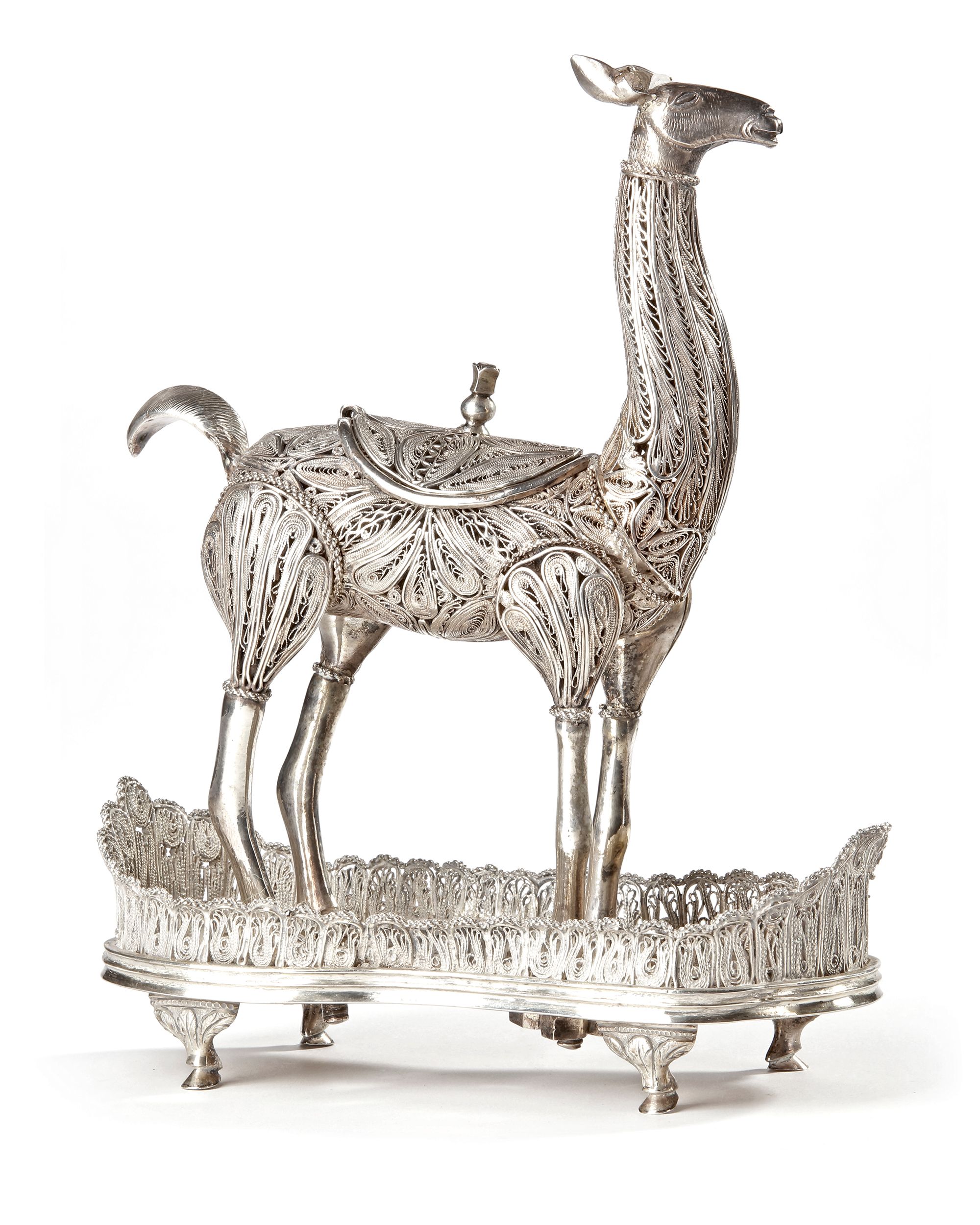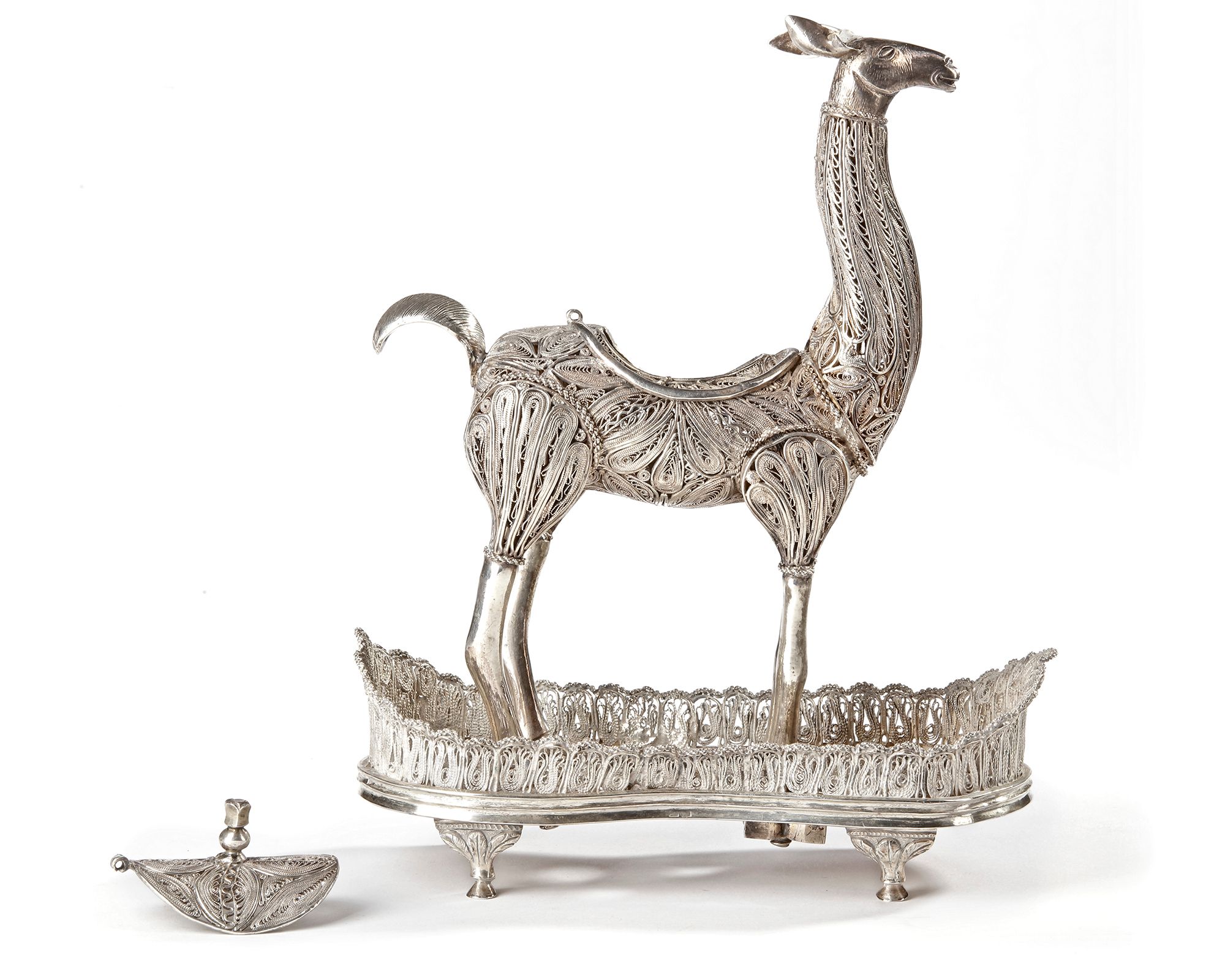 A unique 19th-century Indian silver incense burner in the form of a lama, crafted in delicate filigree work. Standing on an ornate base, this finely detailed piece combines artistry and function, symbolizing elegance in traditional Indian silver work.