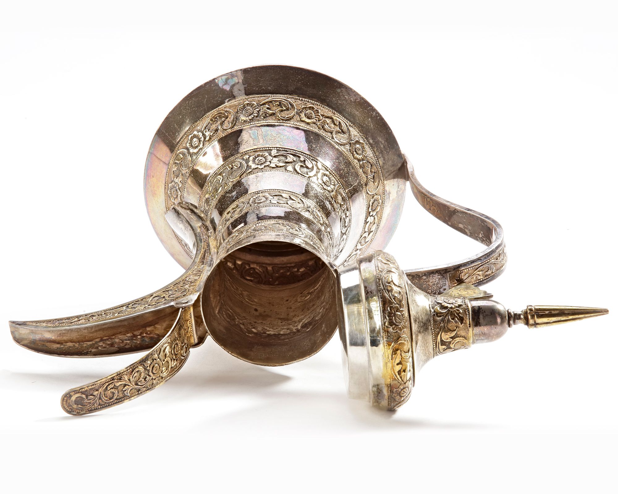 Of a solid silver with fine engraved and chiseled motives on body and lid.
