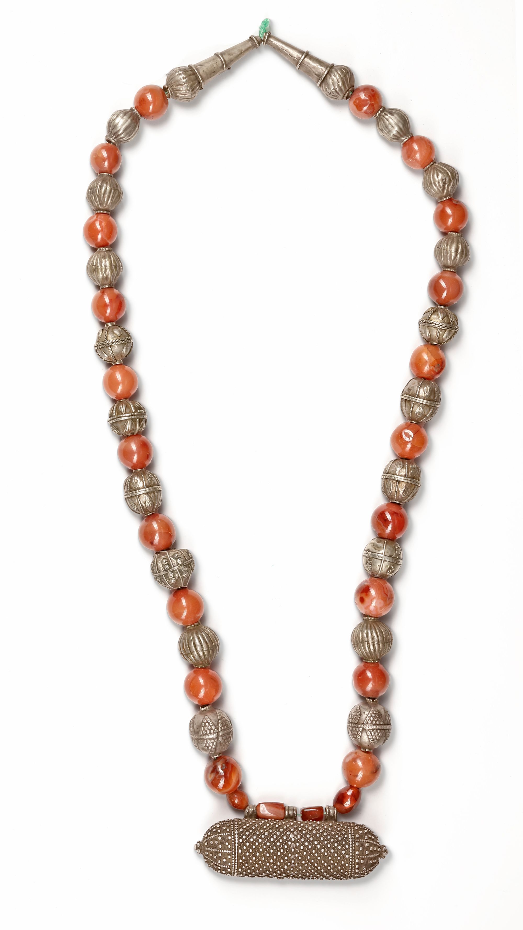 An elegant Yemeni necklace composed of alternating polished agate beads and finely crafted silver spheres with detailed engravings. The centerpiece is an elongated silver amulet case (hirz) decorated with intricate granulation and dotted patterns.