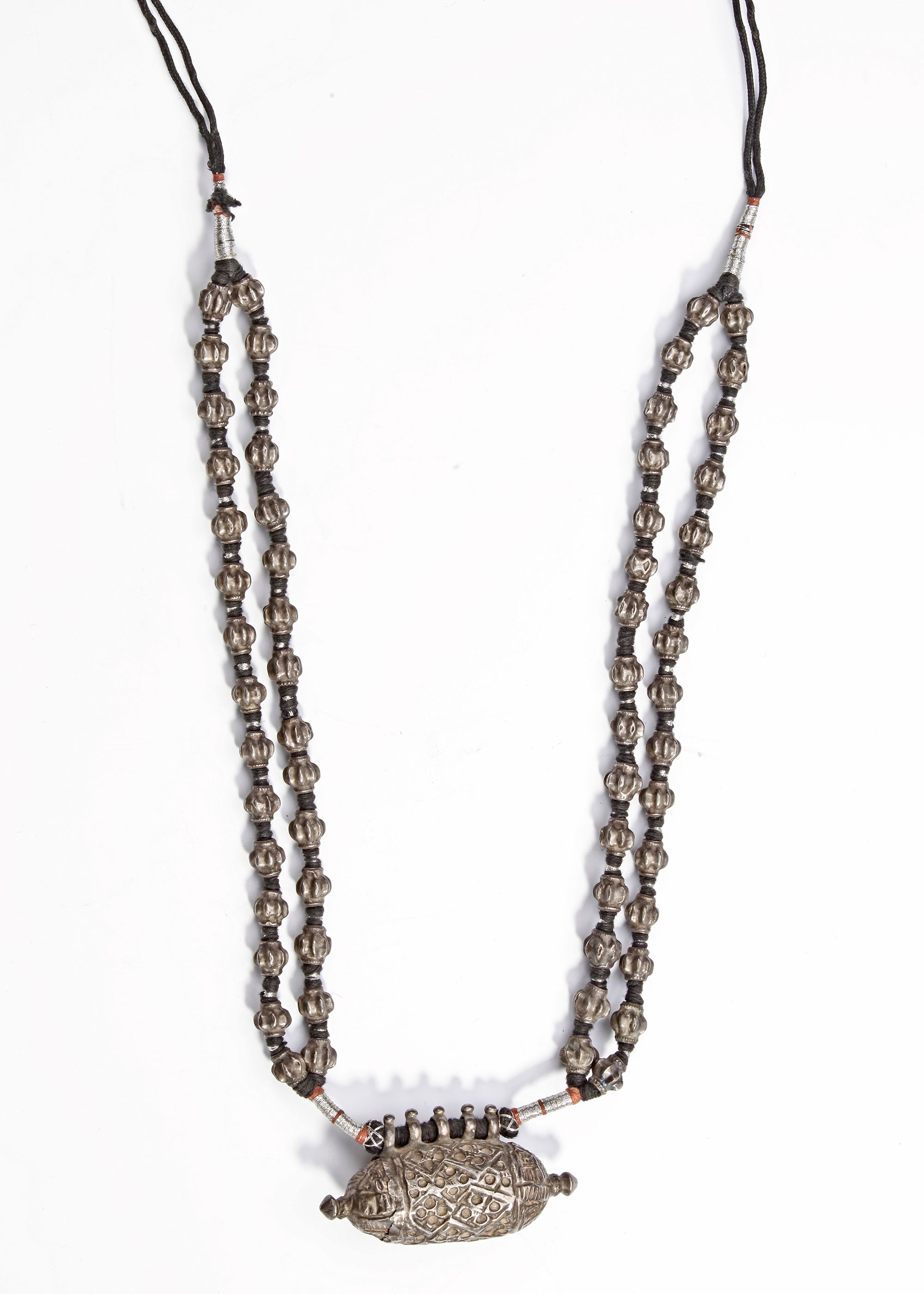 A traditional Yemeni necklace composed of two strands of silver beads, centered with an ornate amulet box pendant richly decorated with geometric and dotted motifs.