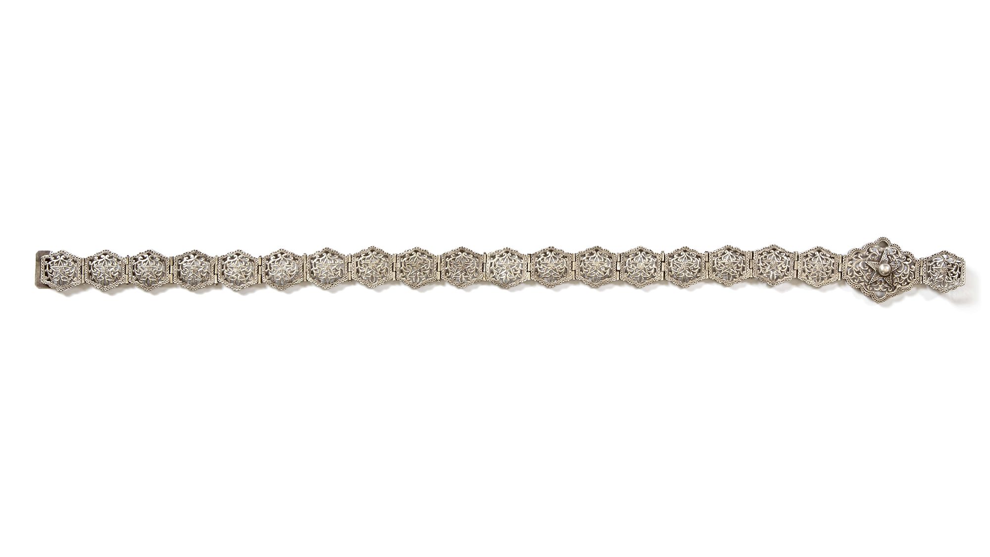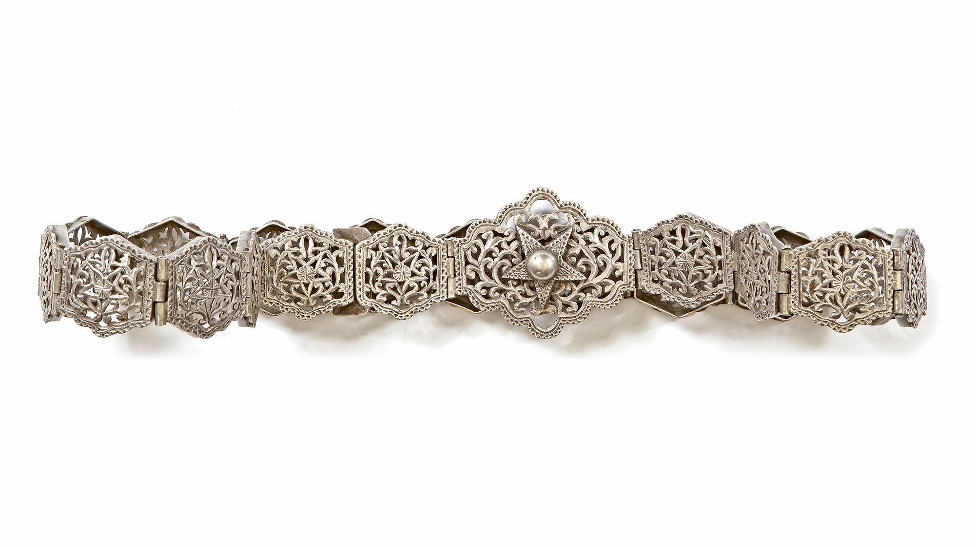 Composed of linked panels with intricate openwork floral and geometric designs. The central clasp features a star motif with a domed boss.