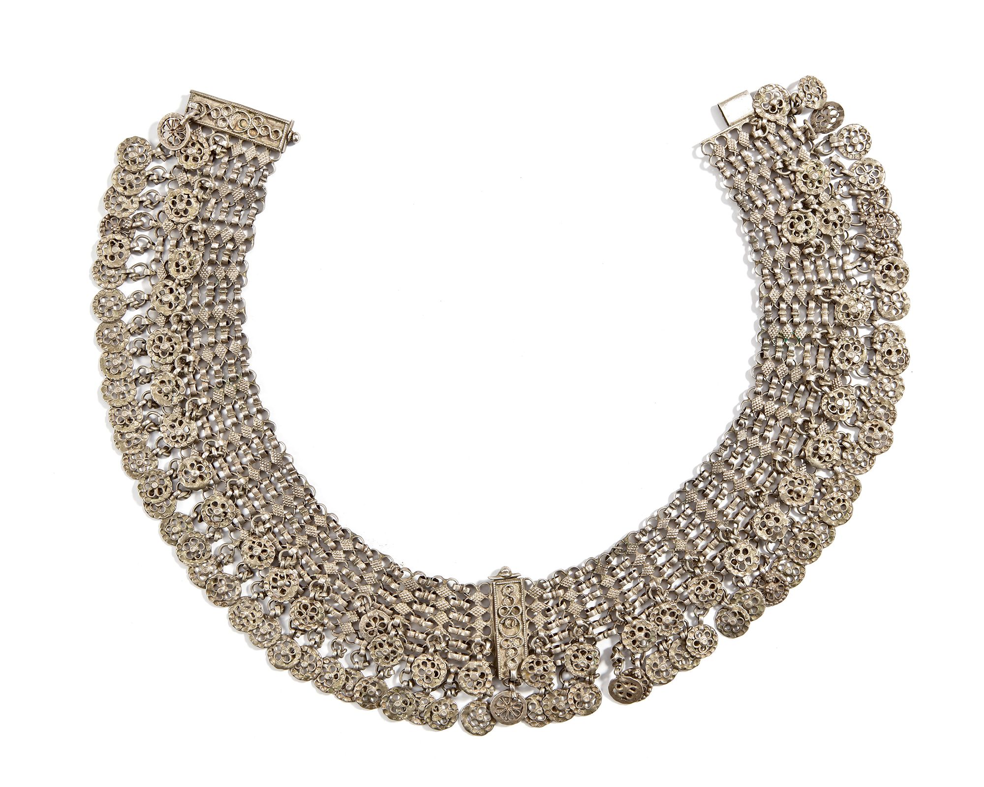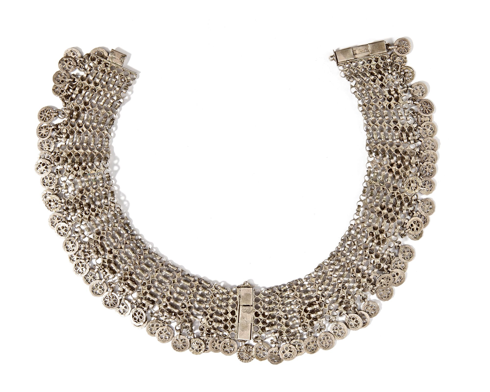 Composed of intricate interlinked chains and decorated with rows of floral medallion motifs. Finished with an ornate clasp.