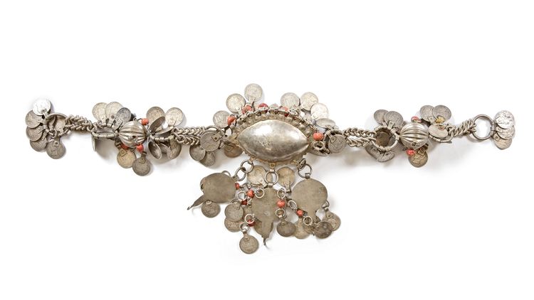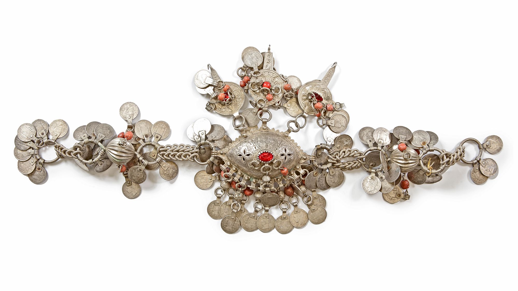 Crafted with intricate filigree and engraved designs, it features parcel-gilt detailing, red and coral beads, and numerous dangling coins. A powerful piece of traditional Amazigh (Berber) adornment, symbolizing wealth and cultural heritage.