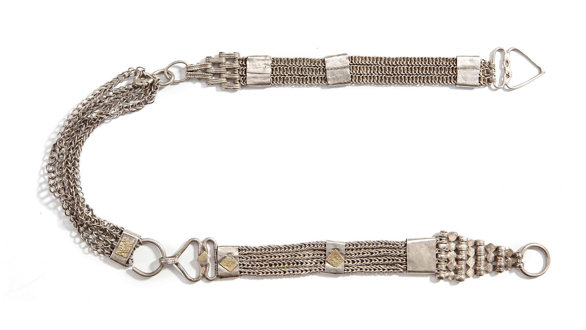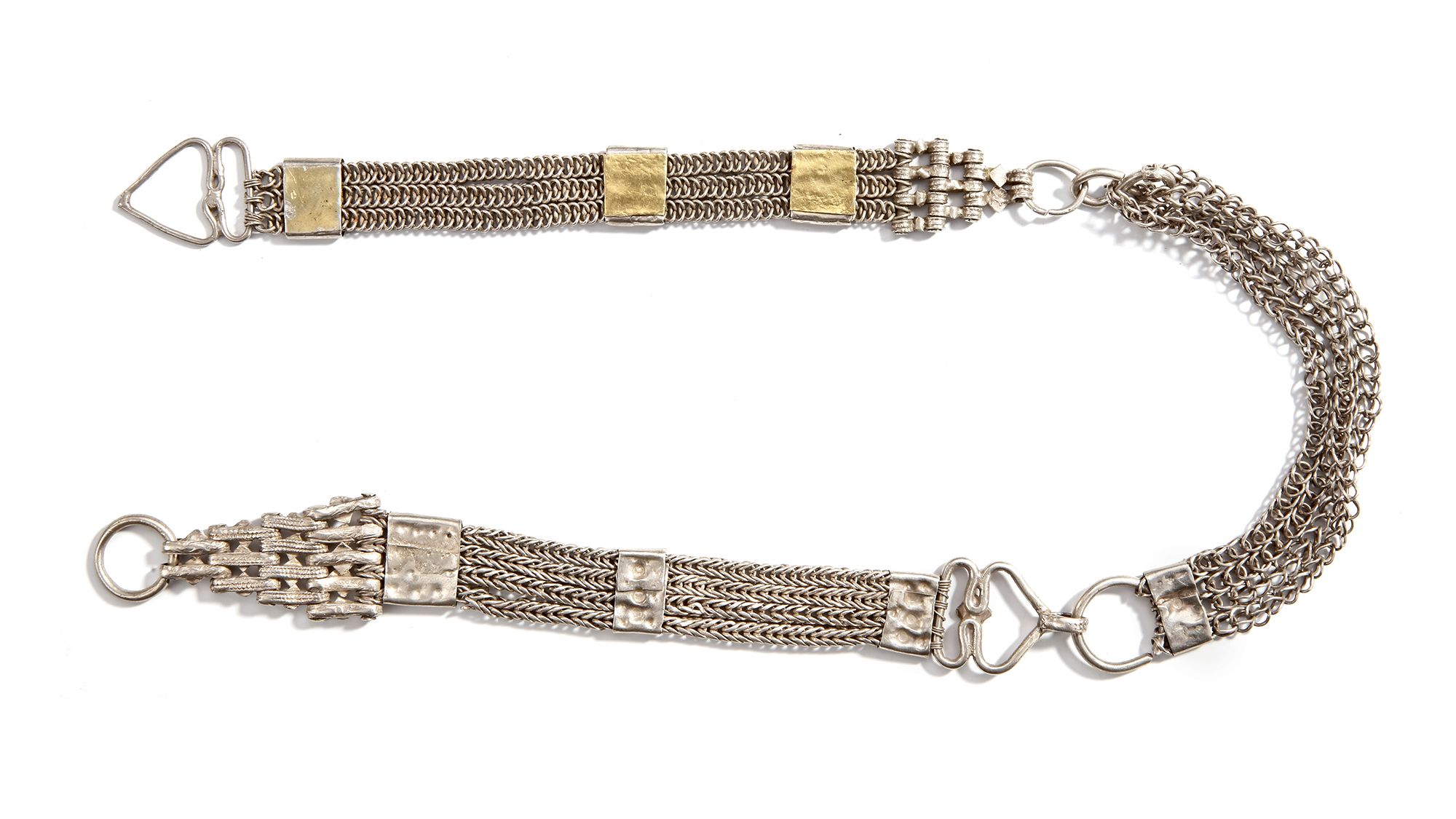 With multiple woven chain strands joined by engraved fittings. The central plaque is decorated with geometric designs and a gilded panel.