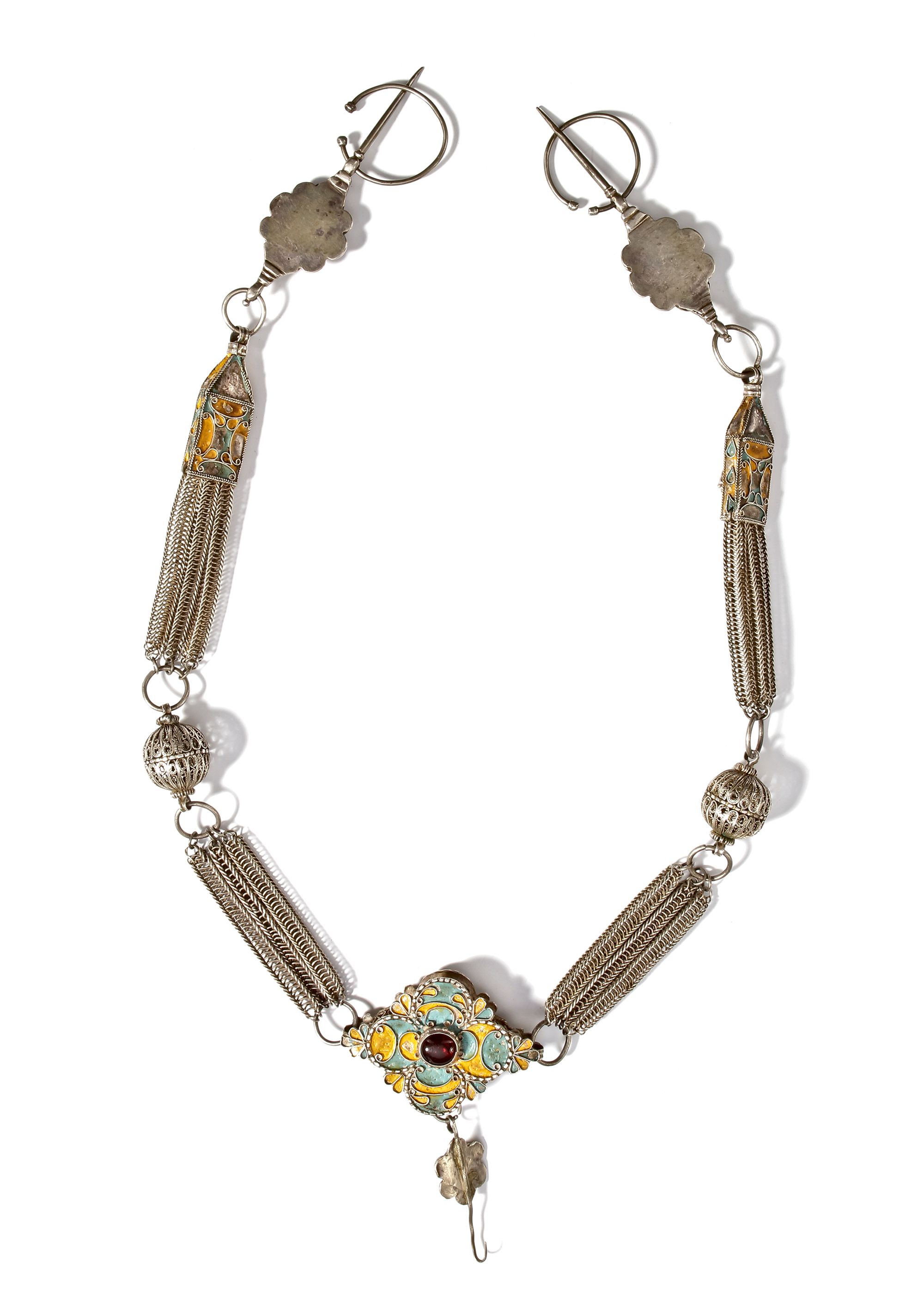 Richly decorated with filigree work, enamel detailing, and set with colorful cabochon stones. Featuring ornate chain segments, openwork beads, and a bold central pendant.