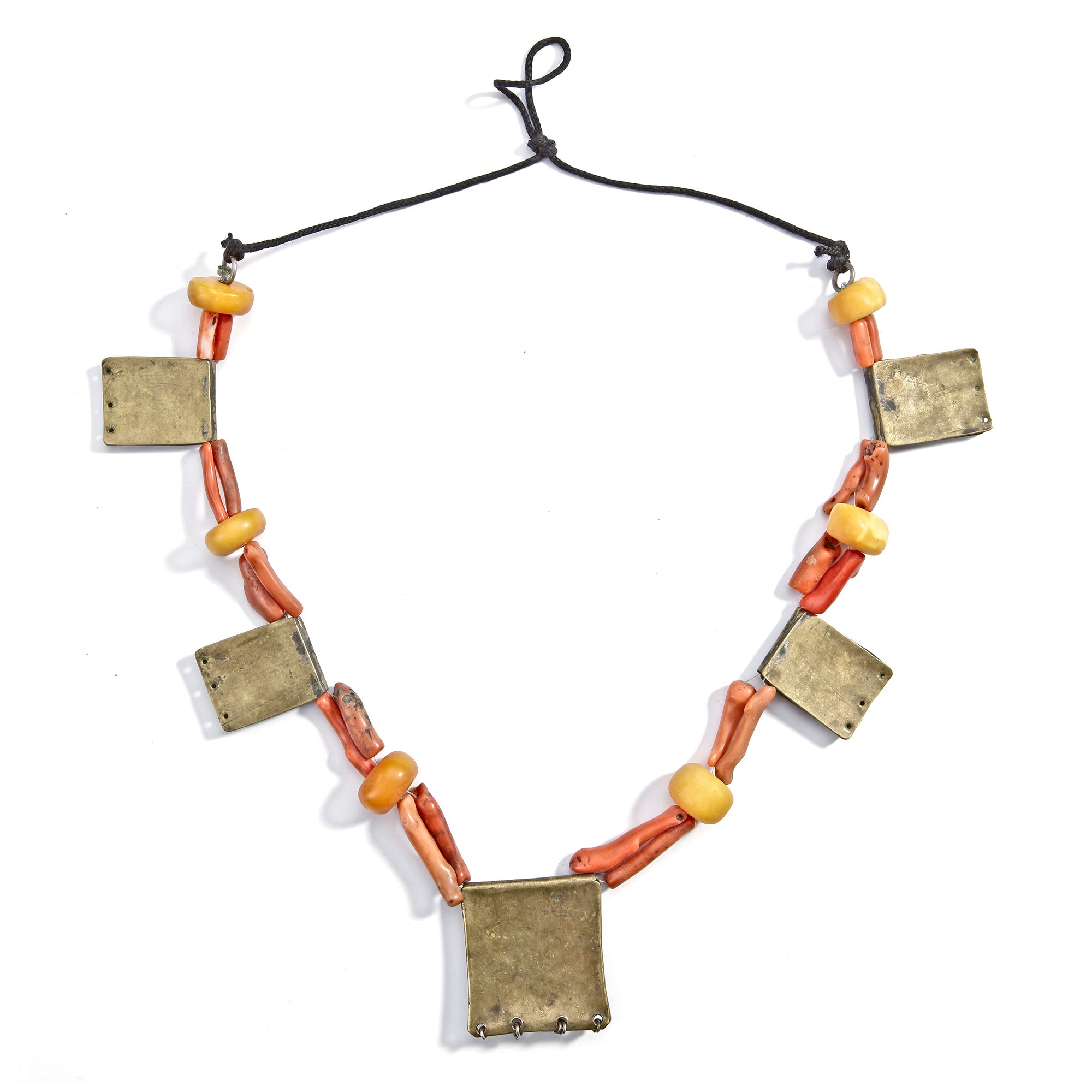 Composed of engraved silver amulet boxes (gau) interspersed with natural red coral branches and amber beads.