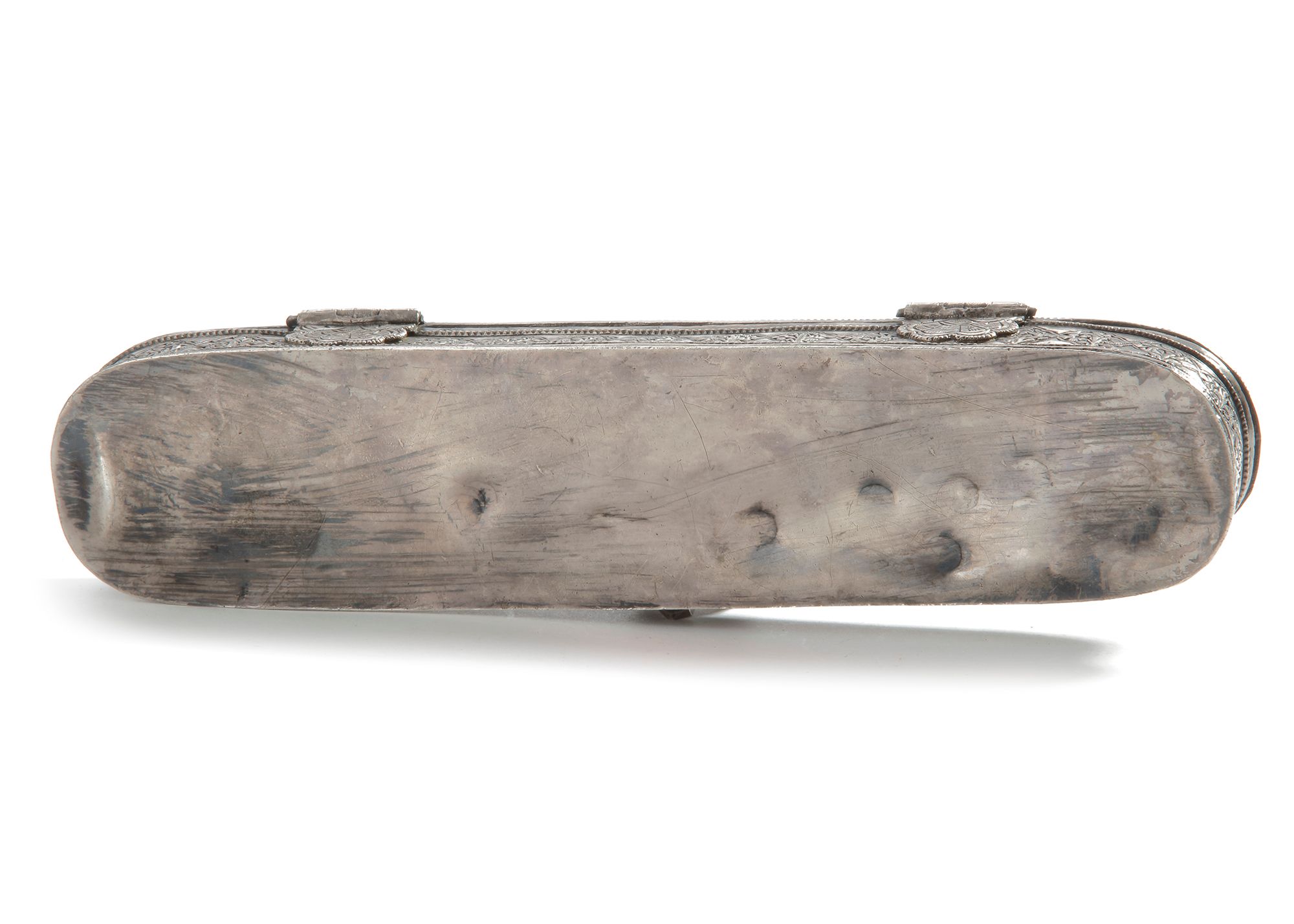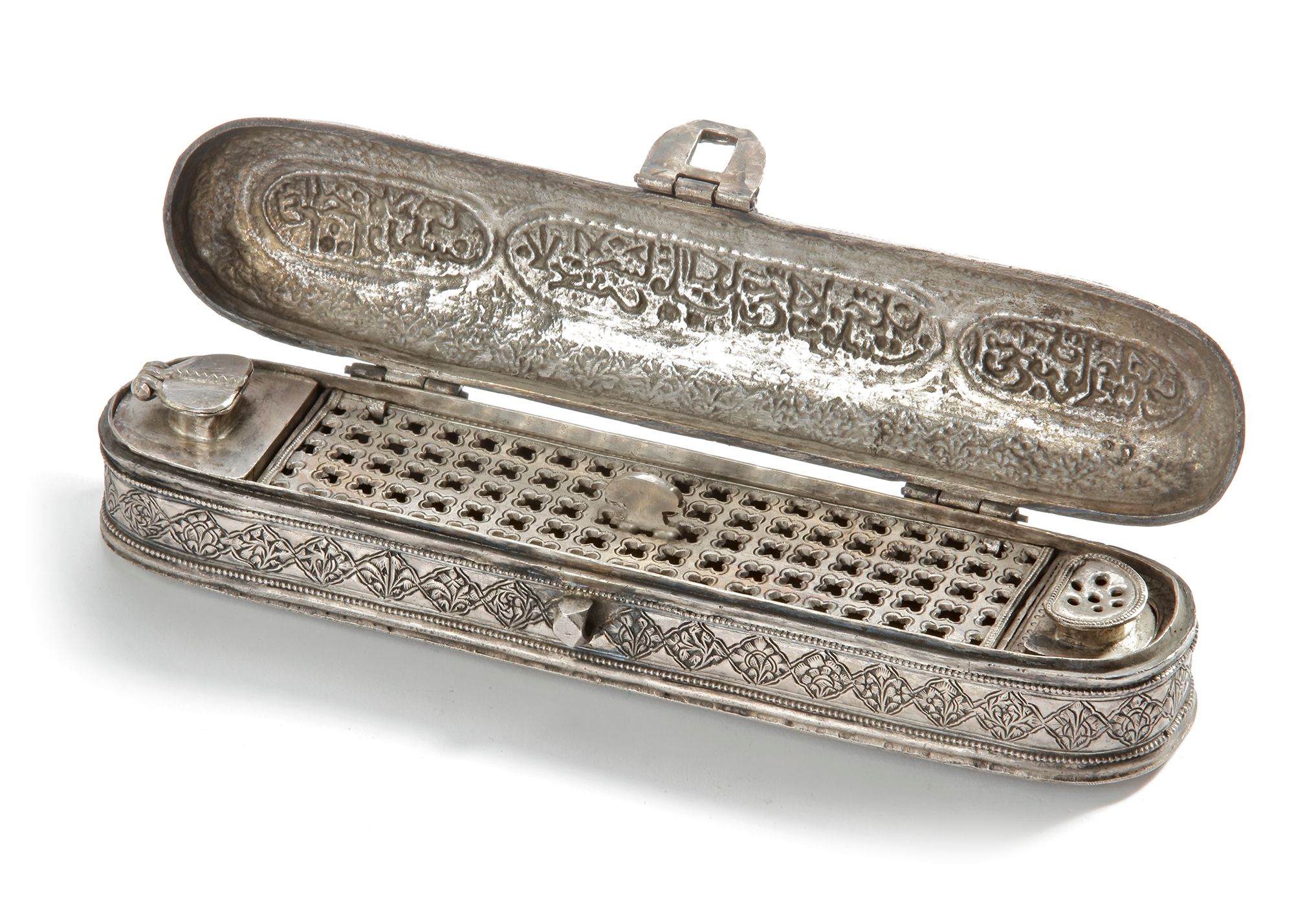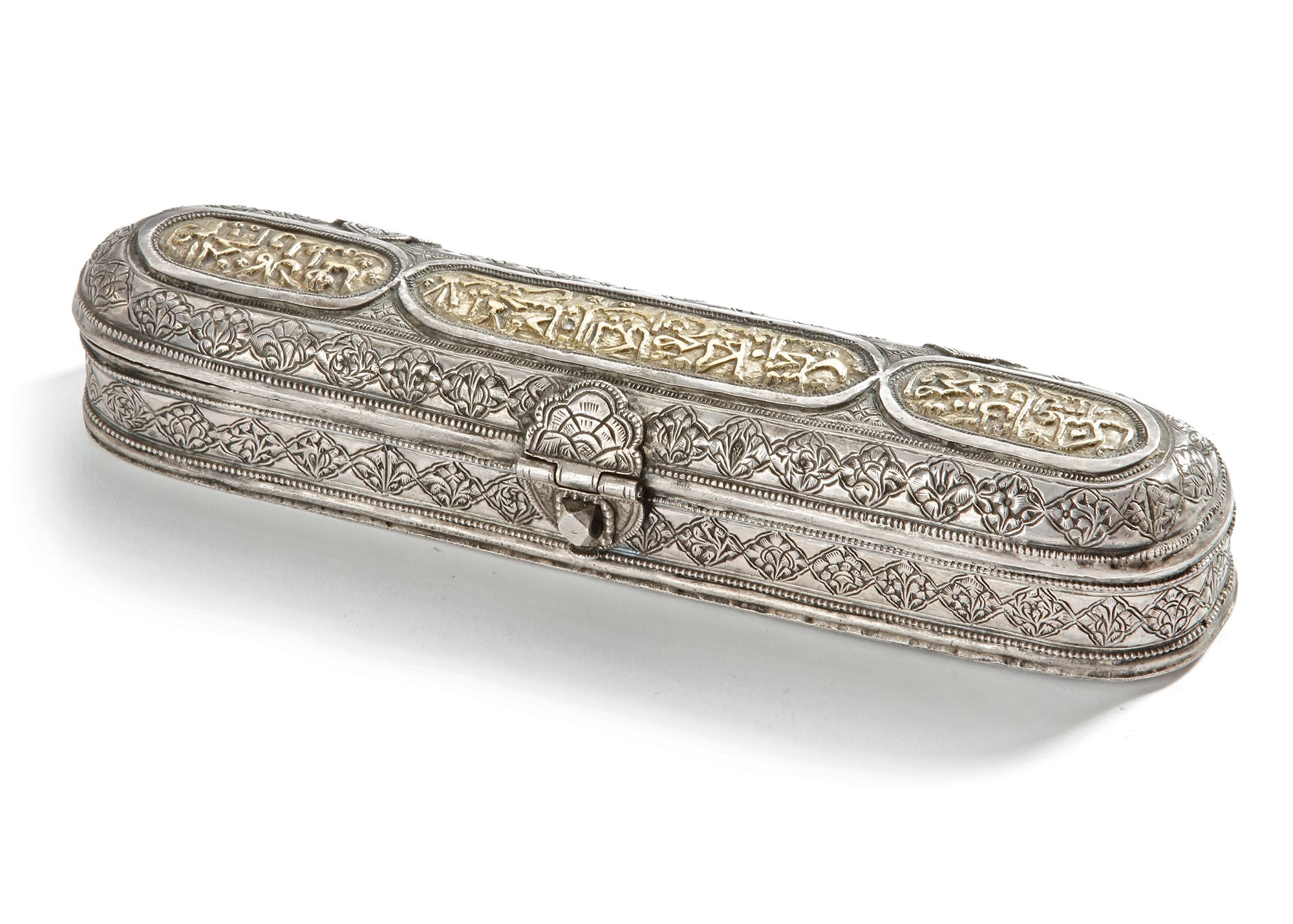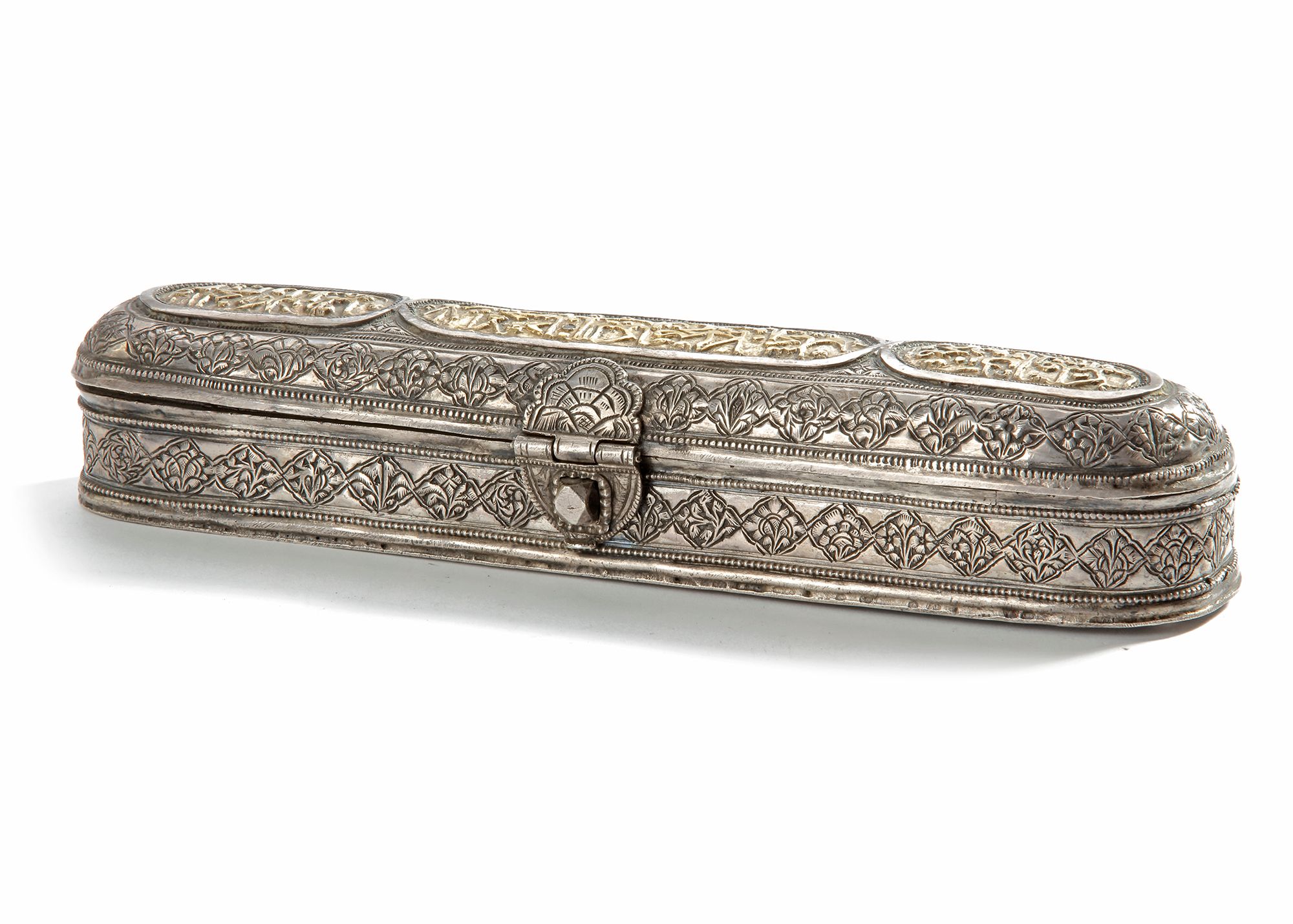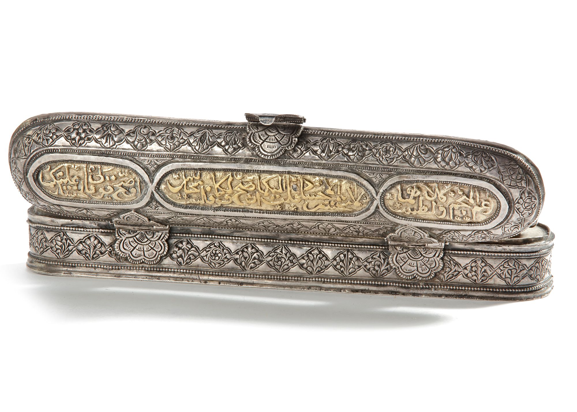 Richly decorated with engraved floral motifs and Arabic calligraphy panels highlighted in gilt. Designed with compartments for pens and ink.