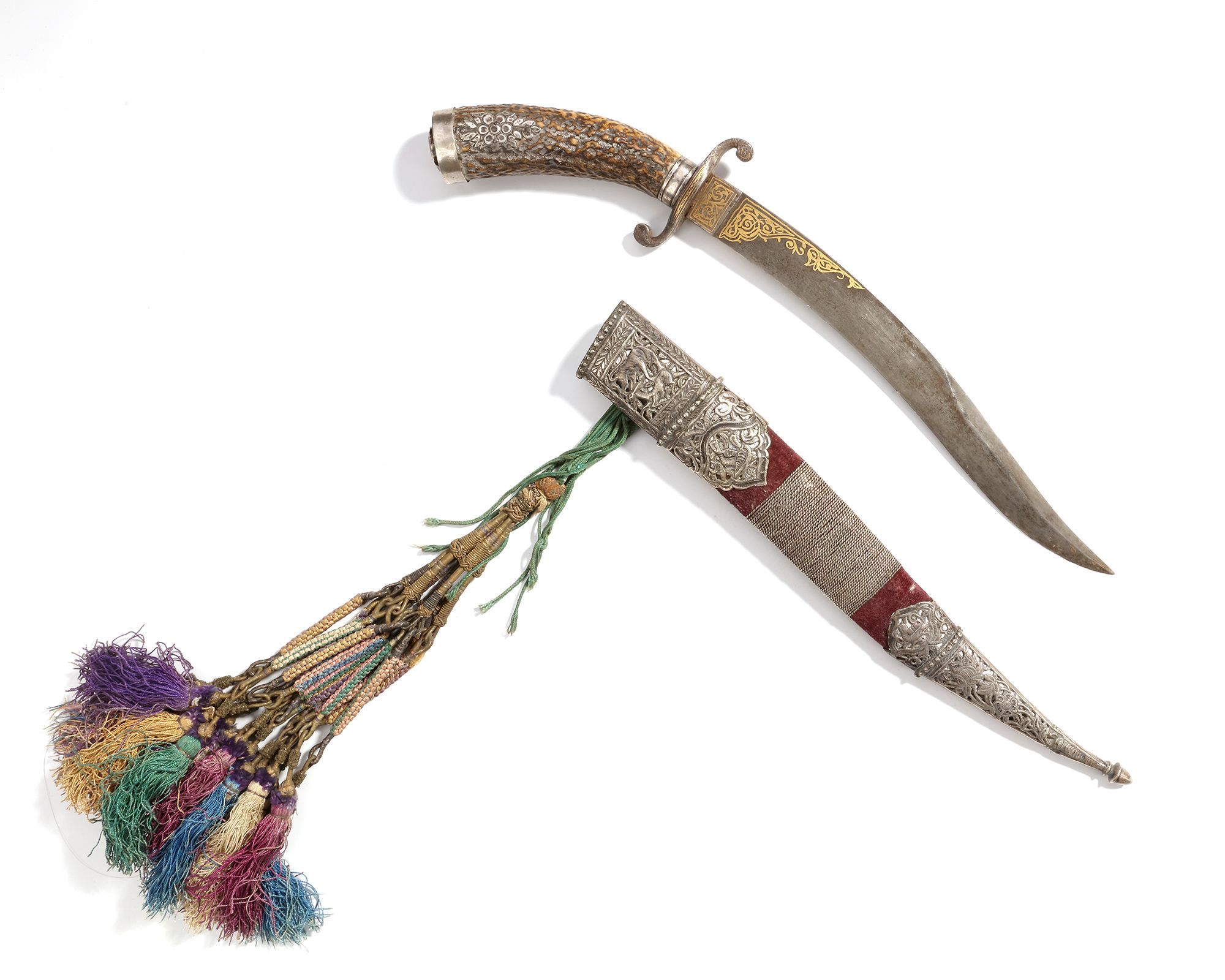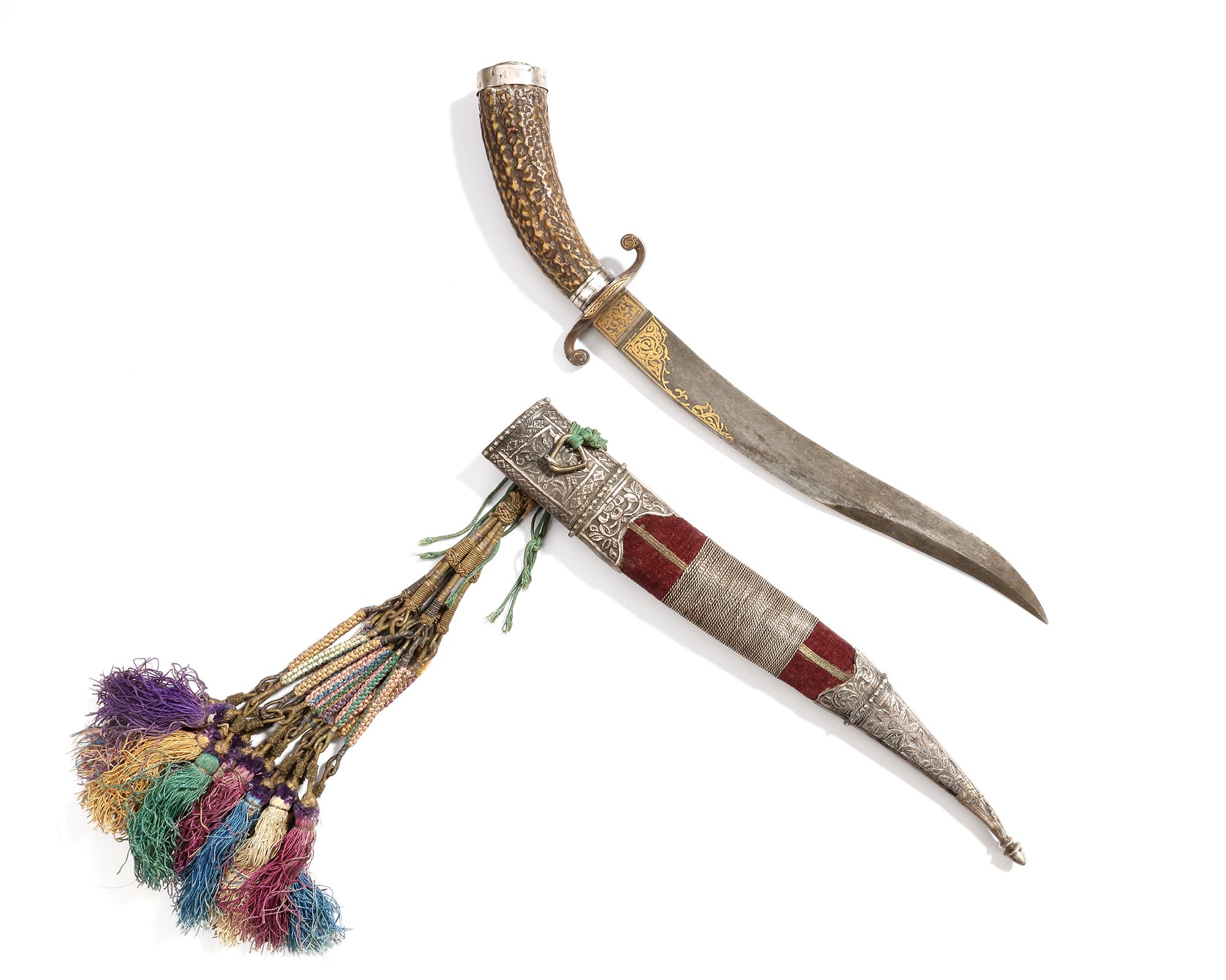A striking Indian dagger with a carved antler handle and silver fittings, richly decorated with floral and animal motifs. The sheath combines red velvet with fine silver overlay, detailed filigree, and embossed designs. Colorful silk tassels add a vibrant touch, while the blade features delicate gold inlay.
