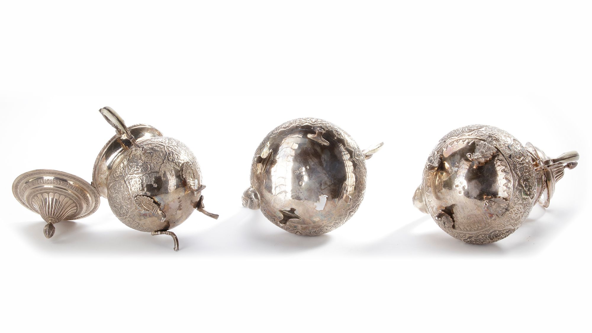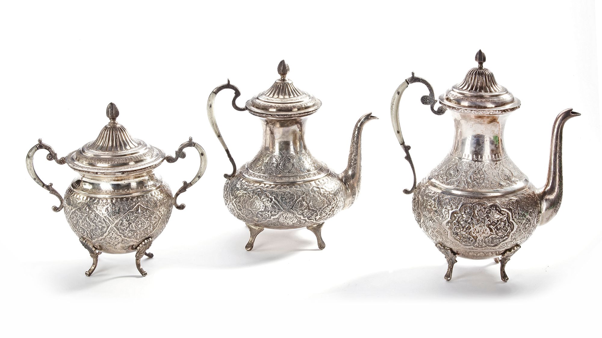 Beautifully crafted Persian silver set consisting of two teapots and one sugar pot. Each piece stands on elegant curved legs and is richly decorated with intricate floral and geometric engravings. Finely detailed lids and handles highlight the artistry and craftsmanship of 19th century Persian silversmiths.
