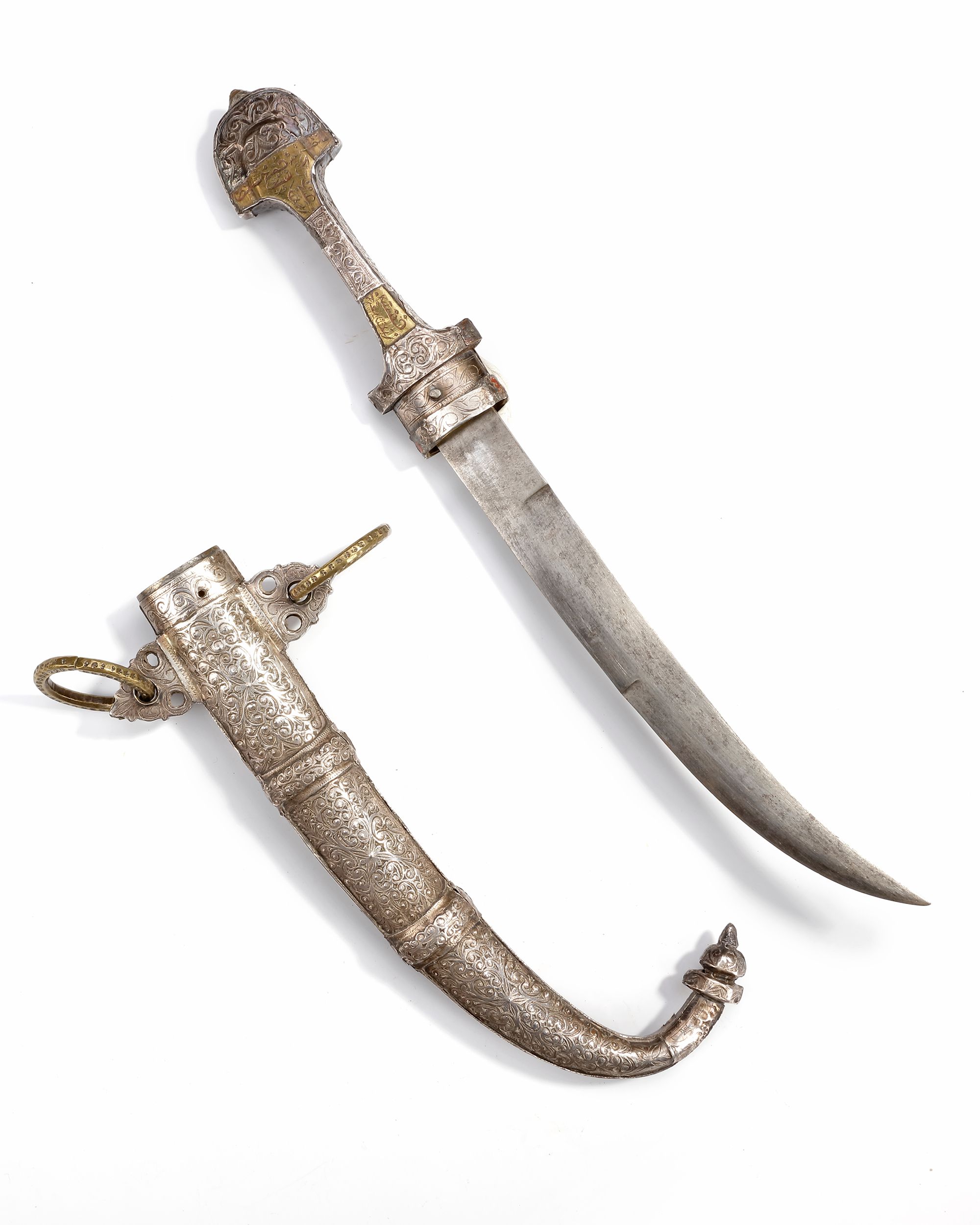 A finely crafted Moroccan dagger with a richly engraved silver hilt and sheath. The handle and scabbard are adorned with intricate scrolling floral motifs, highlighted with touches of enamel decoration. The curved blade rests in an ornate sheath fitted with suspension rings.