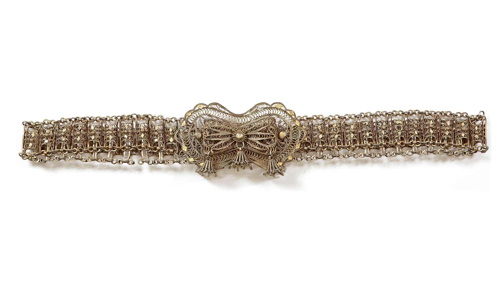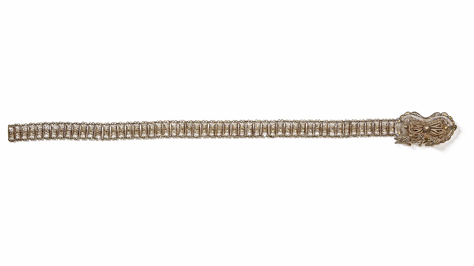With intricate filigree work and a large ornate clasp with tassel details. 80 by 4 cm. 181 gr. THE DR. SAAD AL-JADIR COLLECTION