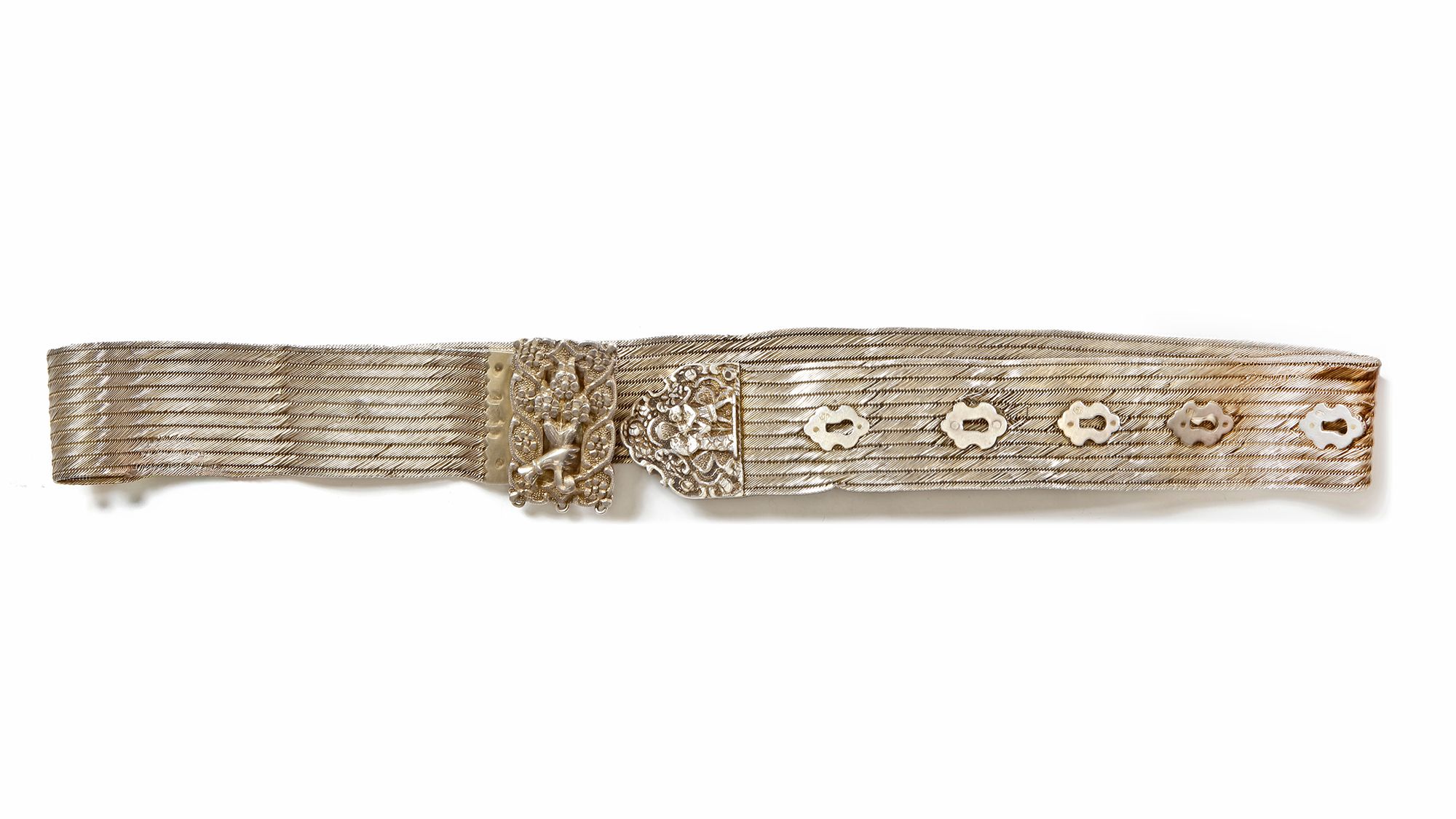 With woven silver strands, ornate floral and figurative motifs on the clasps. 93 cm. 439 gr. THE DR. SAAD AL-JADIR COLLECTION