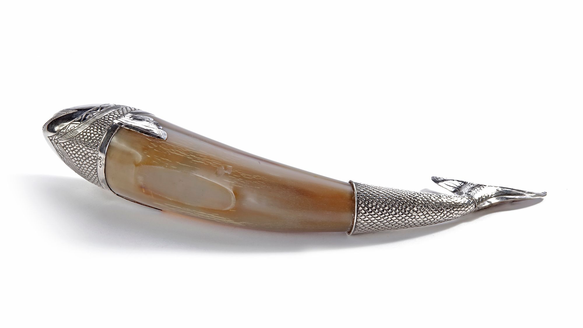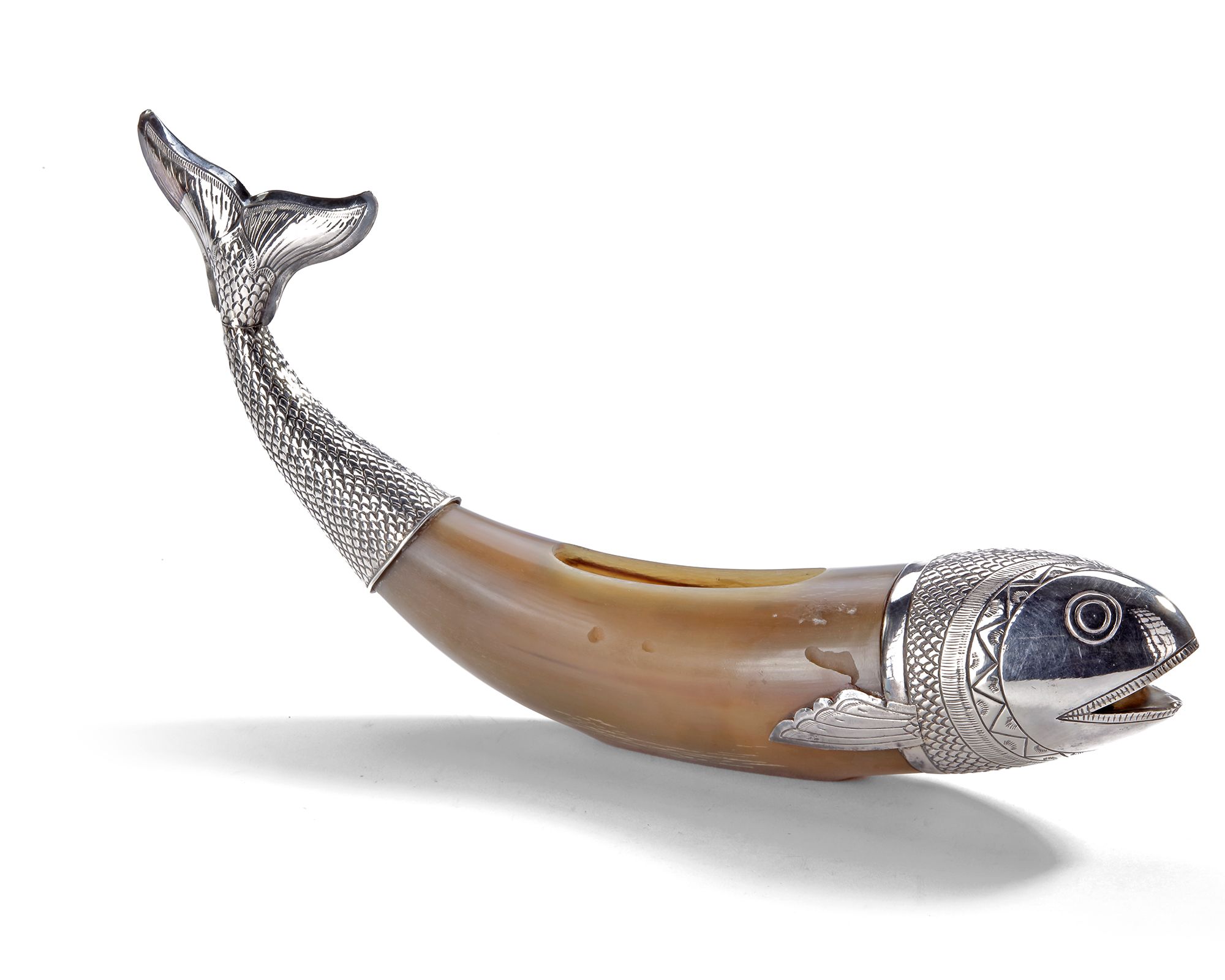 A finely crafted ceremonial vessel fashioned from a polished horn, mounted with silver in the form of a detailed fish. The head, fins,