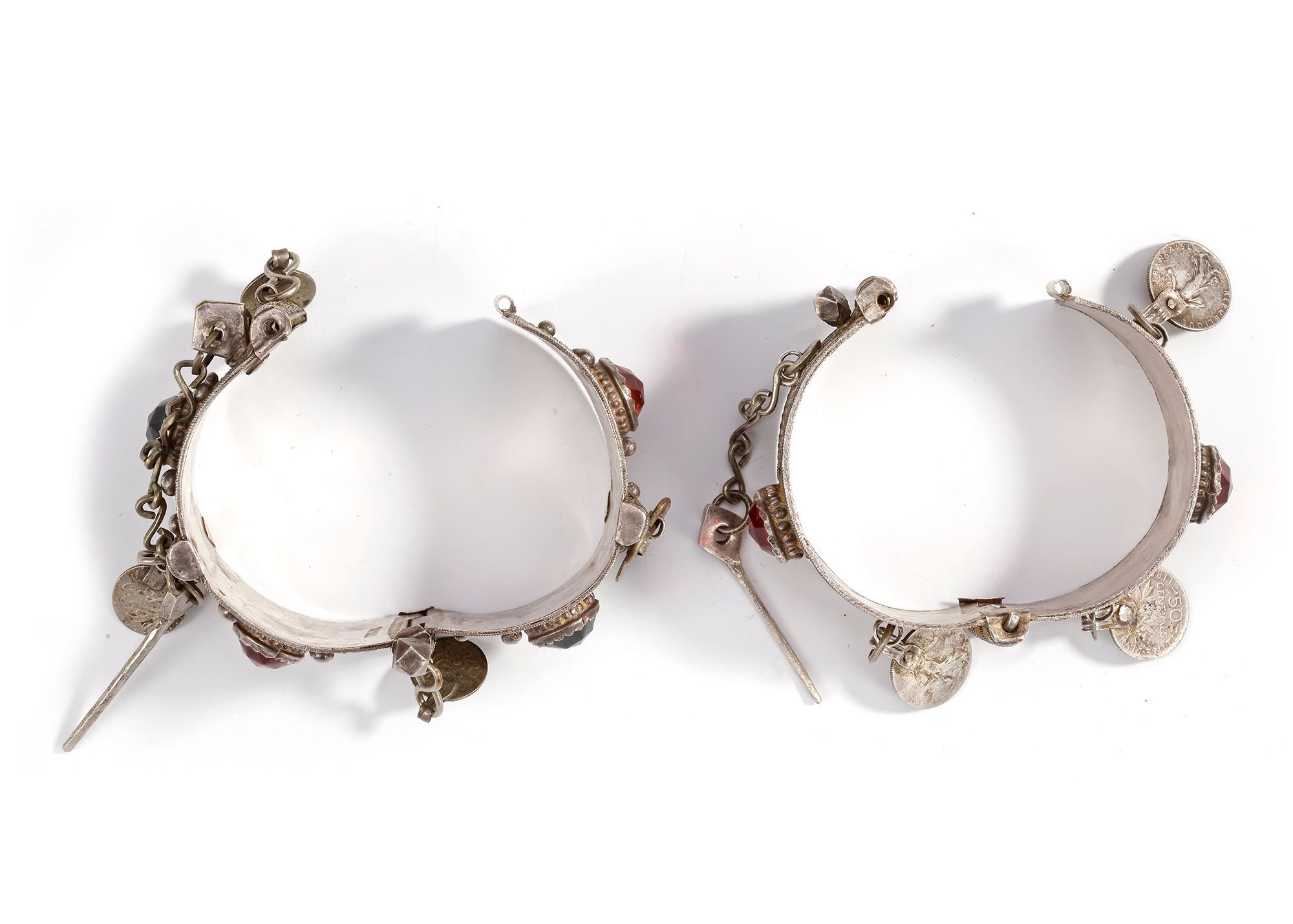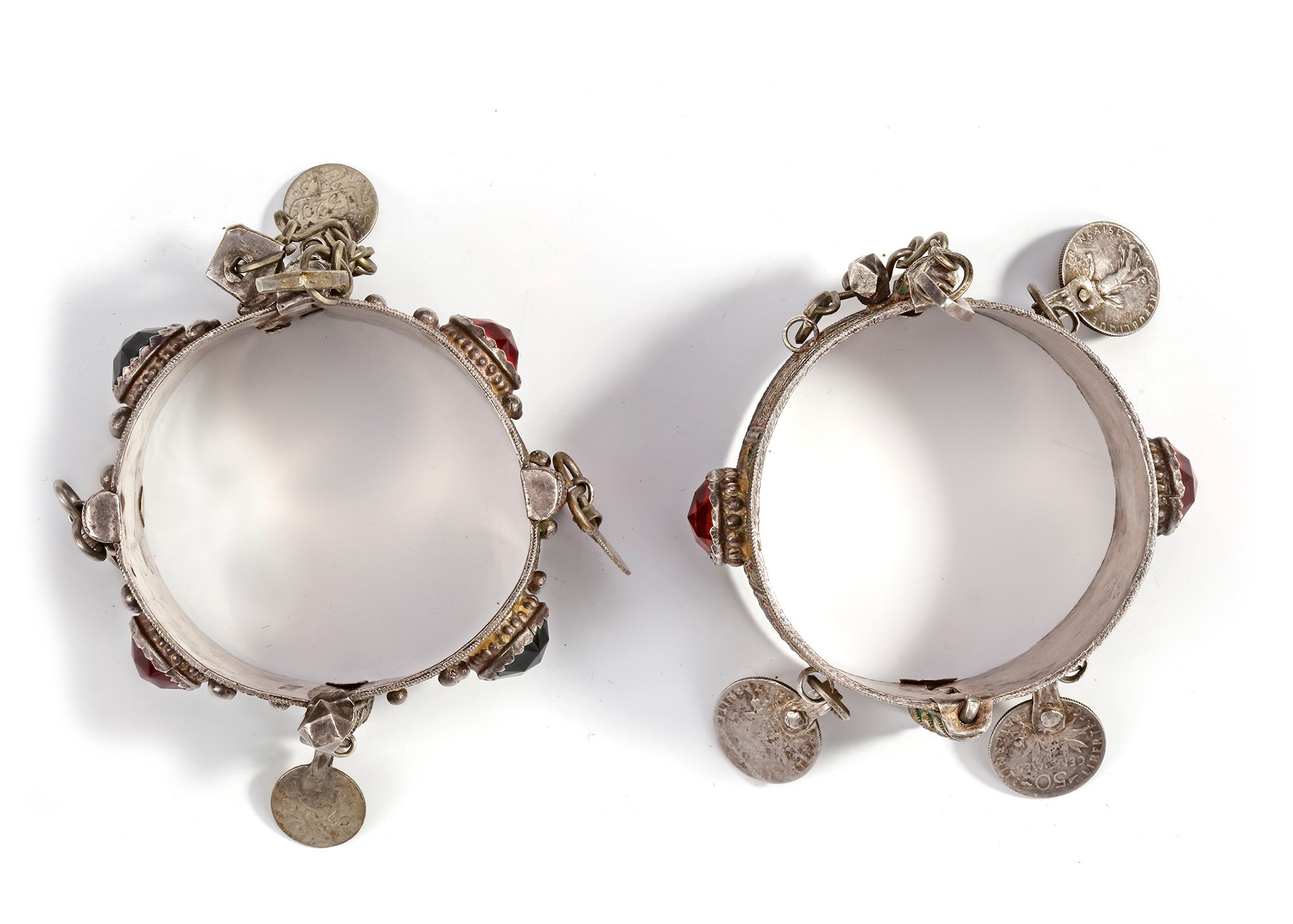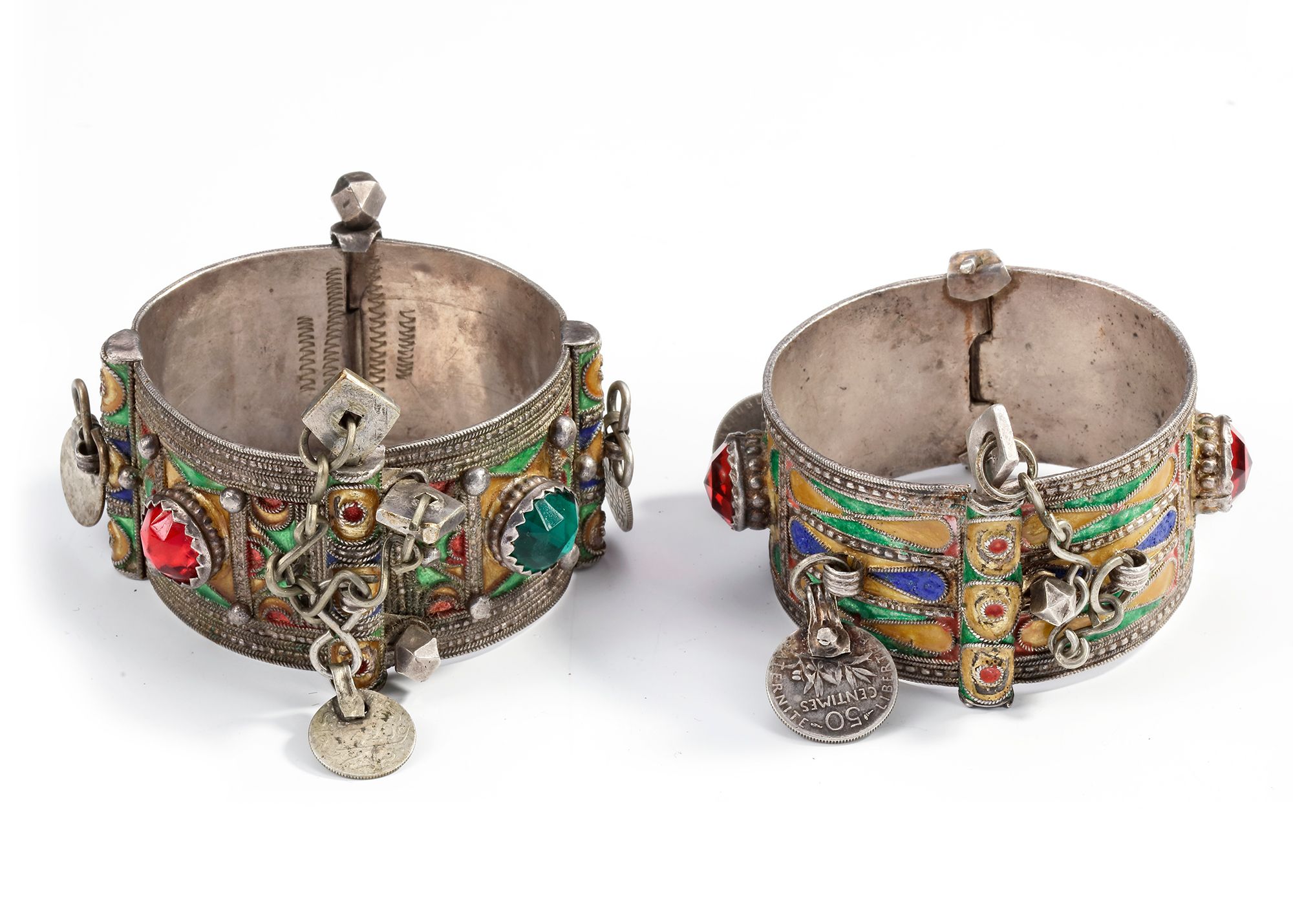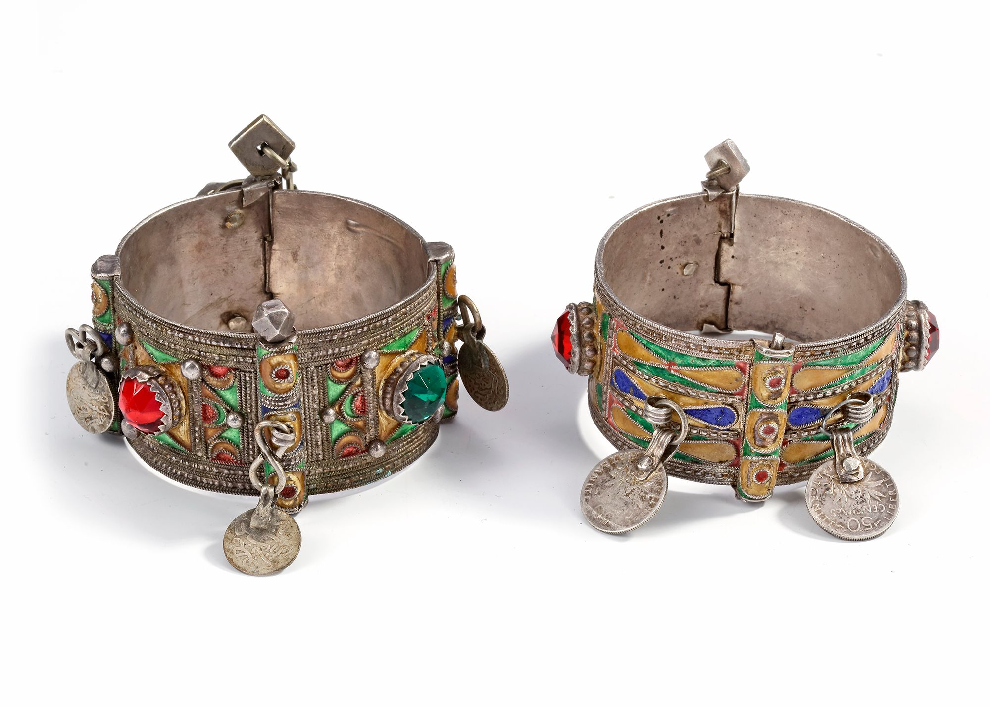 Colorful enamelled silver bracelets set with glass stones and coin pendants. 7 by 4 cm. 194 gr. THE DR. SAAD AL-JADIR COLLECTION