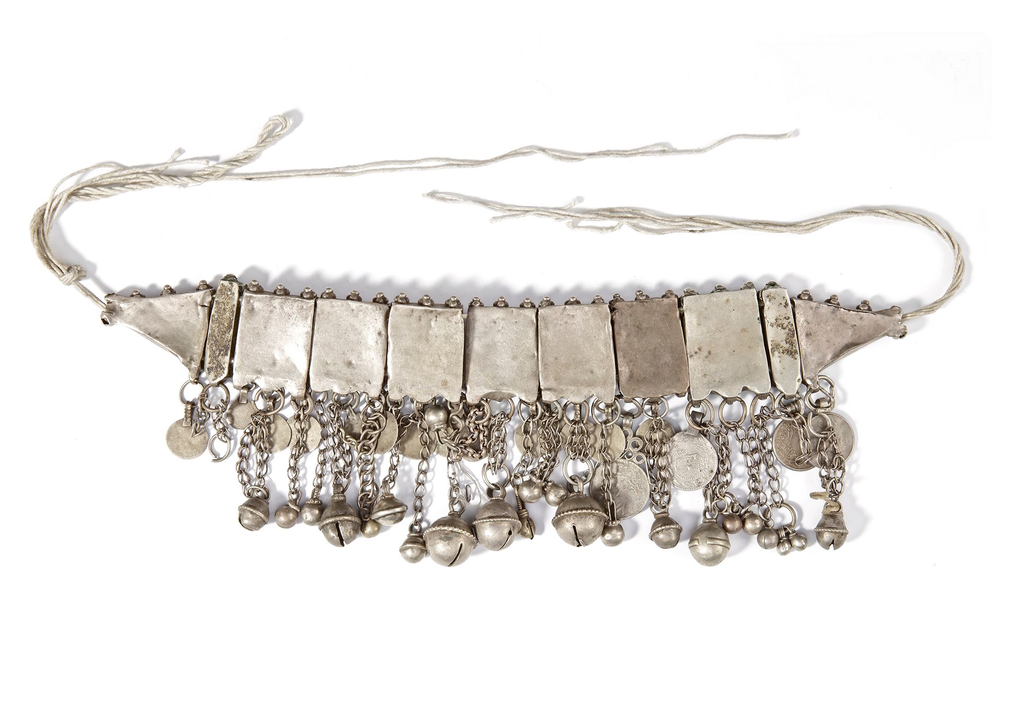 Traditional Yemeni necklace with carnelian stones, coin pendants, and dangling bells, richly crafted in silver.