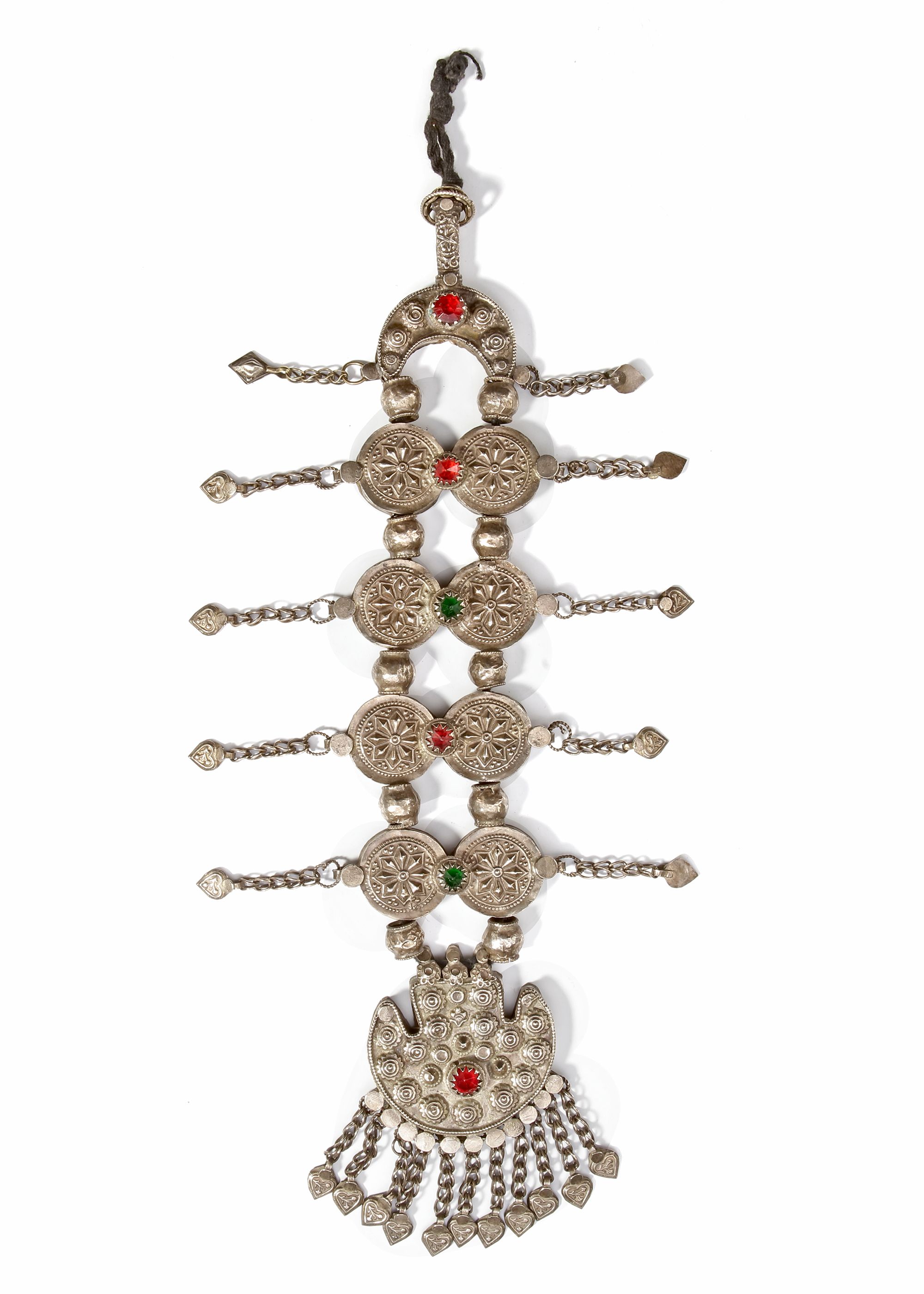 Richly decorated with engraved medallions, colored glass insets, and dangling chains. The design includes protective motifs such as the Hamsa hand, symbolizing blessings and protection.