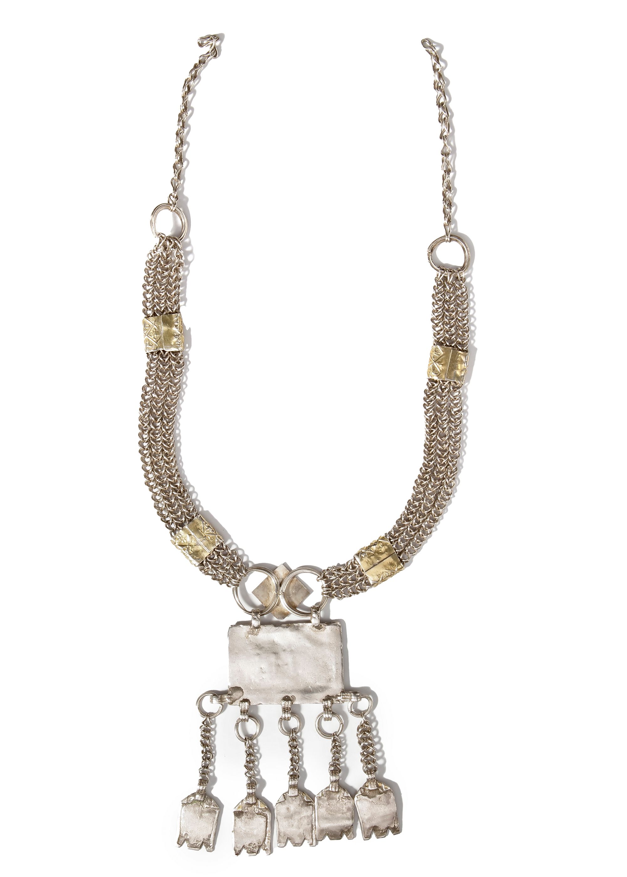 A finely crafted Omani silver necklace, richly decorated with geometric and floral motifs, highlighted with partial gilding. The central rectangular pendant is adorned with intricate patterns and suspends five smaller dangling elements, each engraved with symbolic designs.
