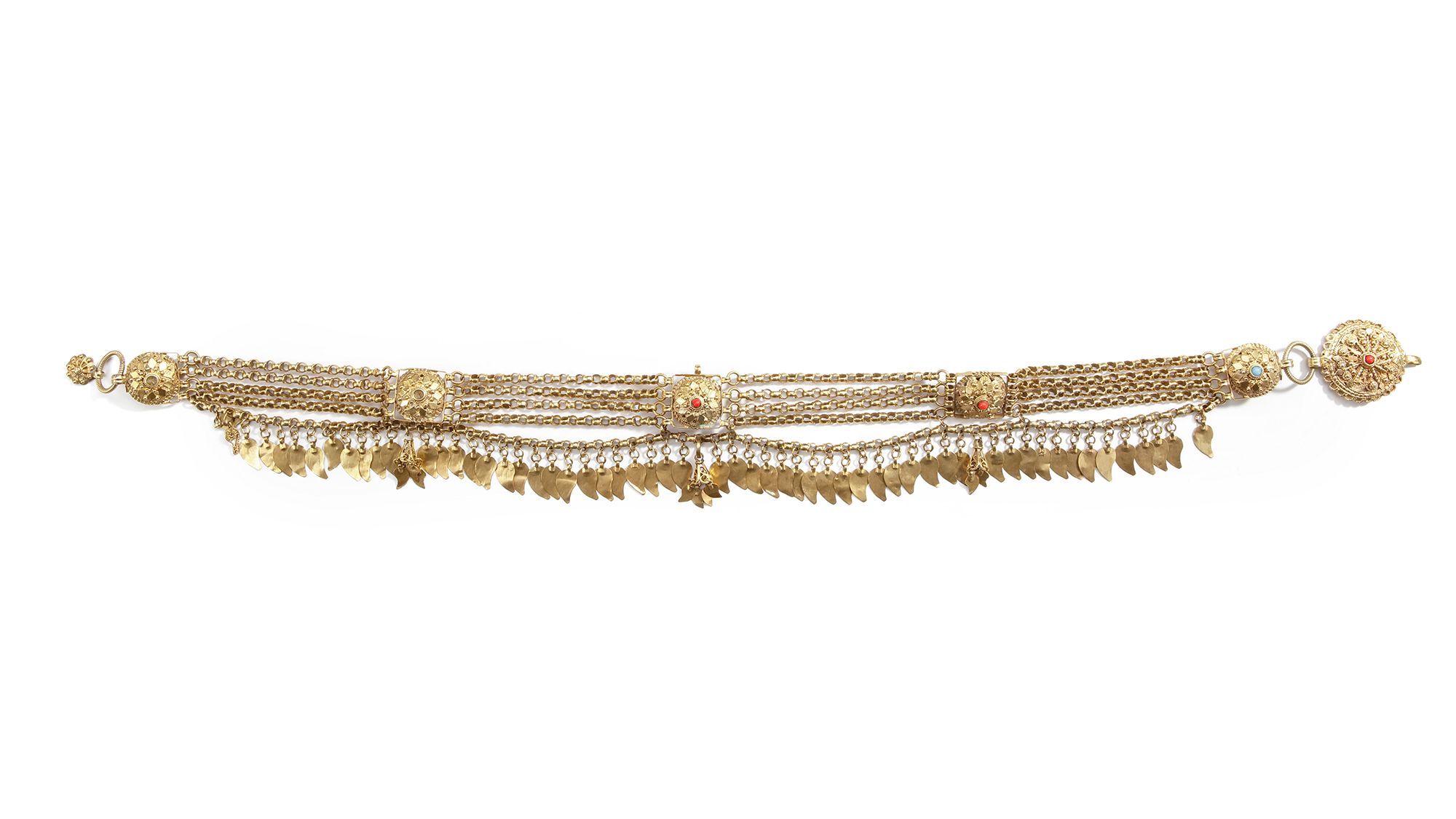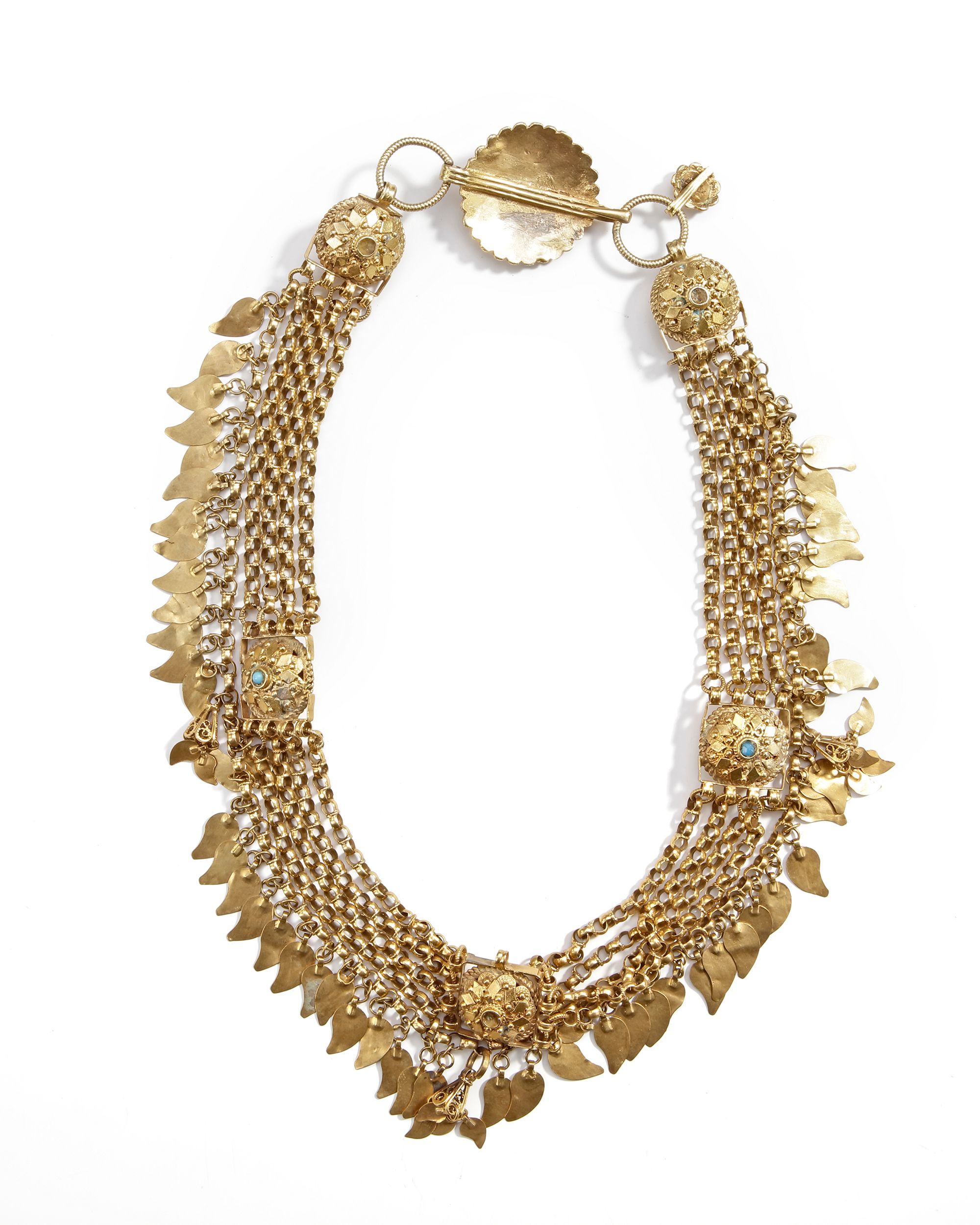 With filigree medallions set with colored stones in red, turquoise, and dark glass. Multiple chains and dangling leaf-shaped pendants create movement and shine.