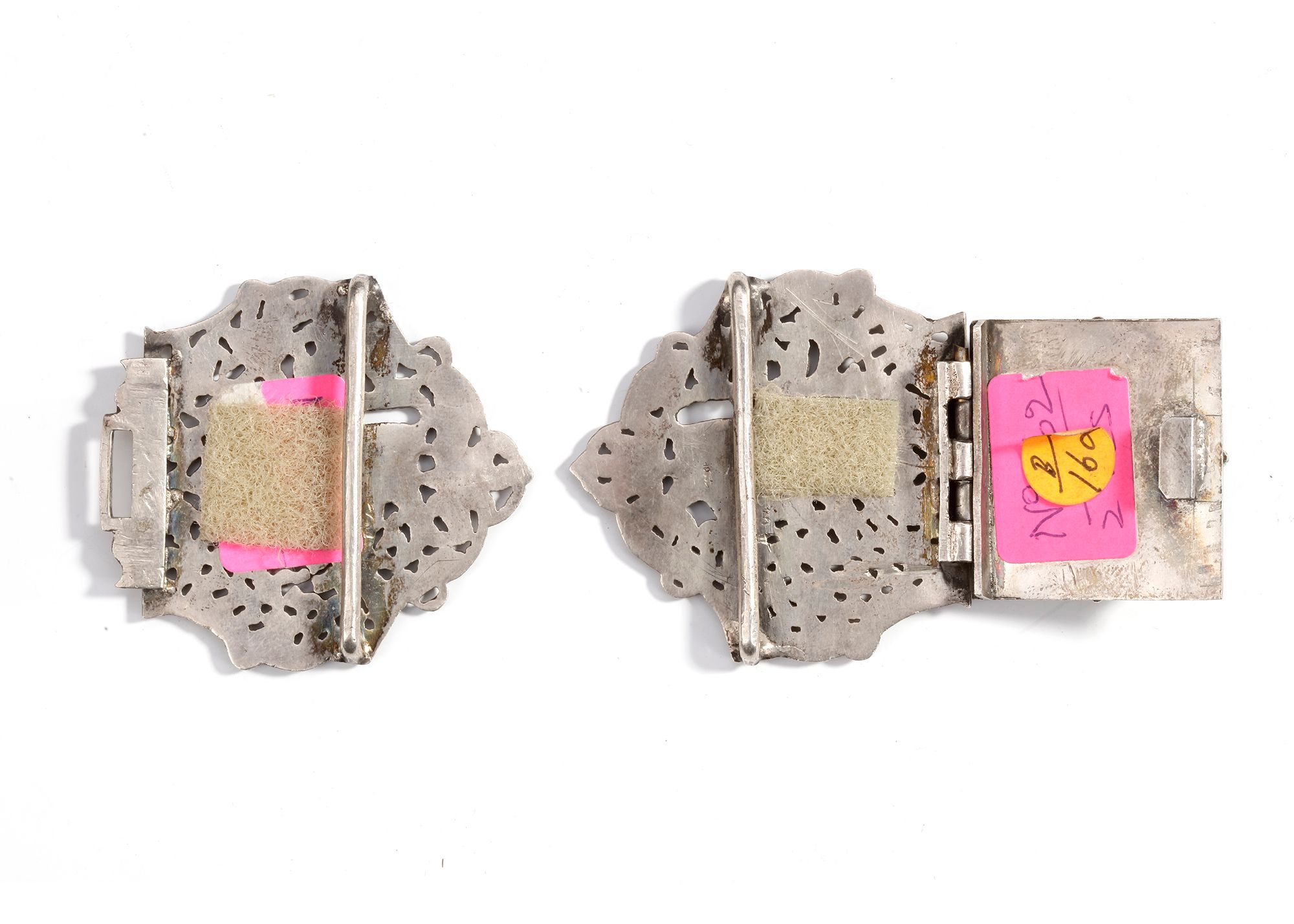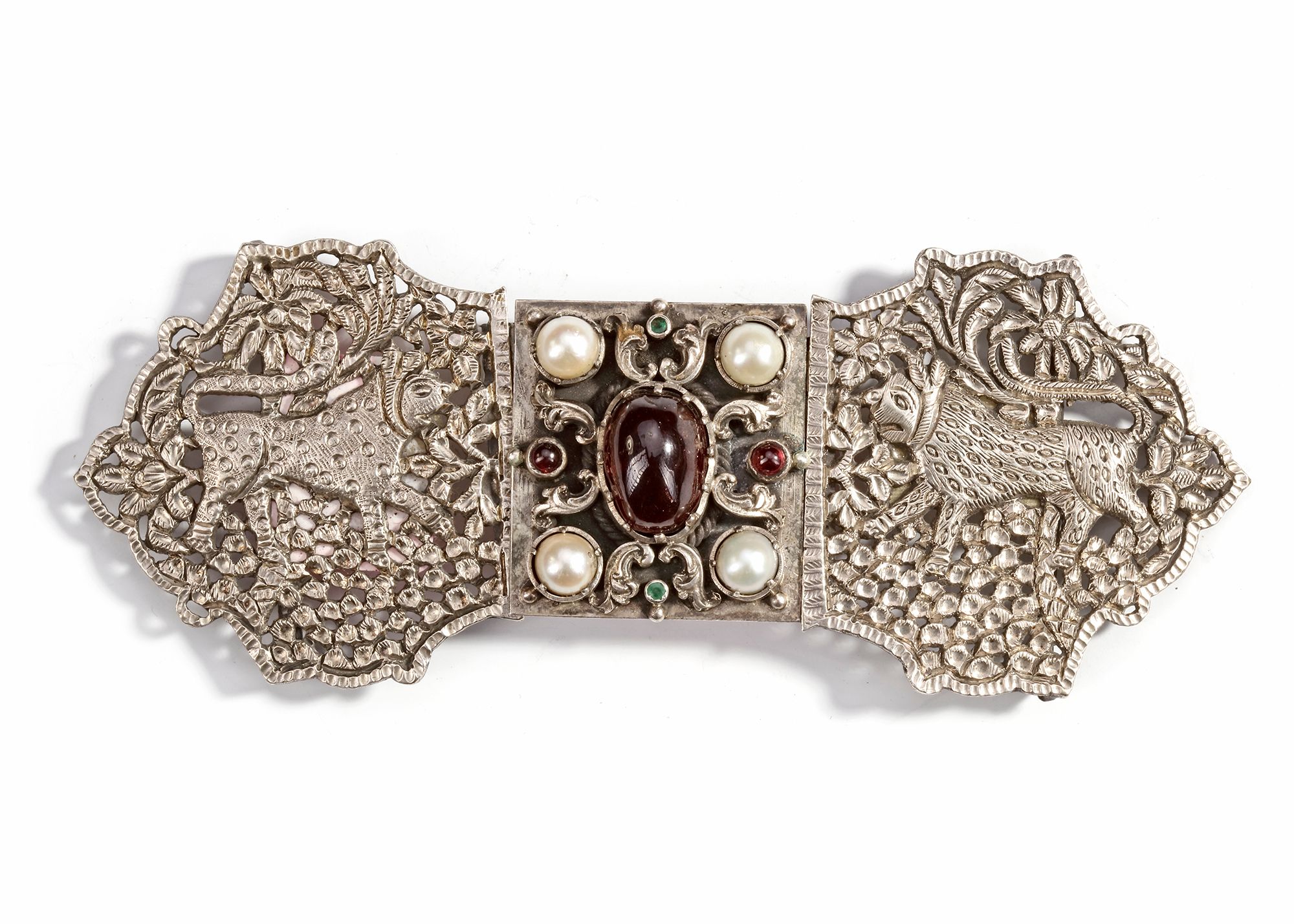 Finely crafted with pierced floral and animal motifs depicting leopards among foliage. The central section is richly adorned with pearls, garnets, and green stones.