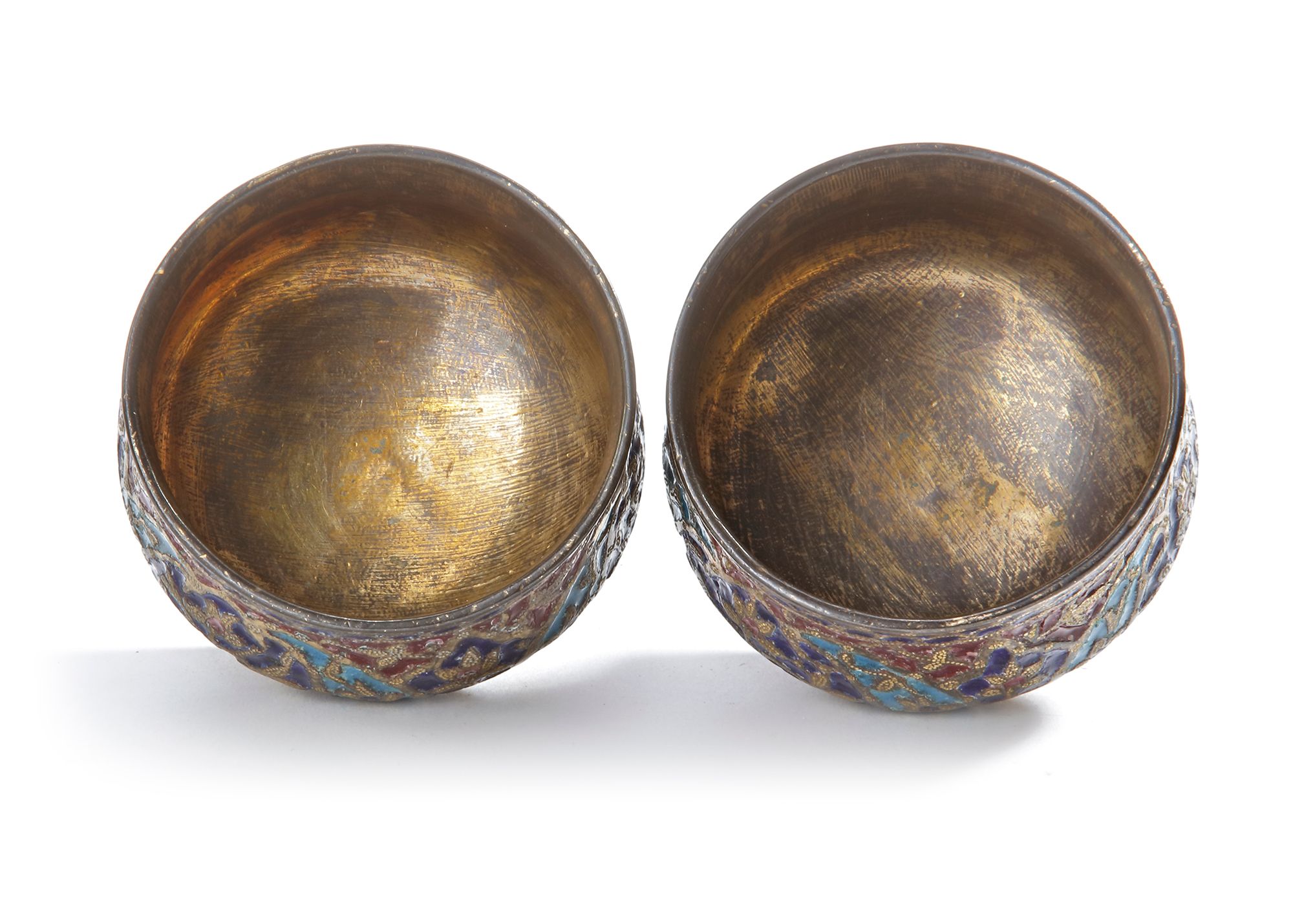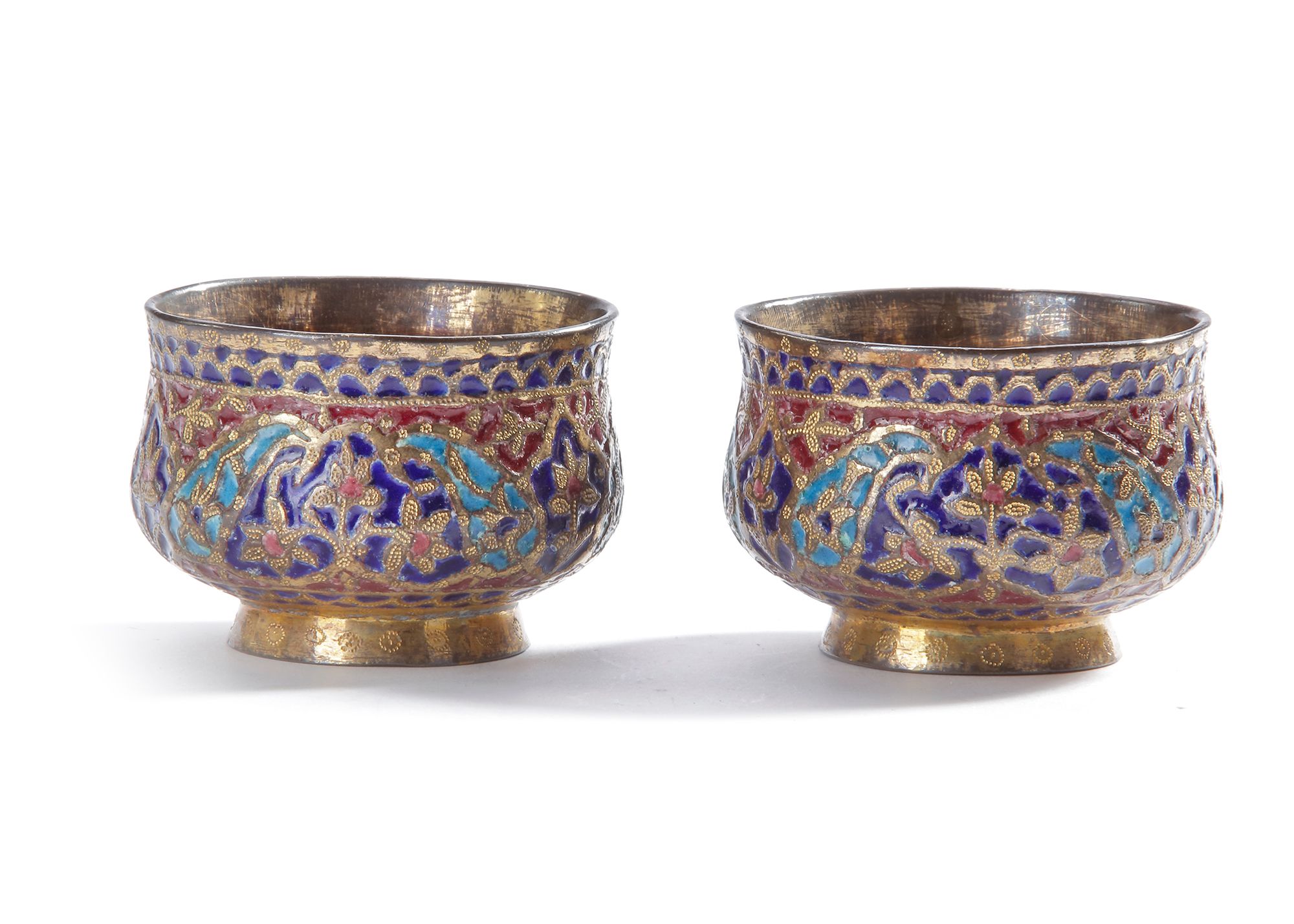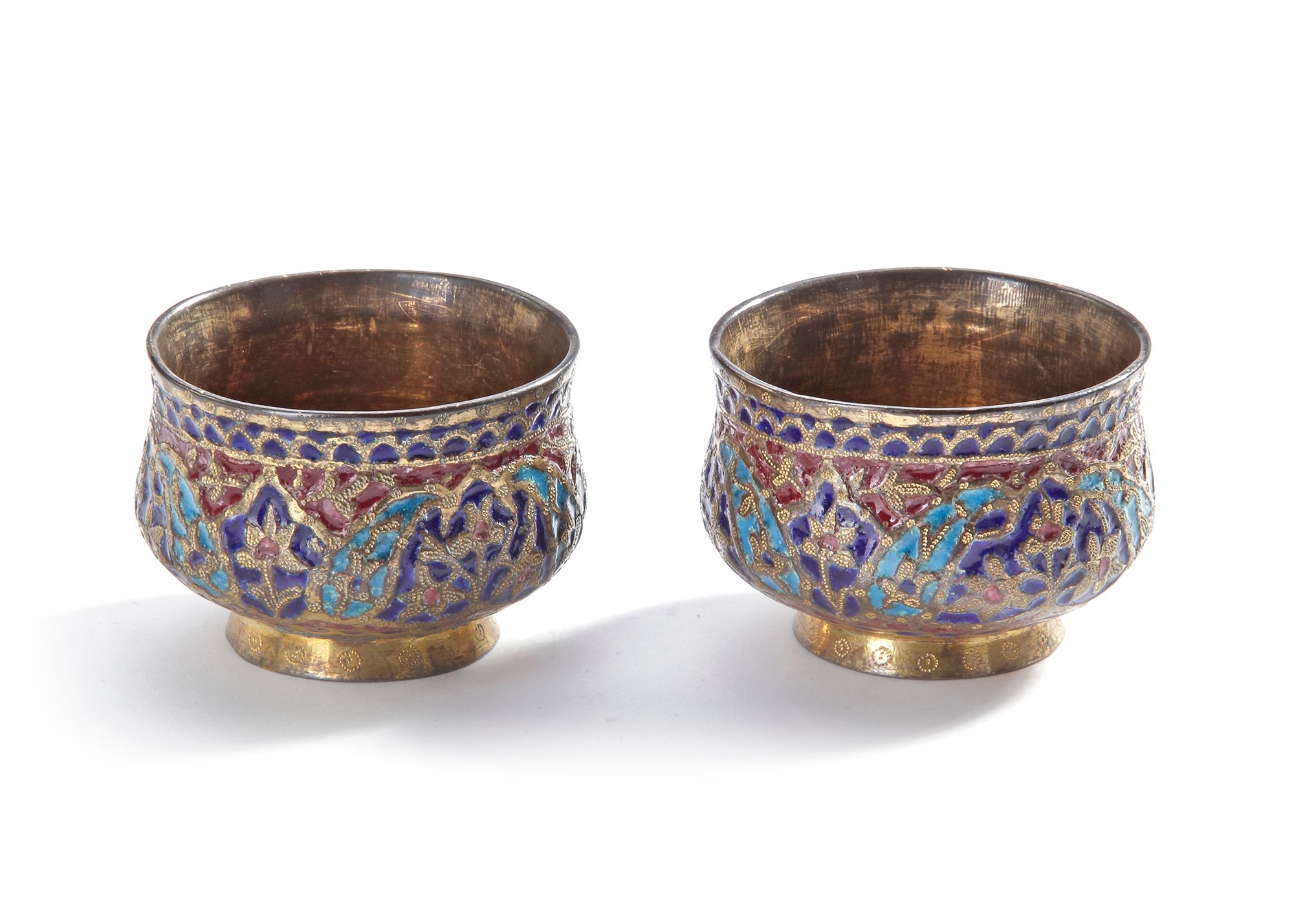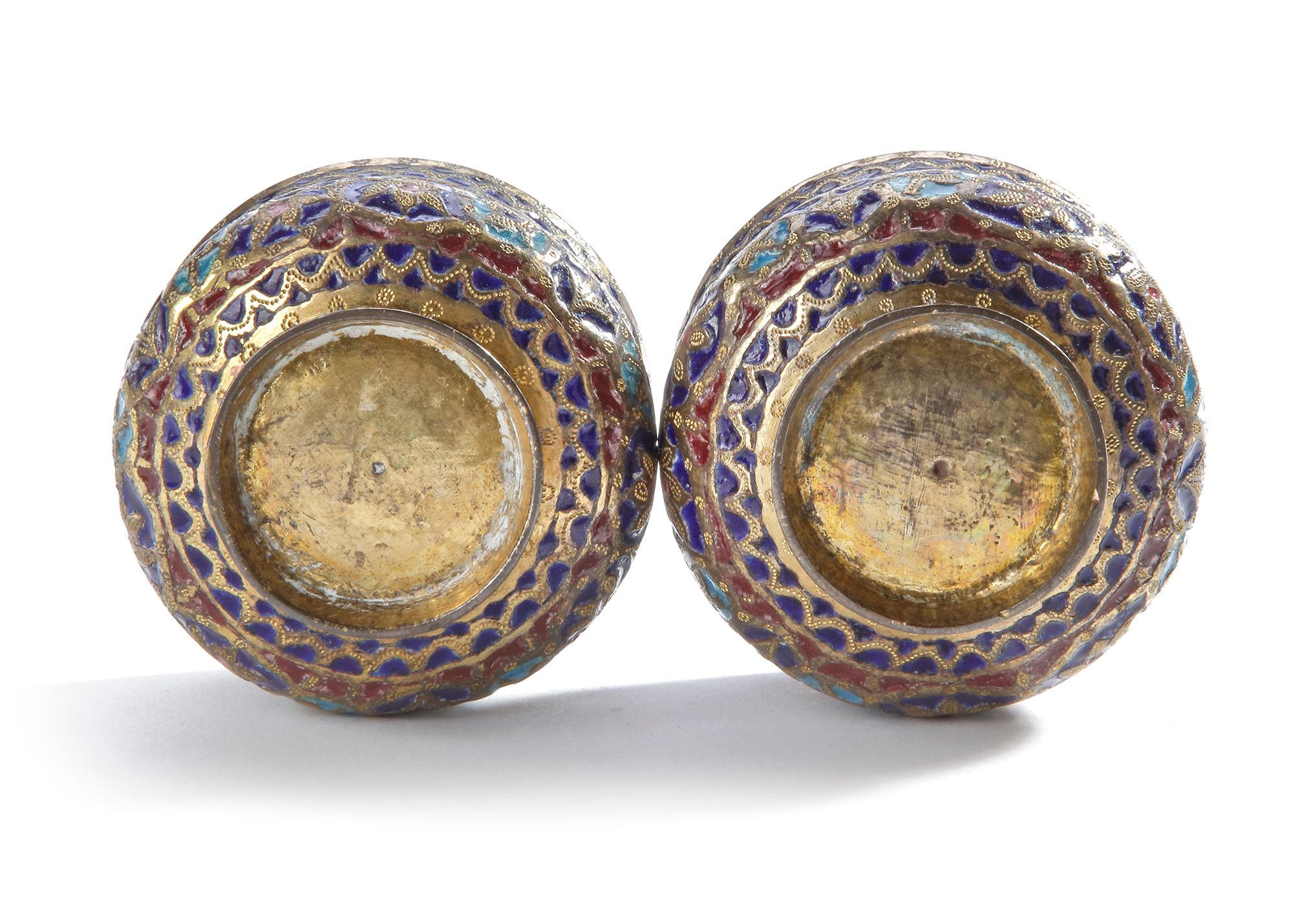 Richly decorated with vibrant polychrome enamel in floral and geometric motifs. The interiors are gilded. 6 by 4 cm. 224 gr.
