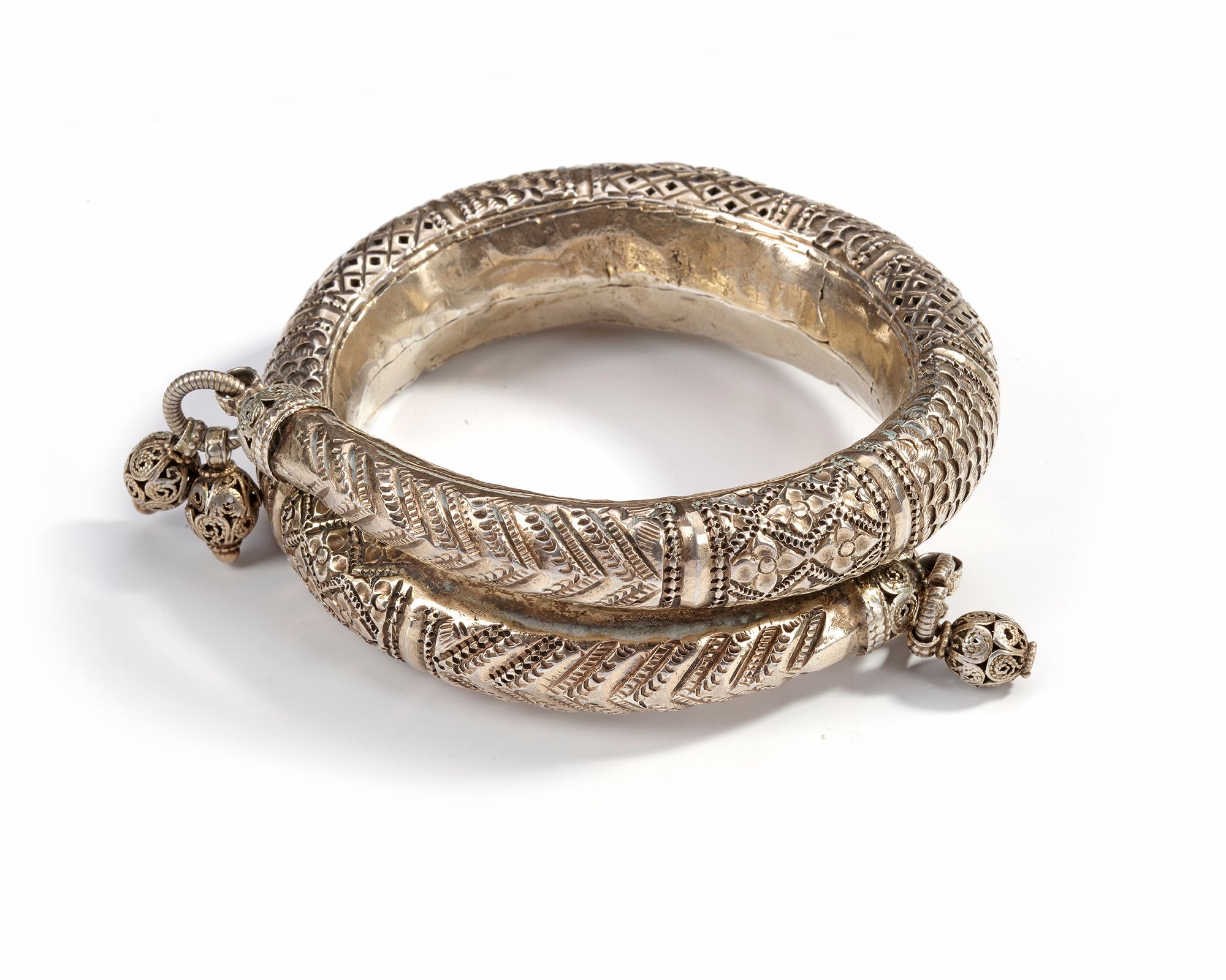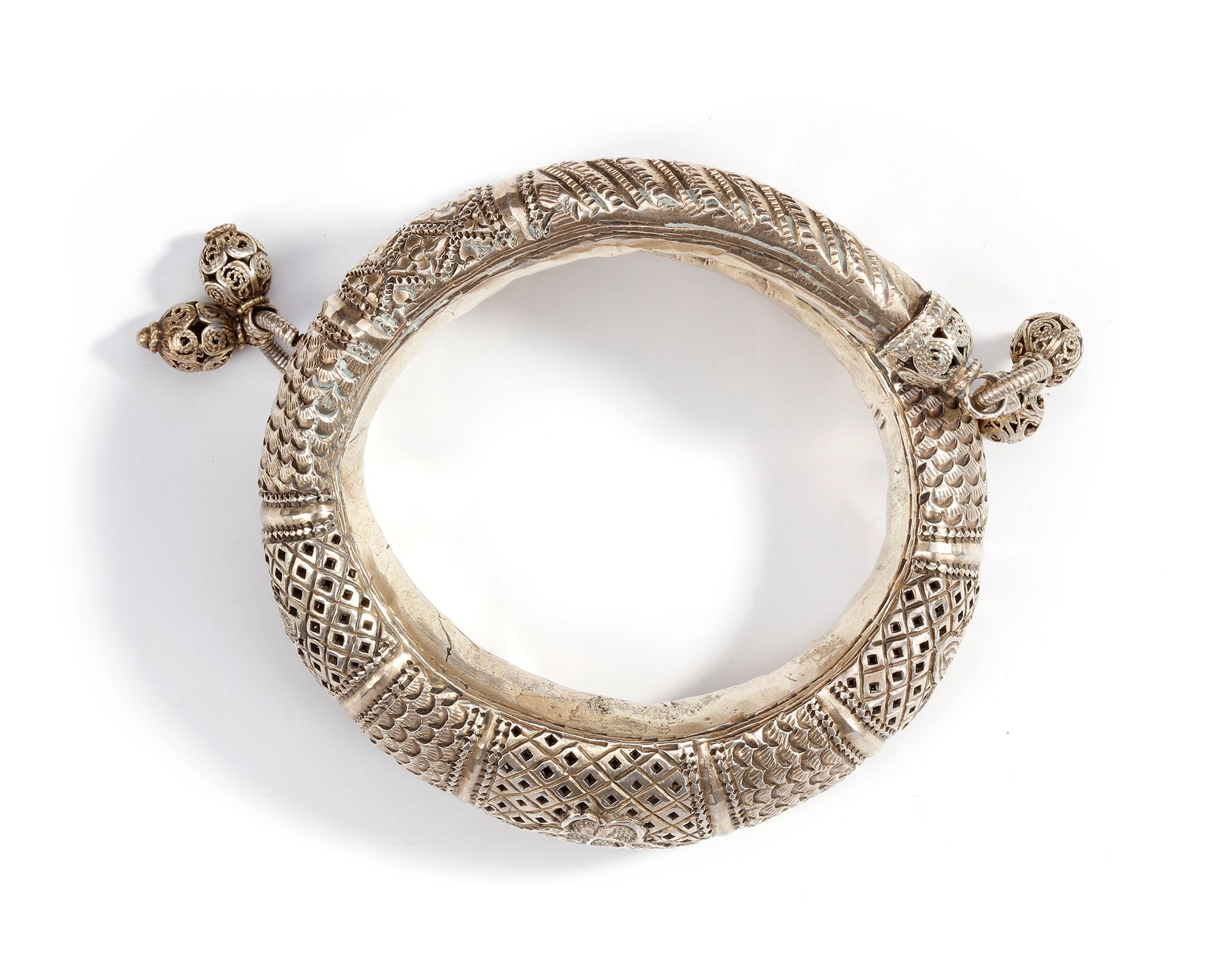 Richly decorated with engraved geometric and floral patterns. The piece features bold repoussé designs, intricate filigree details, and hanging silver spheres.