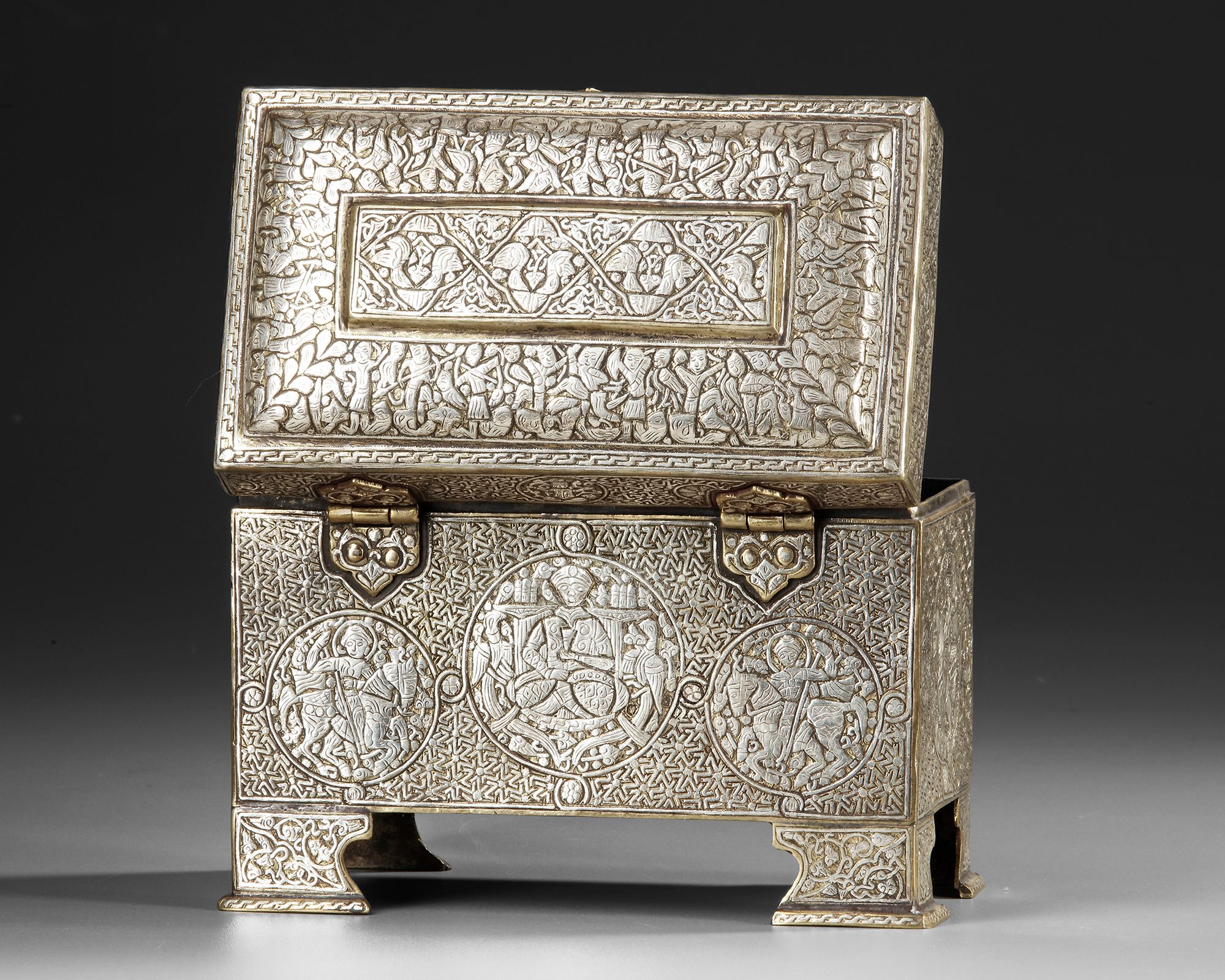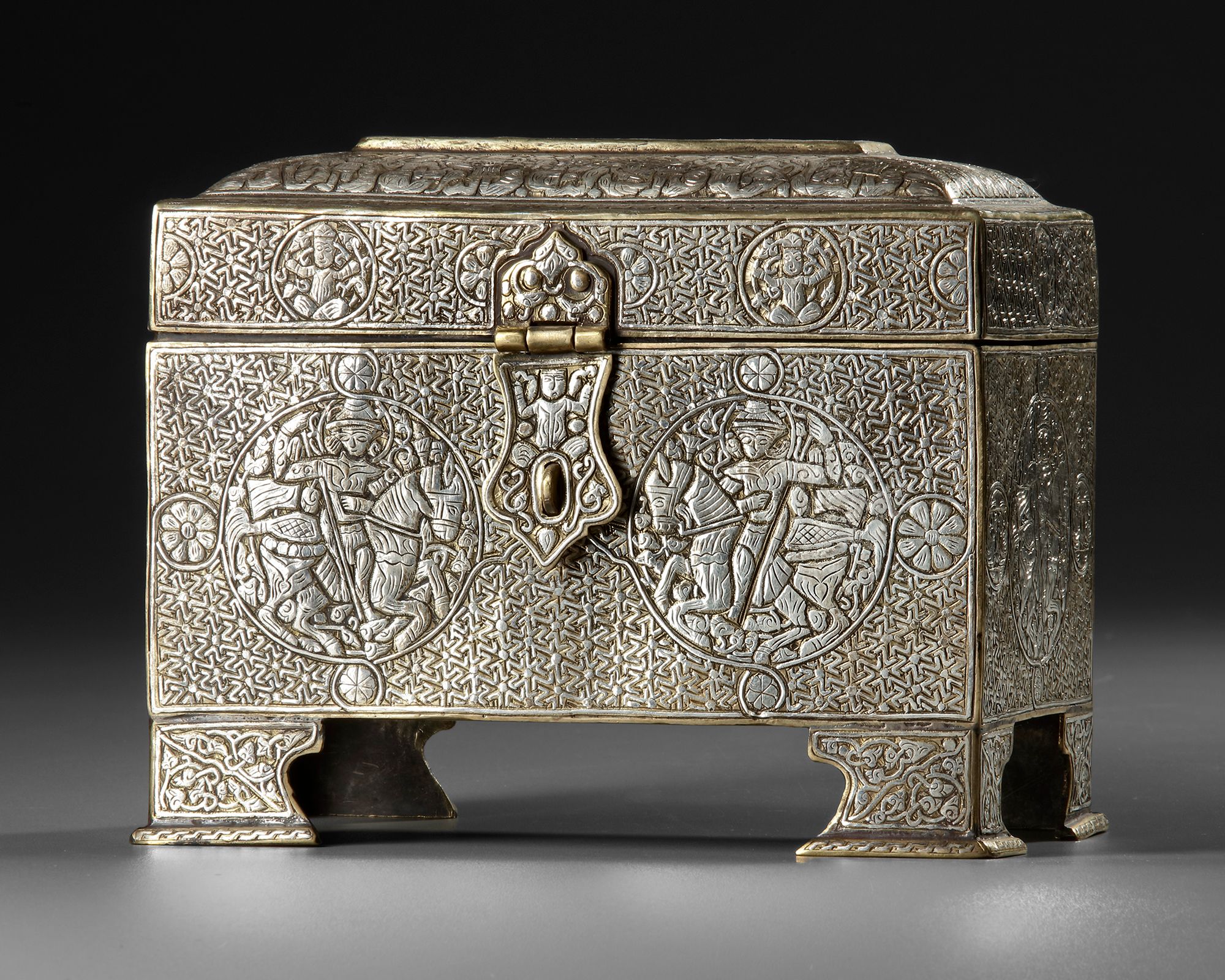 Of rectangular form, this intricately crafted brass box features a hinged, coffered lid and rests on four shaped feet. The surface is richly decorated with silver-inlaid roundels, each enclosing princely horsemen figures in dynamic poses. The lid is adorned with a central panel filled with stylized floral motifs, bordered by a frieze depicting figures engaged in various scenes.