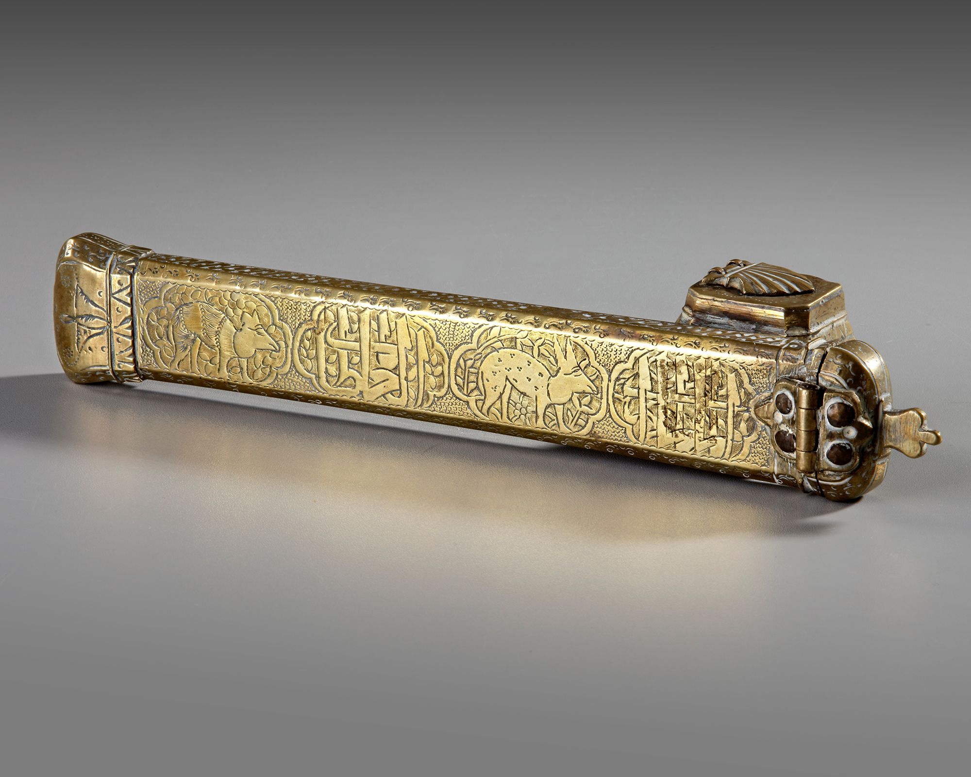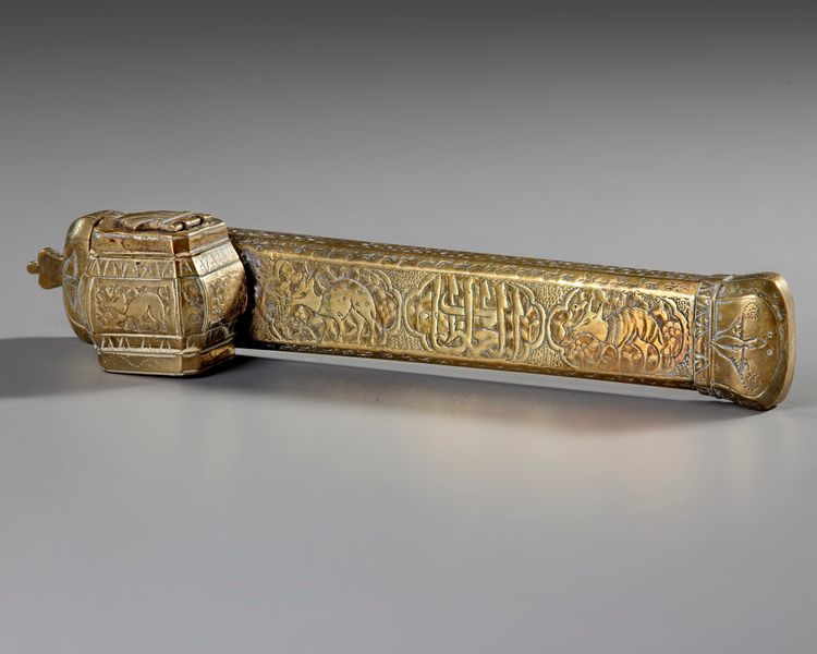 Of elongated form, featuring a bulbous, compressed inkwell, finely decorated with calligraphy and animal motifs. Length 23 cm.