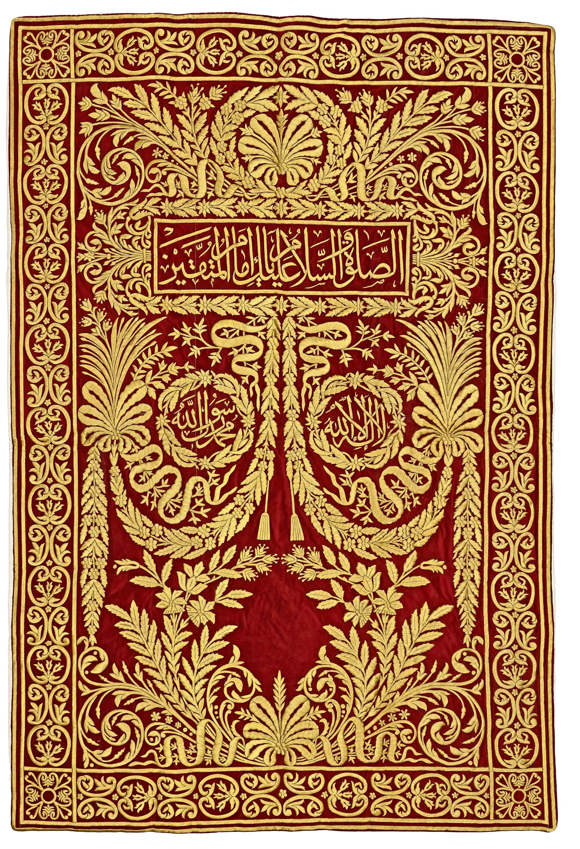 Inscriptions: "May peace and blessings be upon you, O Imam of the pious." Beneath this are two cartouches bearing the Kalimat al-Tawhid.