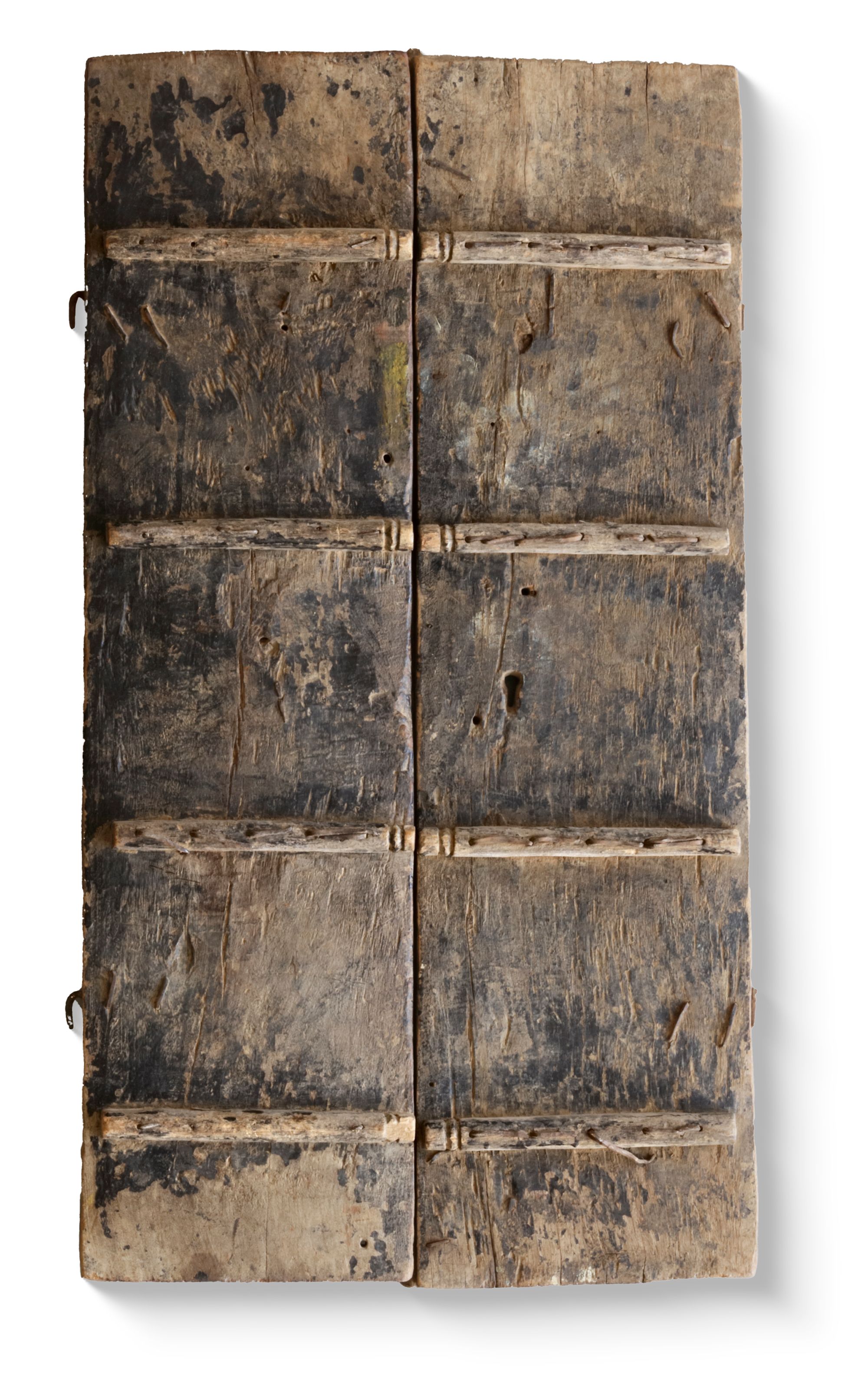 A pair of doors, crafted from aged, weathered wood. A central vertical bar with ornate finials reinforces the structure. The door is constructed in two panels, joined in the middle, each adorned with ring-shaped metal handles, typically used as knockers. 100 by 55 cm.