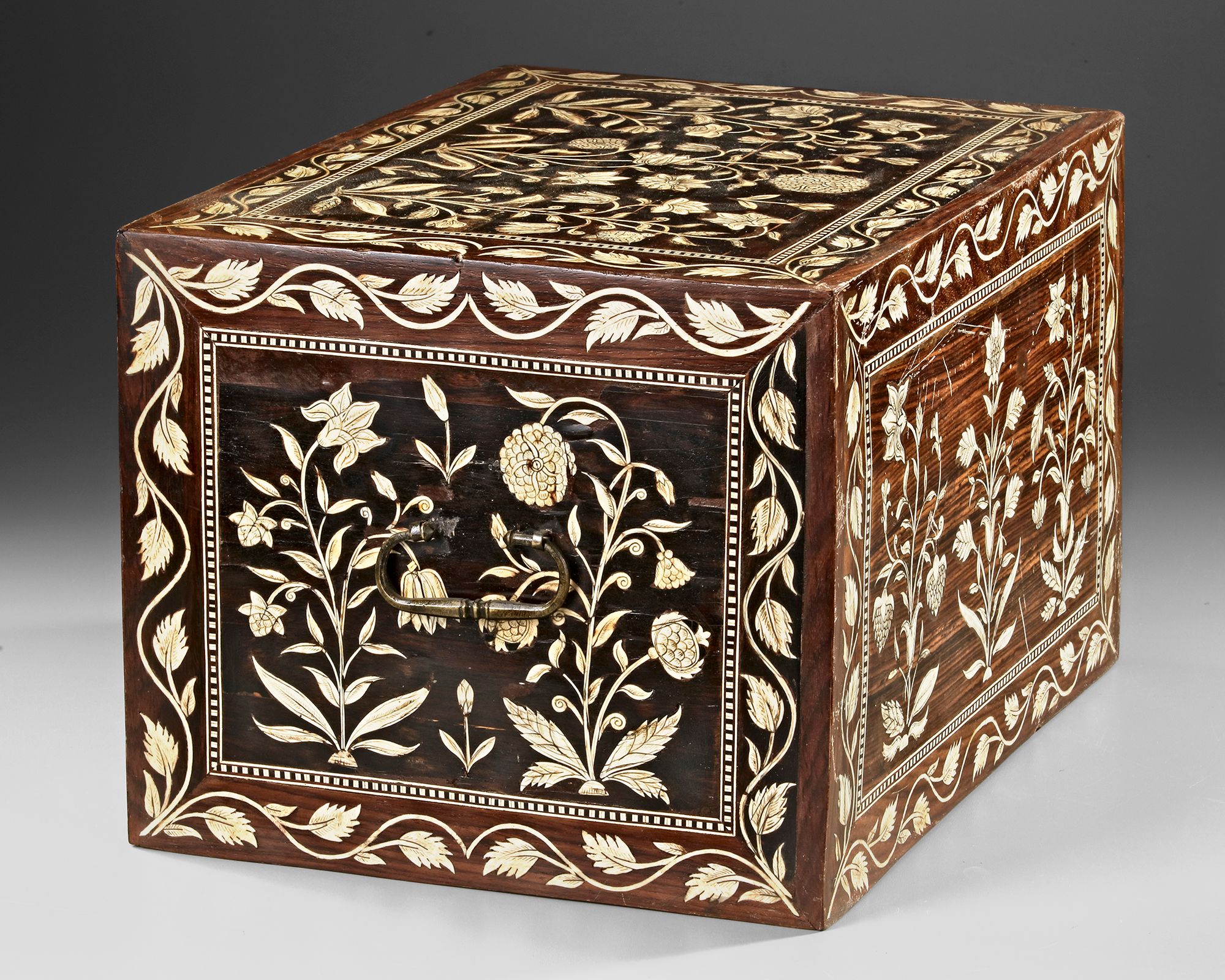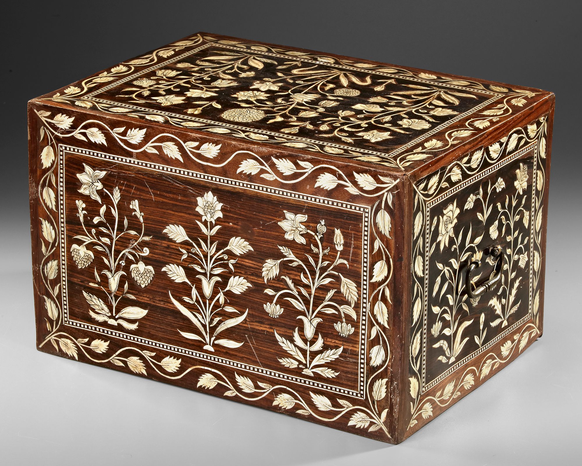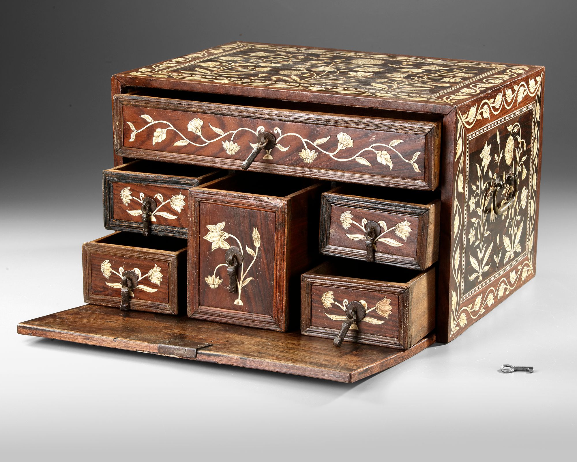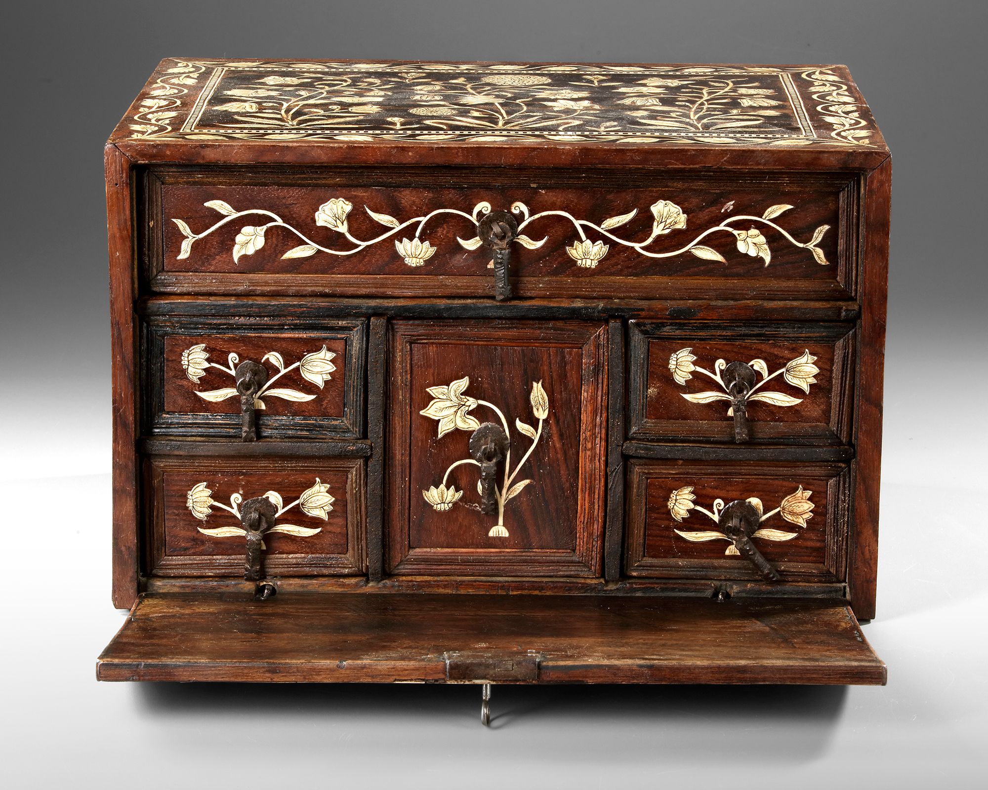 The two-handled box with ring hinged drop front revealing seven interior drawers, front inlaid with floral pattern with border of stylized flowers, same border to each side and top framing diaper pattern, drawer fronts with ring pulls centered on framed bone panels with concentric circles.