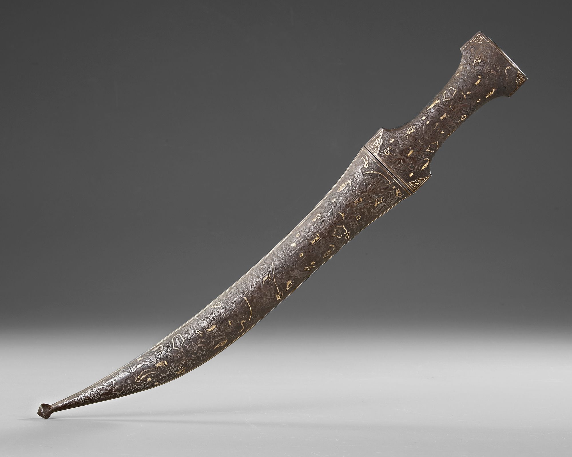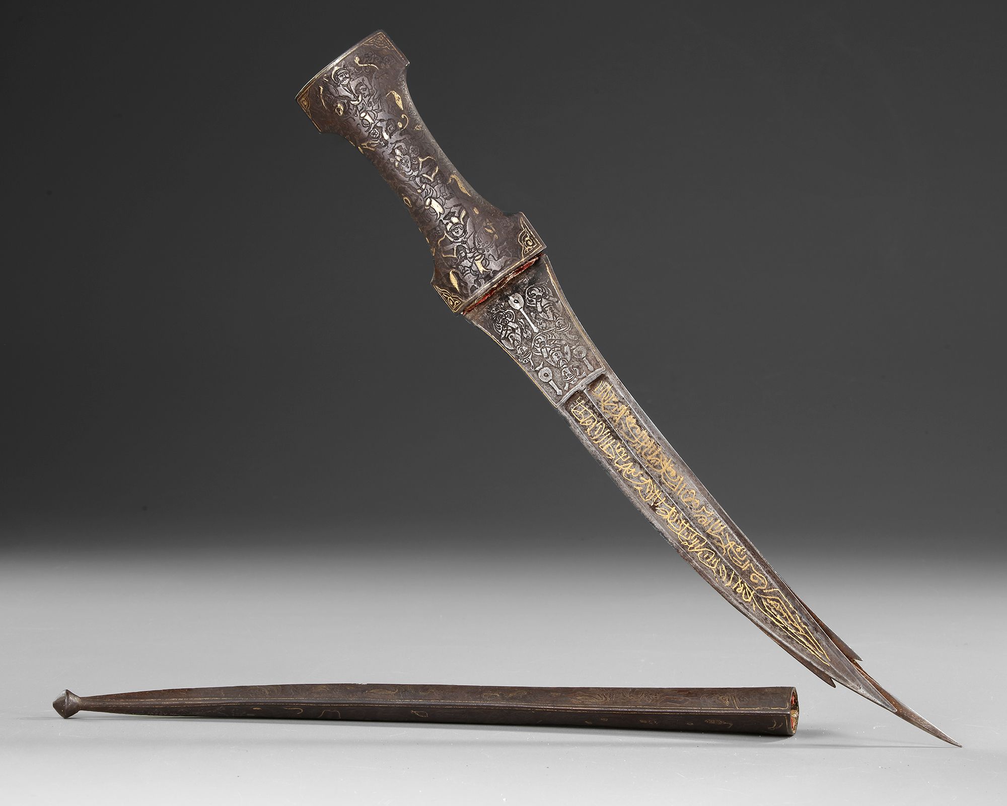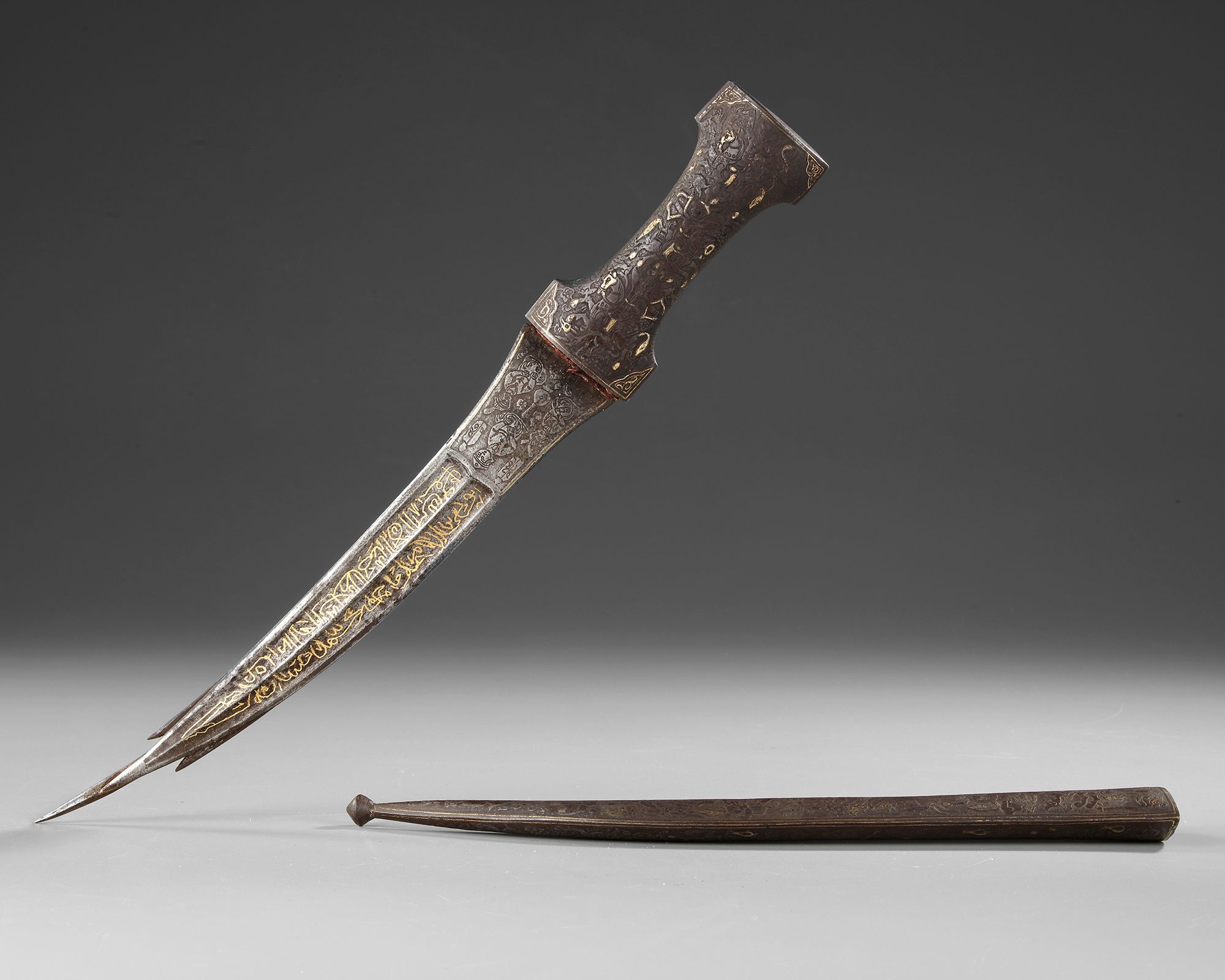 A Persian steel dagger with a curved, double-edged blade featuring a pronounced central ridge and a distinctive split, or forked, tip. The lower section of the blade bears gold-inlaid inscriptions in nasta‘liq script. Both the hilt and sheath are crafted from steel and lavishly engraved and gilded with figural and animal hunting scenes, a motif closely associated with Persian royal imagery. The decoration depicts princely horsemen surrounded by an array of animals and birds, evoking themes of nobility, power, and refinement.