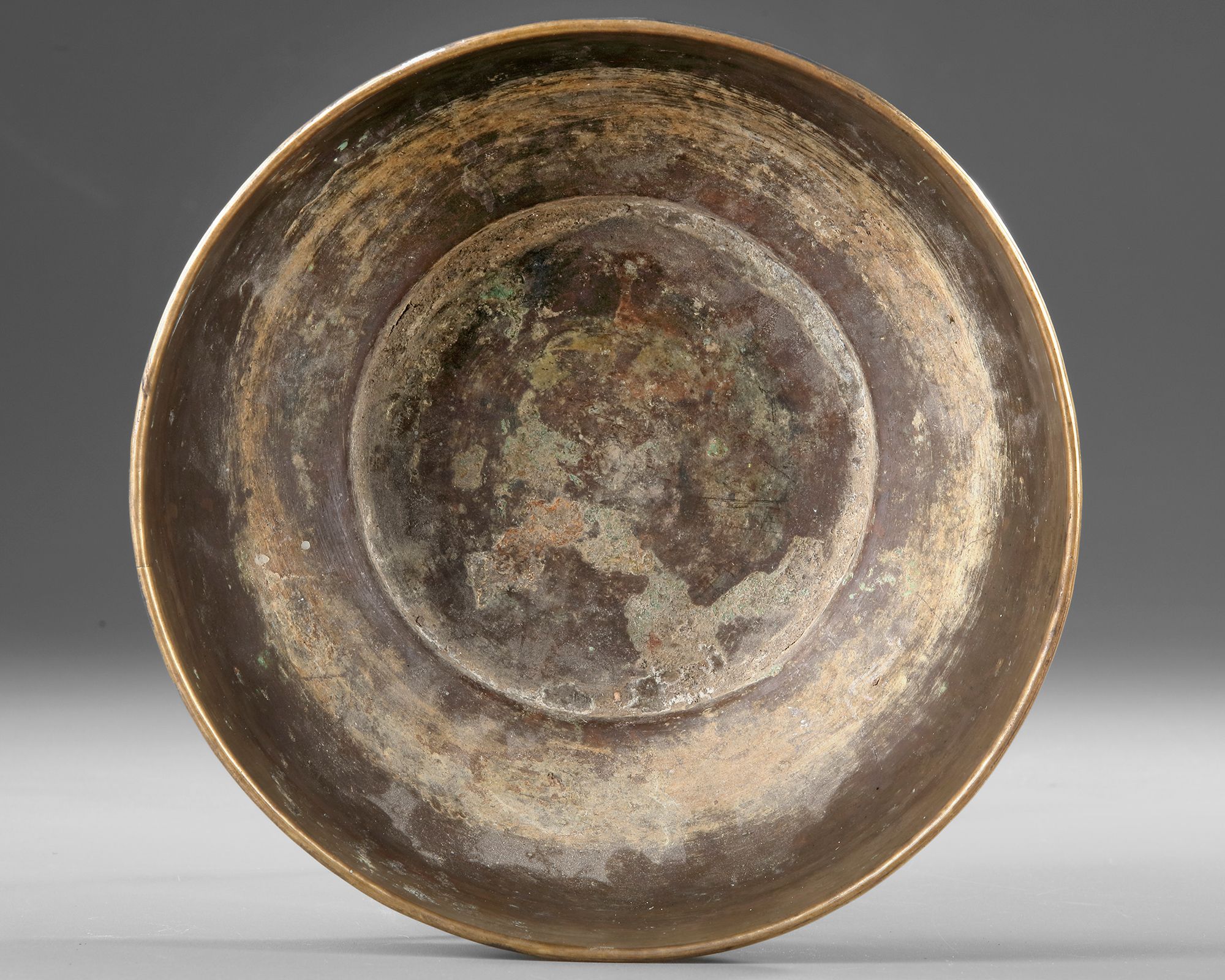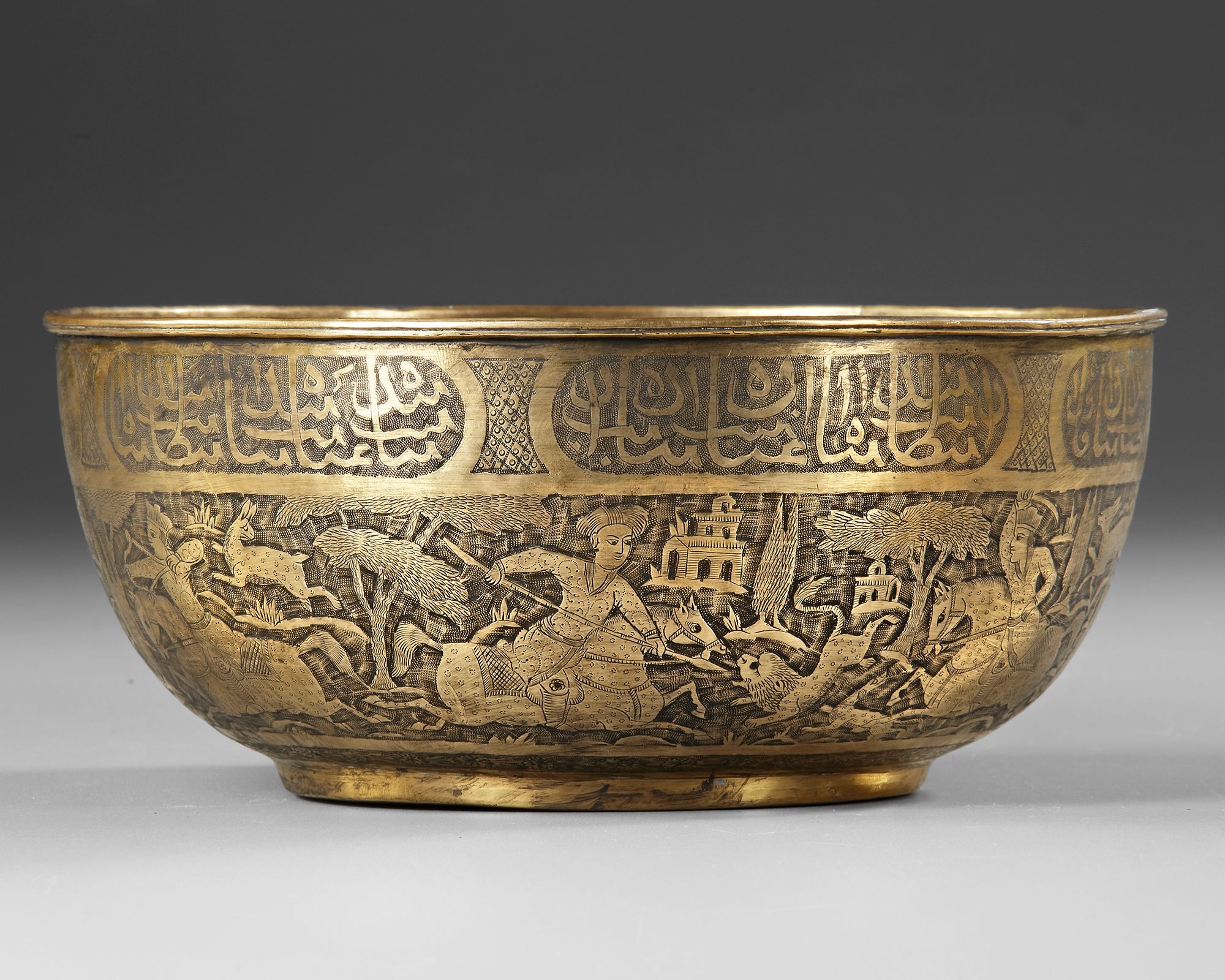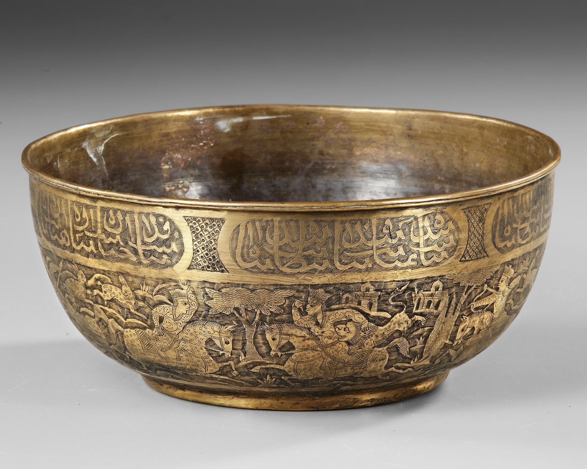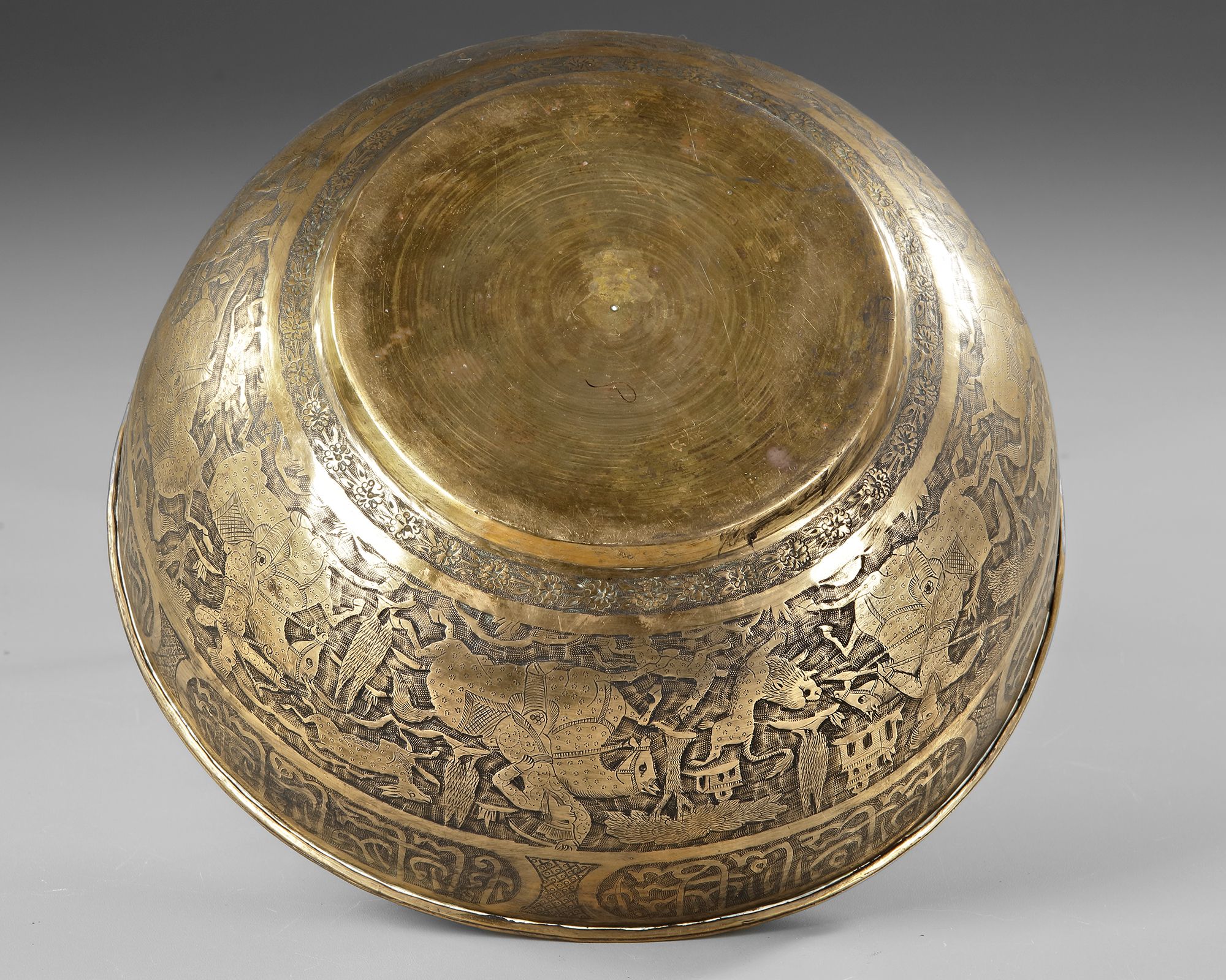 A Persian brass bowl with a small footring and lipped rim, intricately engraved around the exterior with a continuous, richly detailed hunting scene. Beneath a deep band encircling the rim are cartouches containing Persian inscriptions in nastali'q script.