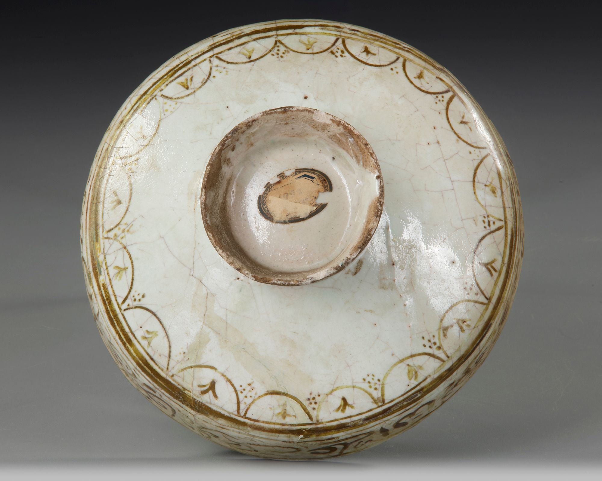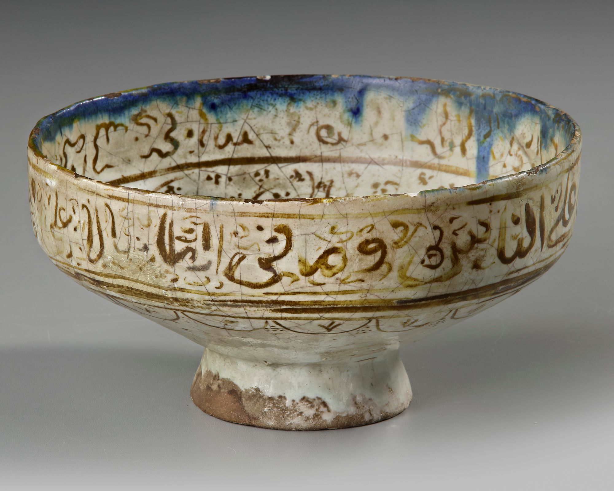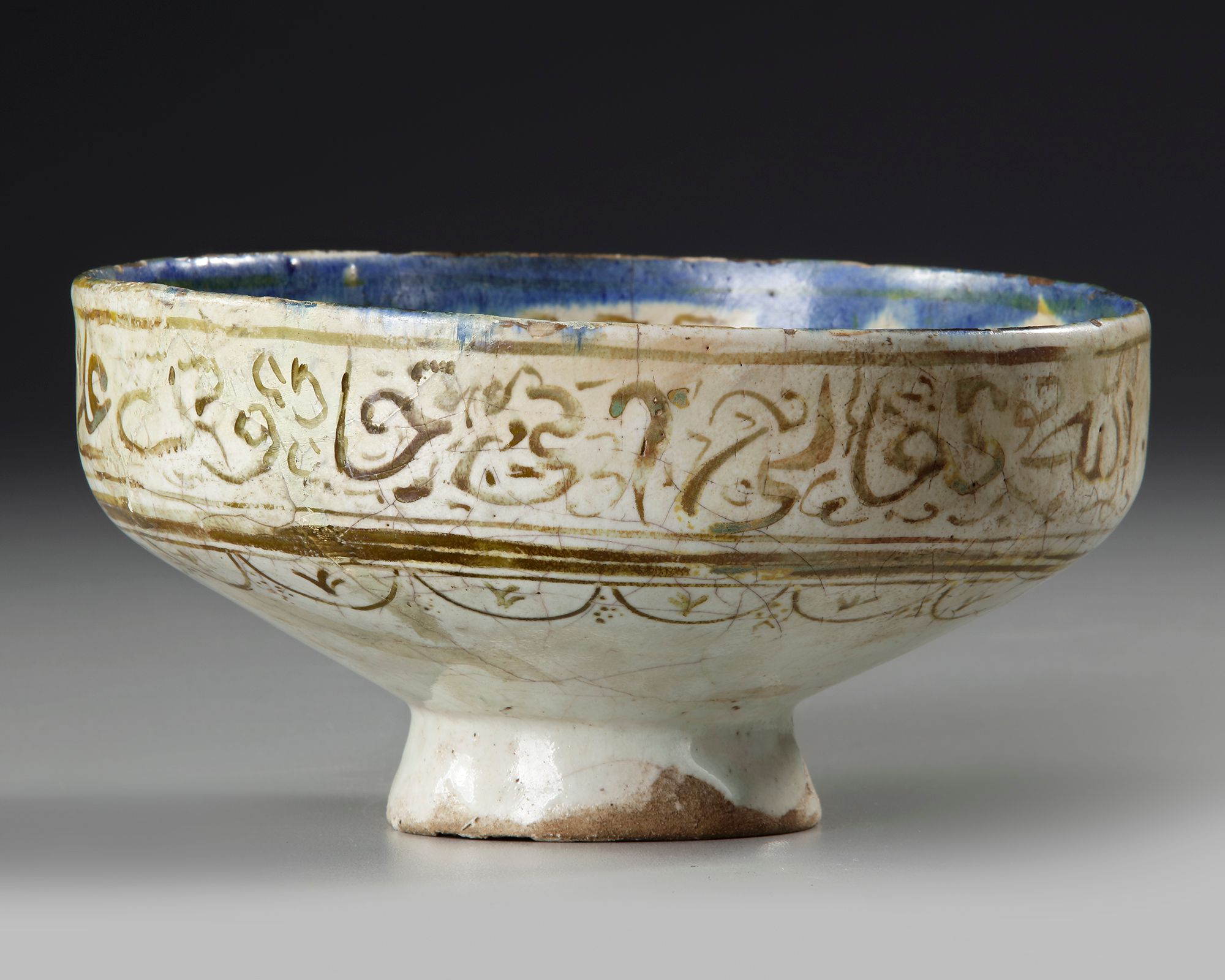 A ceramic bowl with a carinated body and pedestal base, decorated in metallic lustre and cobalt blue. The interior shows a central male figure flanked by two haloed women, surrounded by a pseudo-epigraphic frieze. The bowl blends figurative art with Islamic ornamental design.