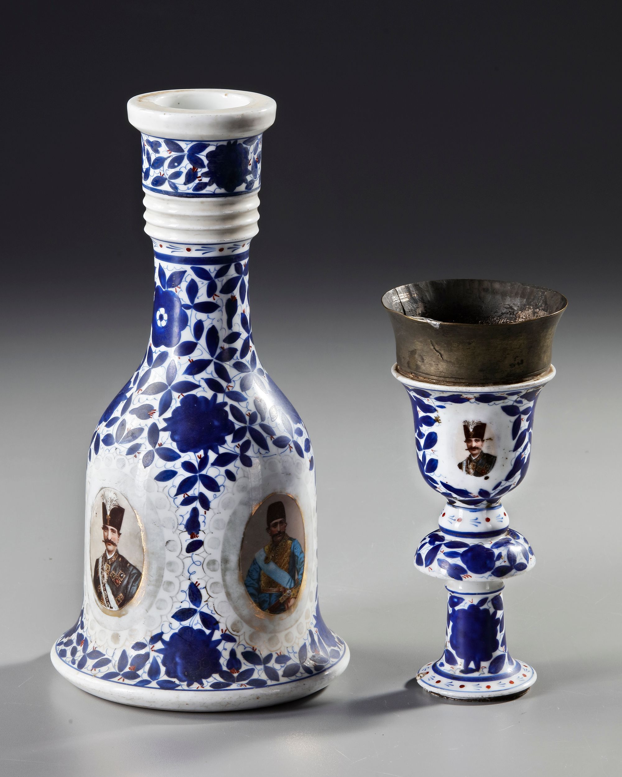 Porcelain Qalyan with blue floral motifs and portrait medallions of Naser al-Din Shah and Mozaffar al-Din Shah Qajar. Includes metal-topped stove. H. base: 26.5 cm; stove: 15 cm. Minor wear and oxidation.