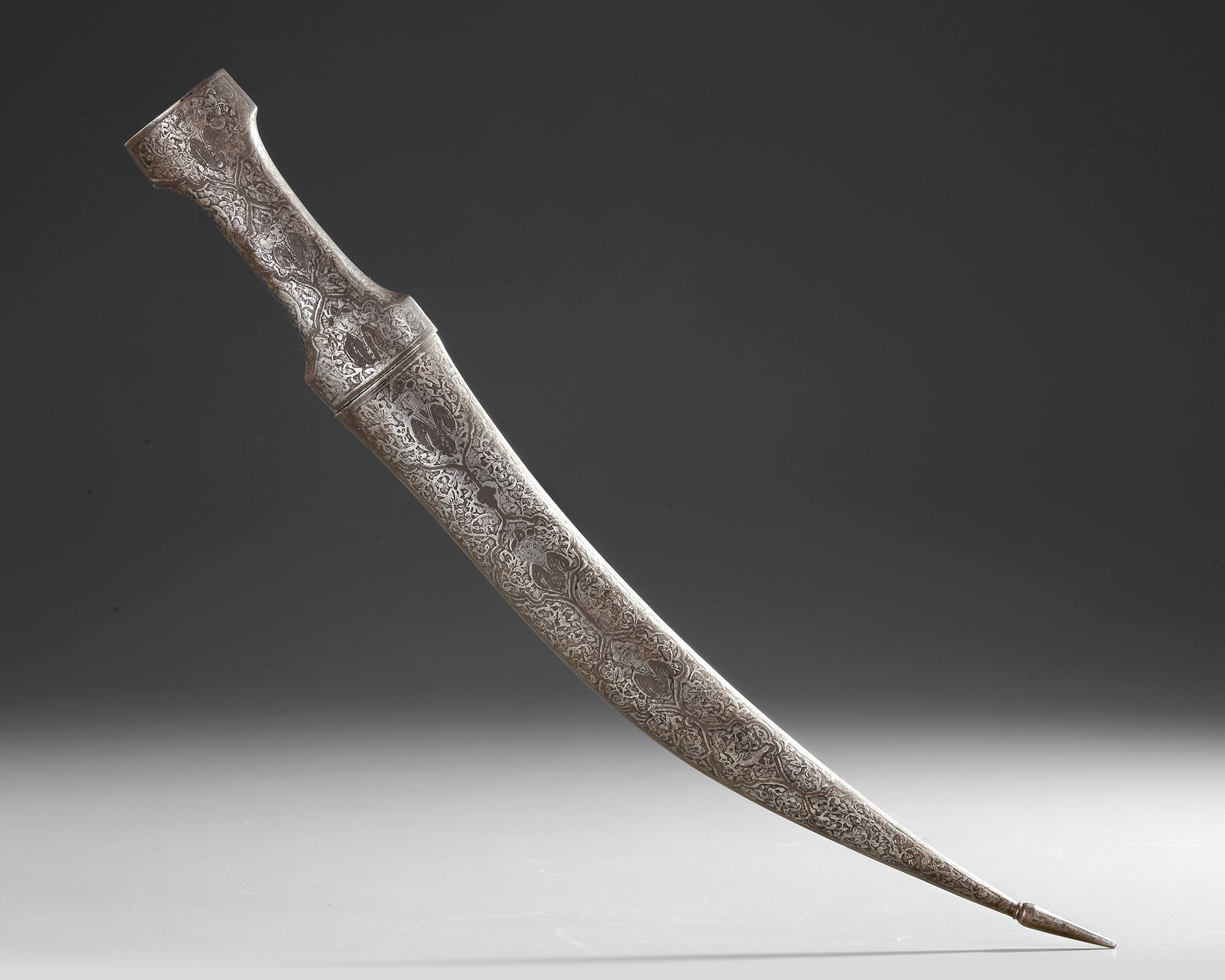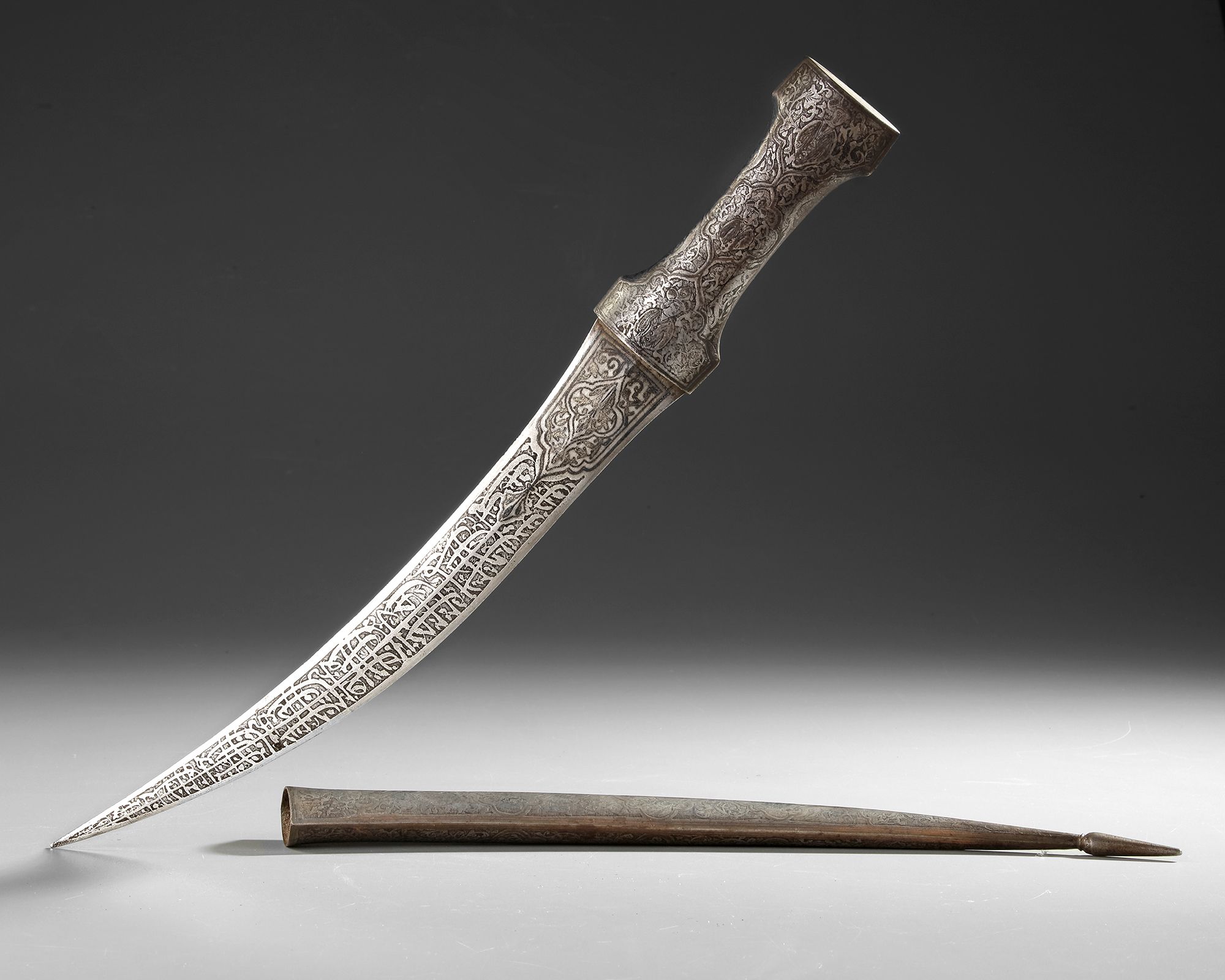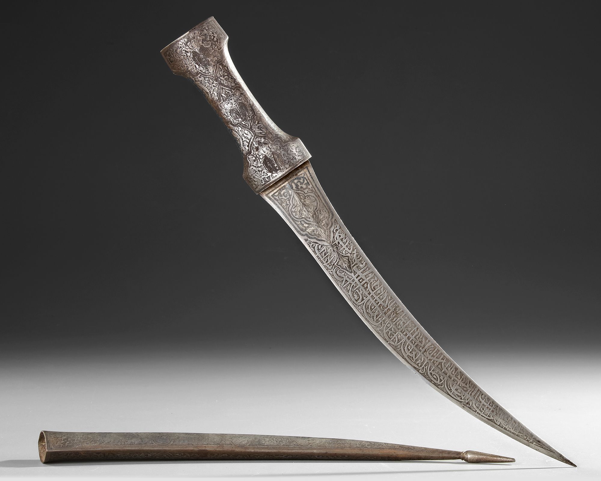 A Persian silver-inlaid steel dagger with a curved, double-edged blade of watered steel, adorned with engraved Persian inscriptions in nastaʿlīq script. The hilt and the sheath are embellished with cartouches enclosing seated figures and intricate floral motifs.