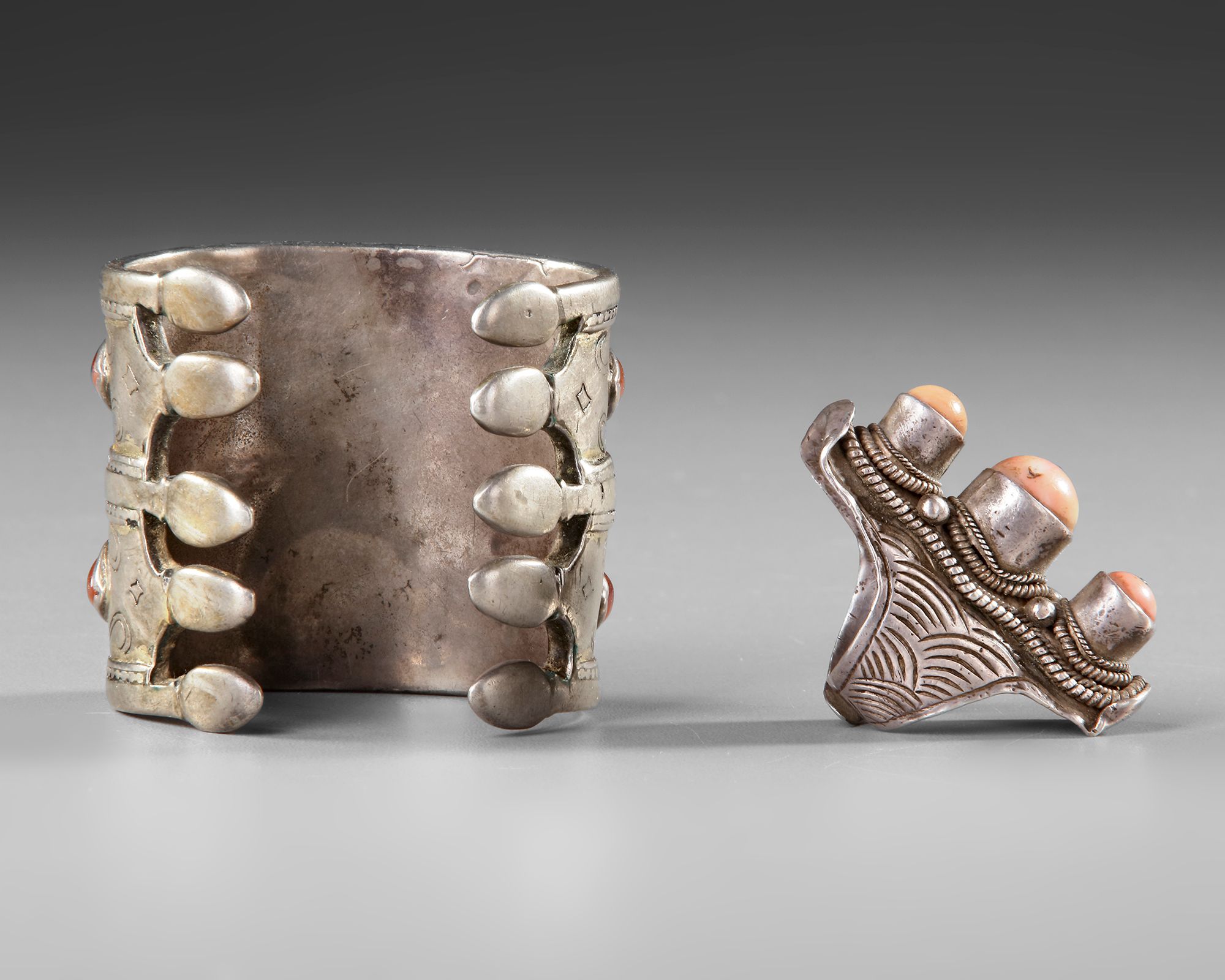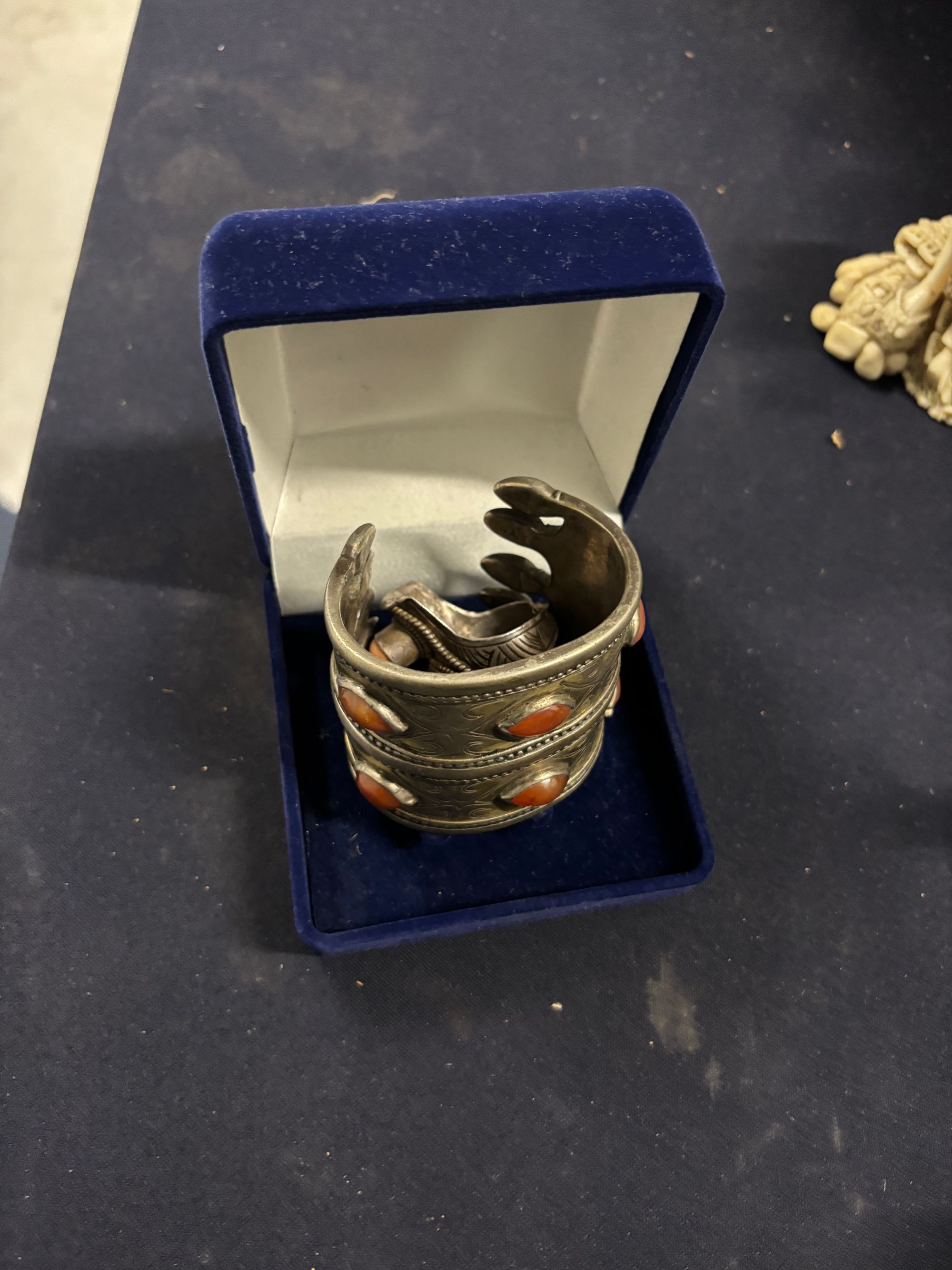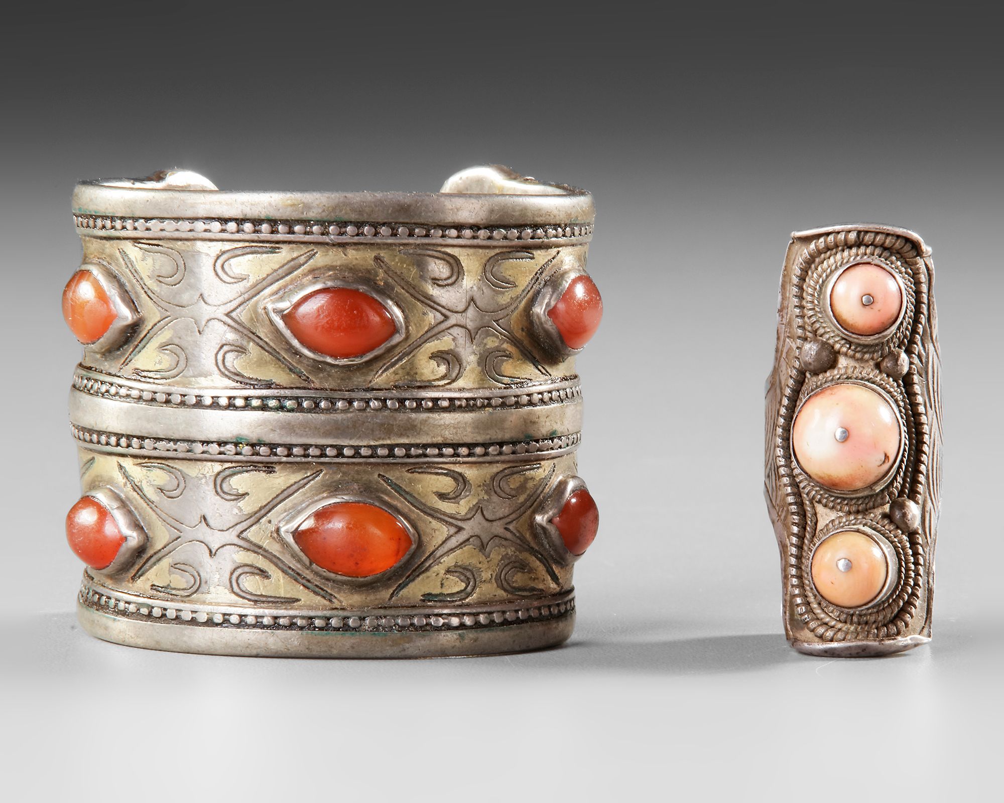 A Turkmen silver cuff bracelet with double row and set with carnelian gemstones.