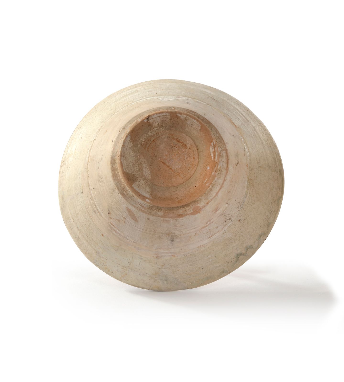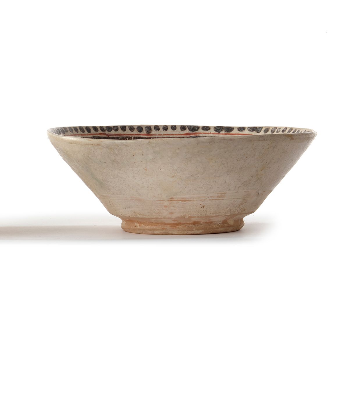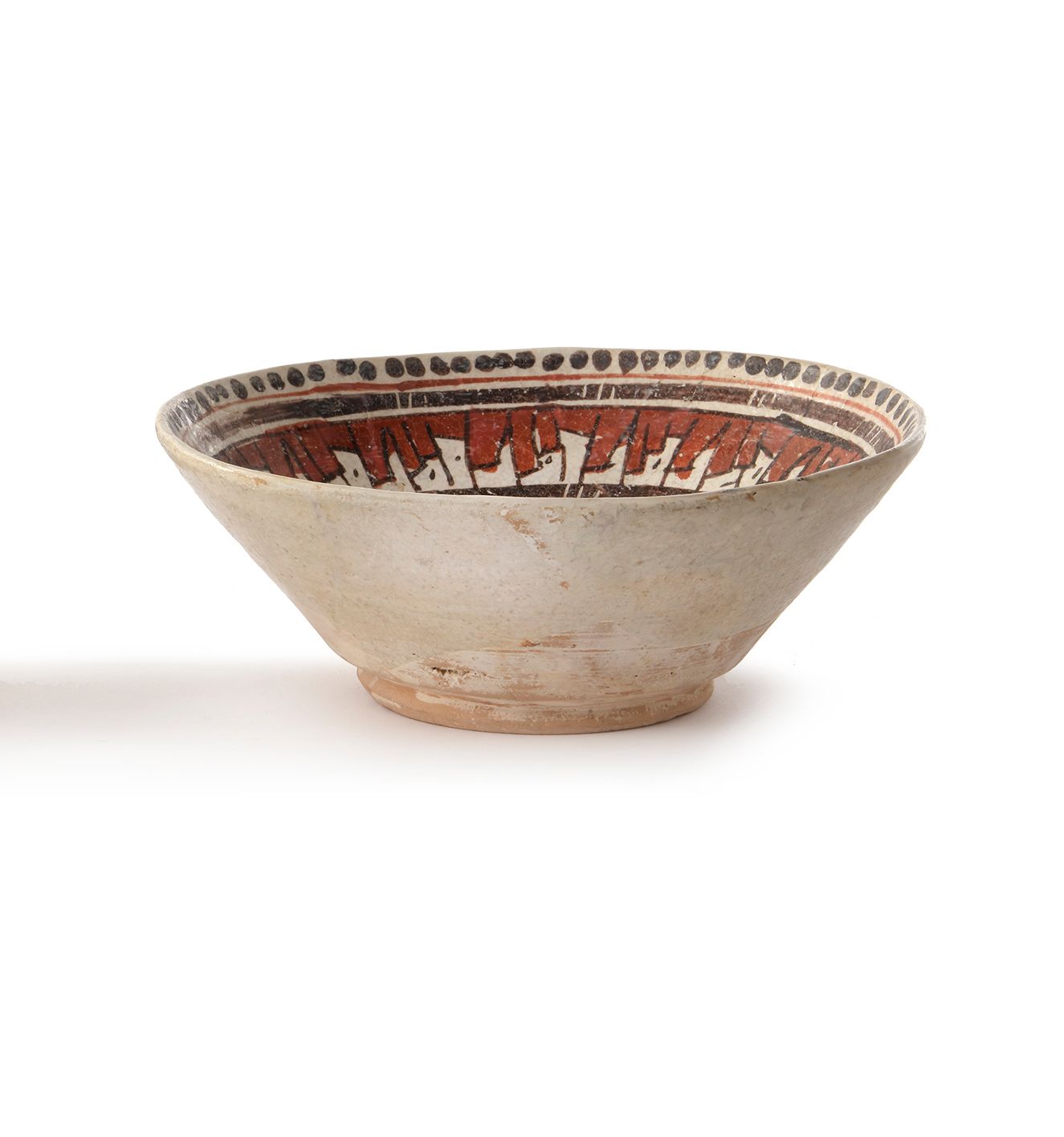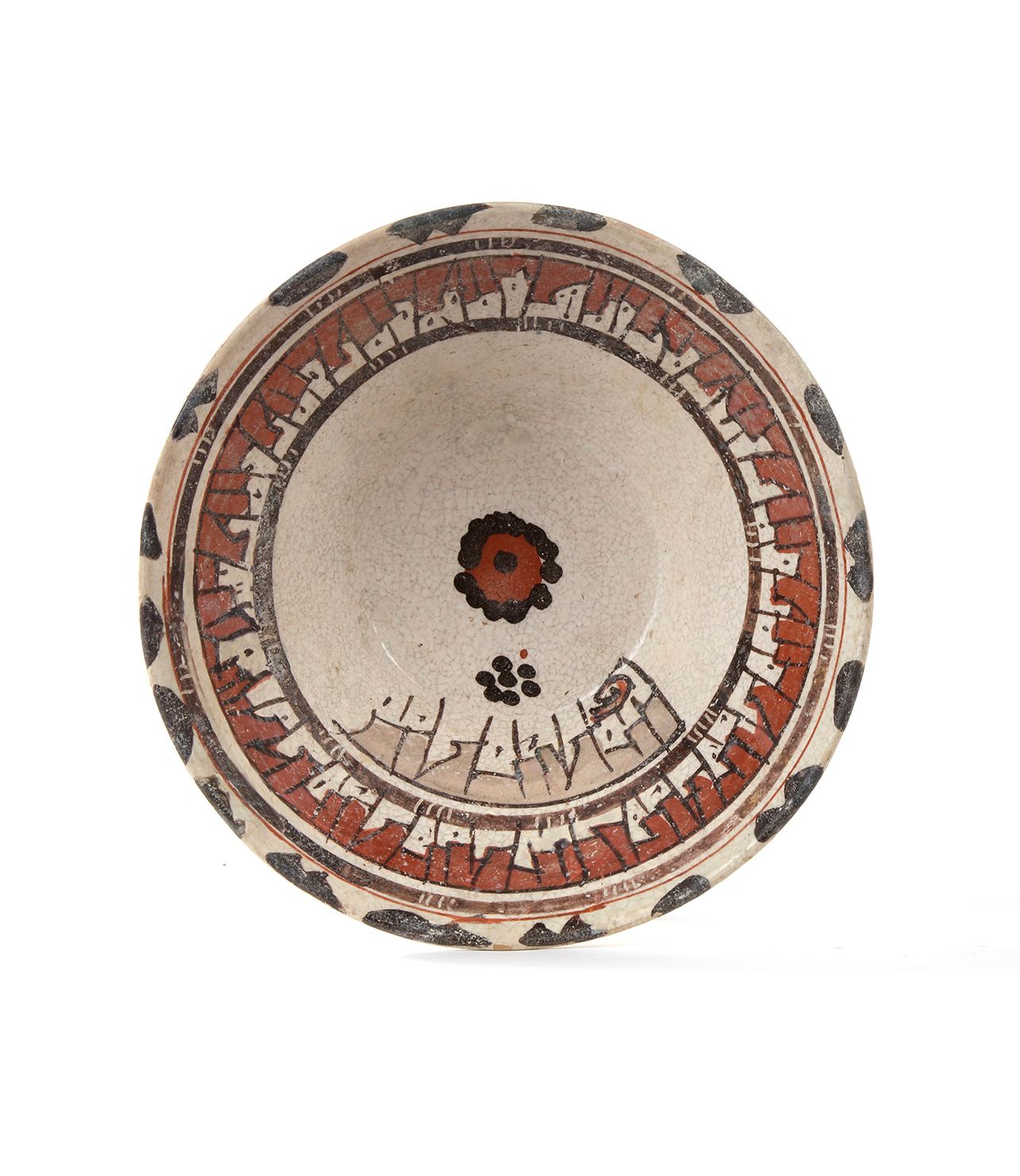 With flaring sides, decorated in manganese-brown and red on a cream ground with a band of Kufic inscription around the sides, one side with a further band of inscription, the rosette in the middle, the rim with a dotted border.