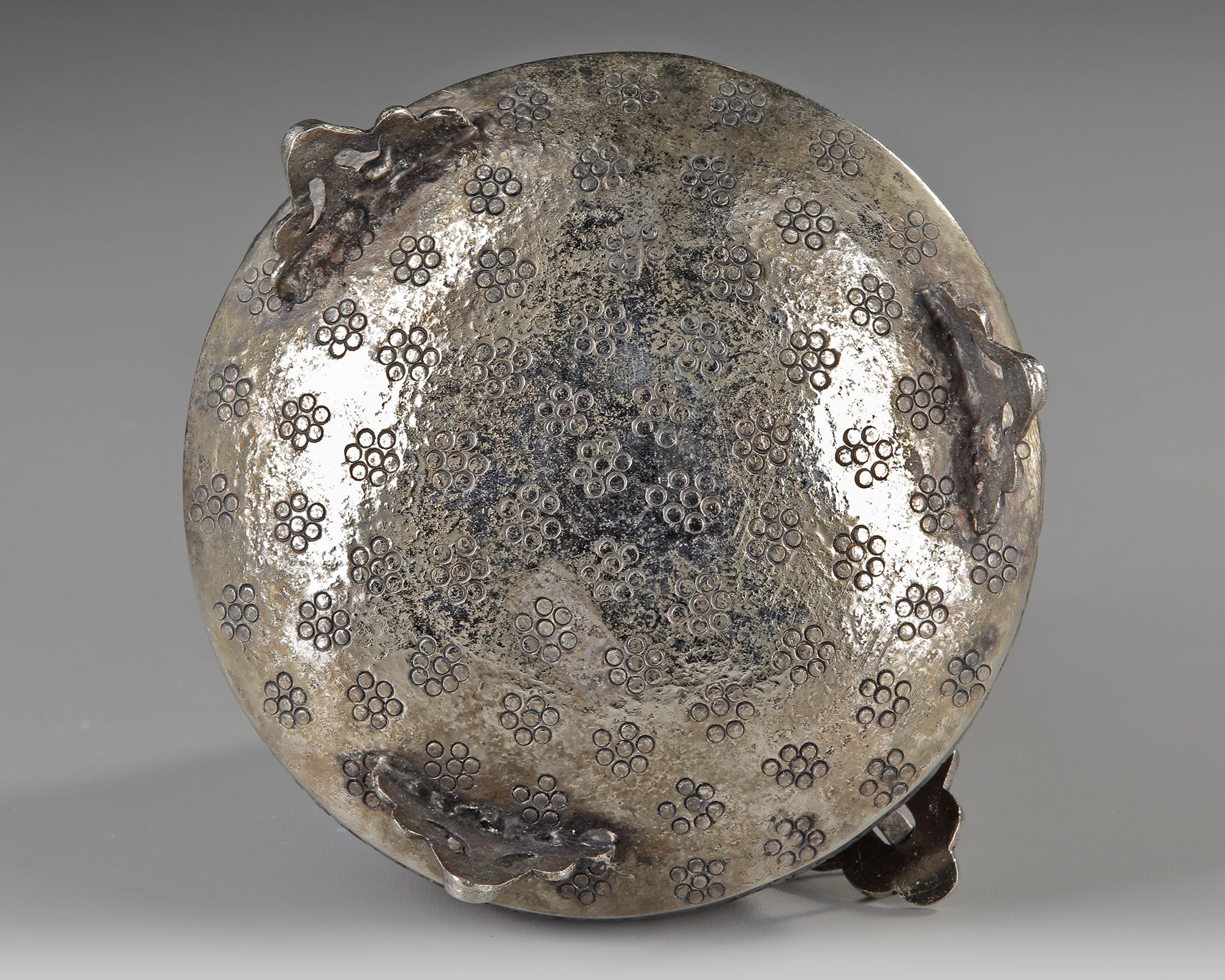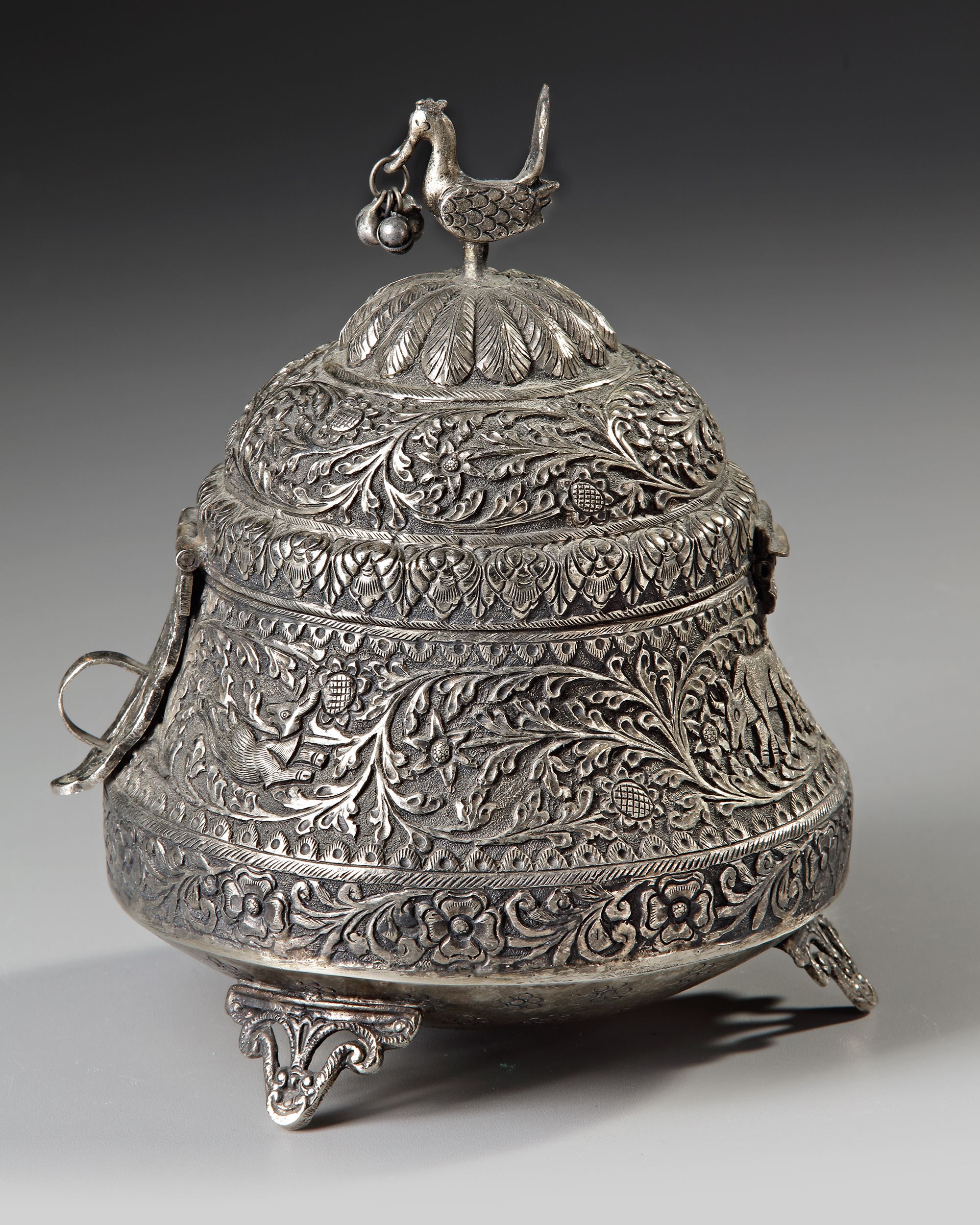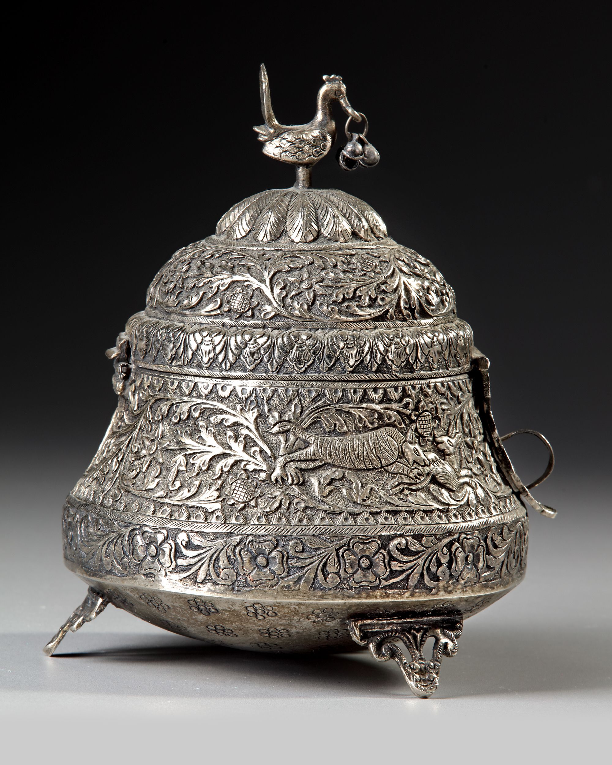 A silver incense burner with waisted body and hinged domed lid on three feet, decorated in repoussé with animals amongst foliage.