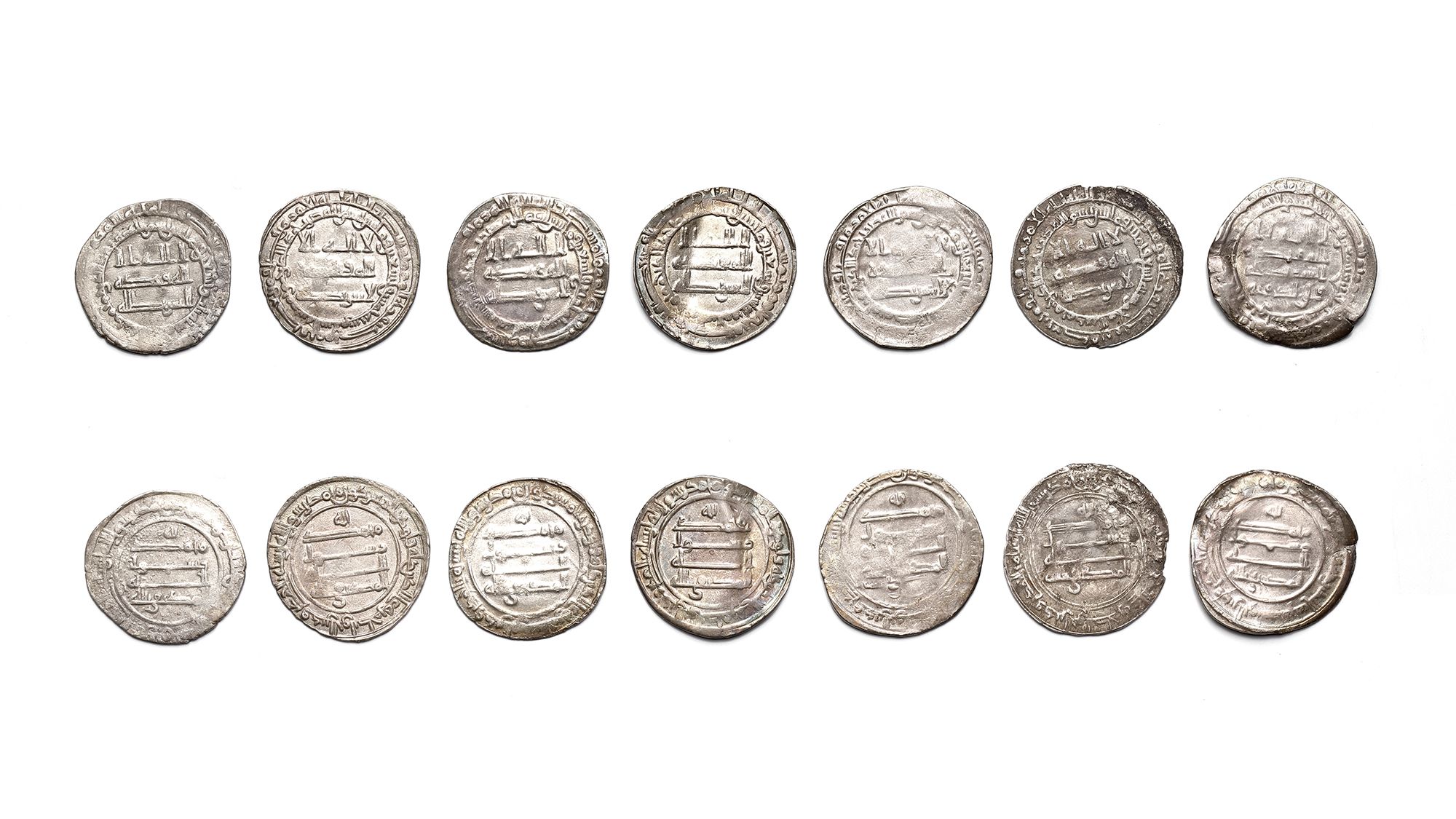 Seven silver dirhams, struck in different cities across during the reign of al-Muktafi A silver dirham, Madinat al-Salam mint, dated 289AH/ 901AD, 2.6g, 24mm. A silver dirham, al-Muhammadiya mint, dated 290AH/ 902AD, 4.1g, 23mm. A silver dirham, Wasit mint, dated 291AH/ 903AD, 3.7g, 23mm. A silver dirhams, Madinat al-Salam mint, dated 292AH/ 904AD, 2.9g, 22mm. A silver dirham, Madinat al-Salam mint, dated 293AH/ 905AD, 2.8g, 23mm. A silver dirham, Madinat al-Salam mint, dated 294AH/ 906AD, 2.5g, 24mm. A silver dirham, Madinat al-Salam mint, dated 295AH/ 907AD, 2.6g, 23mm.