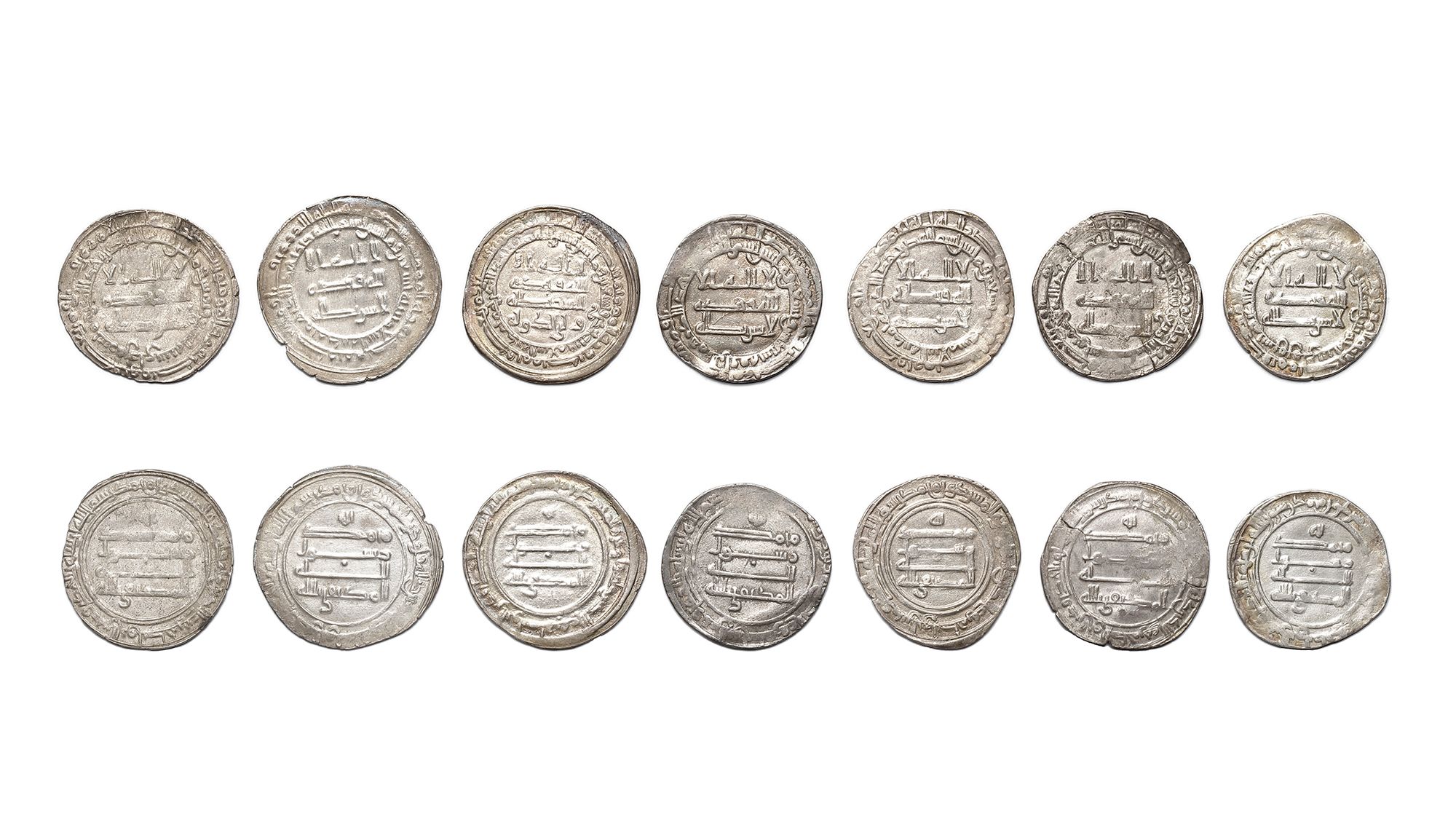 Seven silver dirhams, struck in different cities across during the reign of al-Muktafi A silver dirham, Surra manraa mint, dated 289AH/ 901AD, 2.8g, 24mm. A silver dirham, Madinat al-Salam mint, dated 290AH/ 902AD, 3.0g, 24mm. A silver dirham, (with vizier)Madinat al-Salam mint, dated 291AH/ 903AD, 2.9g, 23mm. A silver dirhams, al-Rafiqa mint, dated 292AH/ 904AD, 2.8g, 22mm. A silver dirham, Madinat al-Salam mint, dated 293AH/ 905AD, 3.0g, 23mm. A silver dirham, Wasit mint, dated 294AH/ 906AD, 2.6g, 22mm. A silver dirham, Surra manraa mint, dated 295AH/ 907AD, 2.8g, 21mm.